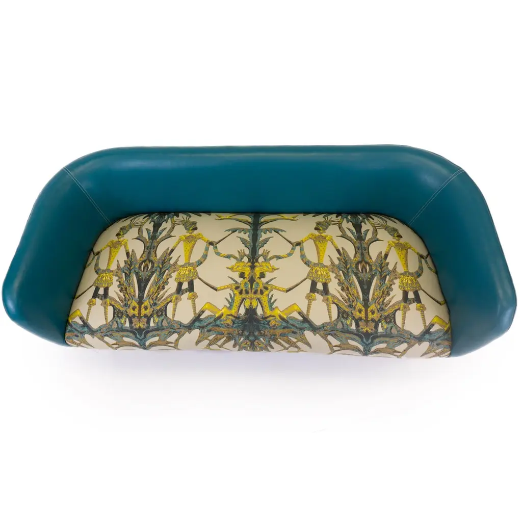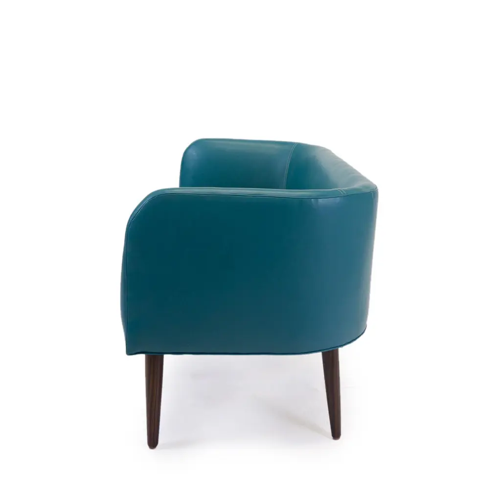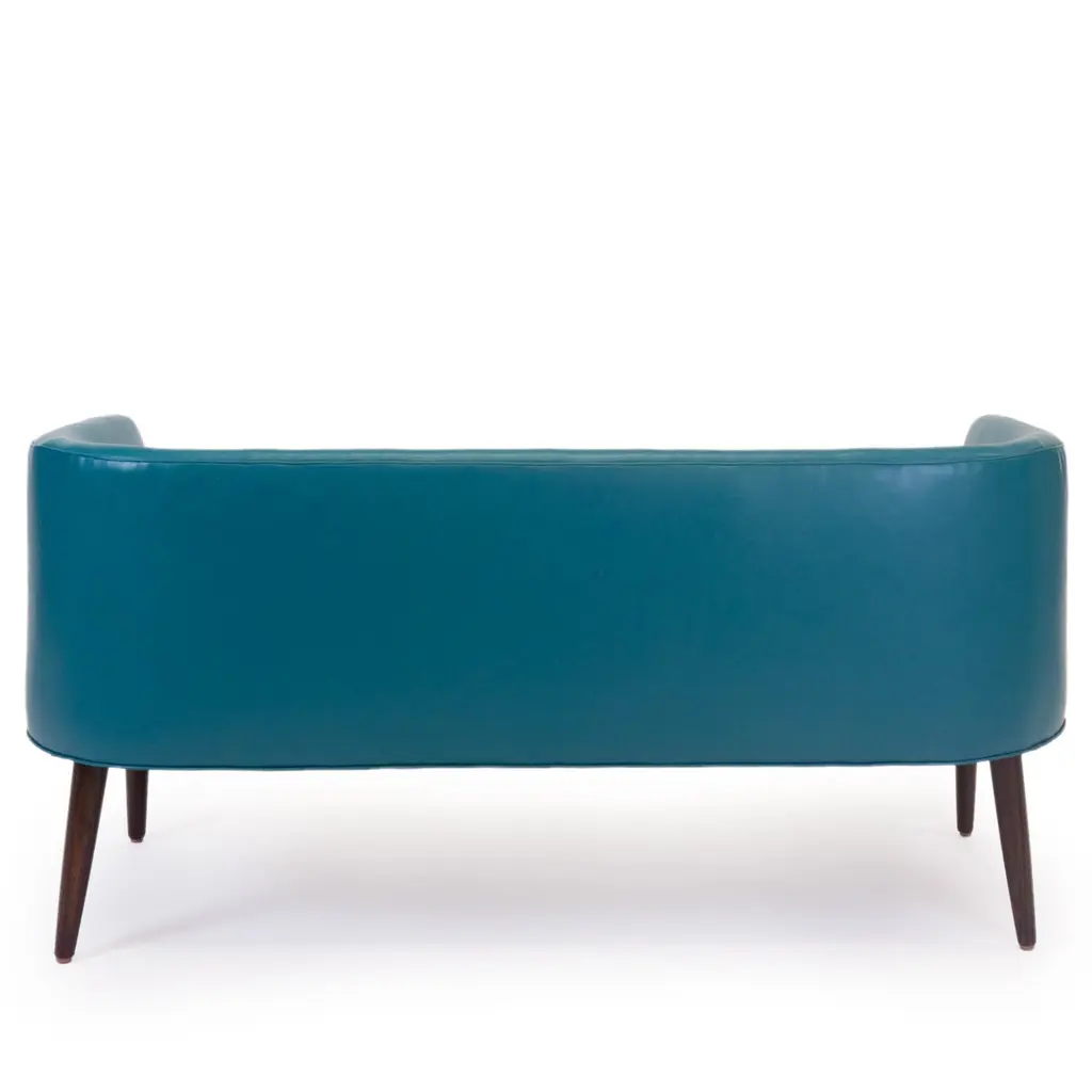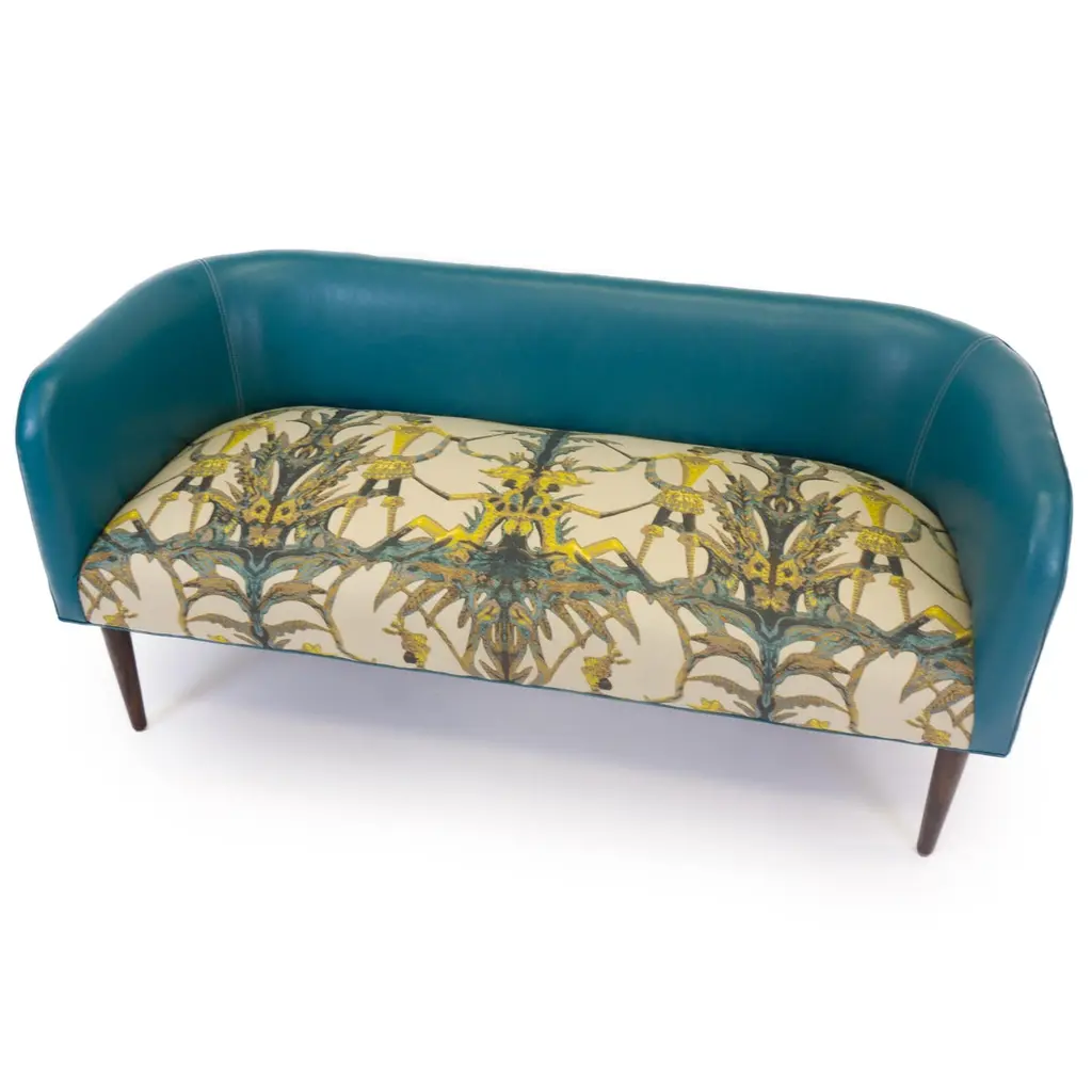 Petite banquette/bench made of solid hard maple is inspired by Mid-Century Modern design. The tight seat bench made with a high density cushion, sitting atop 8-way hand tied springs, features colorful combinations of fabrics. The back is upholstered in a blue vinyl set against a contrasting yellow and gold printed linen with a camel colored ground by Jim Thompson on the seat. The tapered wooden legs are dark carbon finish. This piece can be customized in size, fabric and wood finish. Measurements:Overall: 51”W x 22”D x 24”HInside: 46”W x 18”D x 8”HSeat height: 16"Price As Shown: $3,310 eachCOM Price: $2,860 eachCustomization may change price.How We Work:Made to order by Connecticut-based furniture design and manufacturing company The Tailored Home. Submit your customization desires by 1stdibs messenger for a quote. After orders are placed our workshop manager creates a visual work order for your approval for quality assurance.Customization Options:Dimensions can be customized. Ask for details.The fabric shown may come in more colors. We also carry thousands of other materials and can send you samples and fabric pricing upon request. We accept your fabric for a COM fee of 5% of the cost of the piece. Welting, piping, tape, or trim can be added. Different species are available for pieces with exposed wood and can be painted & lacquered in any Benjamin Moore color (for an additional charge) or stained in one of our stain options. Custom color matches cost $75 per sample.We accept inspiration photos of pieces you like.2021 - Made to OrderThis piece can be made as is or custom-made with the customer’s choice of materials and size adjustments.9-10 weeks