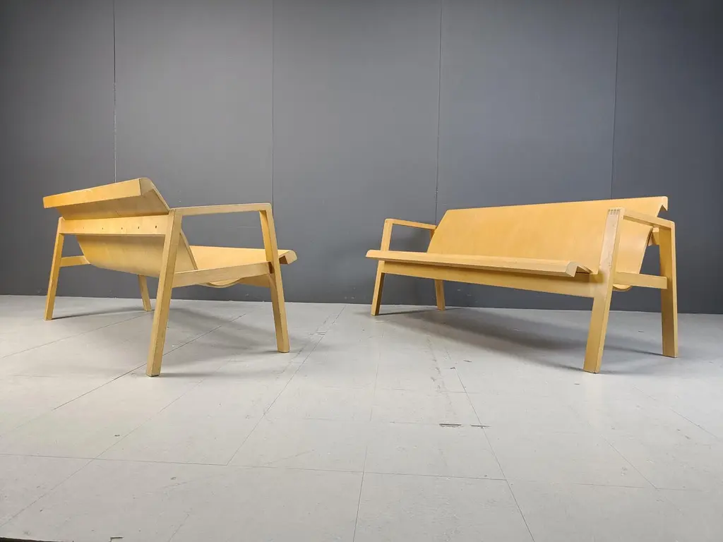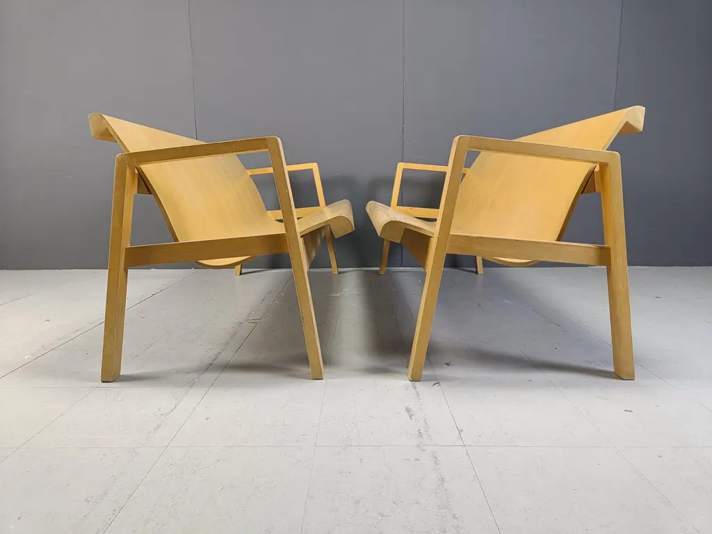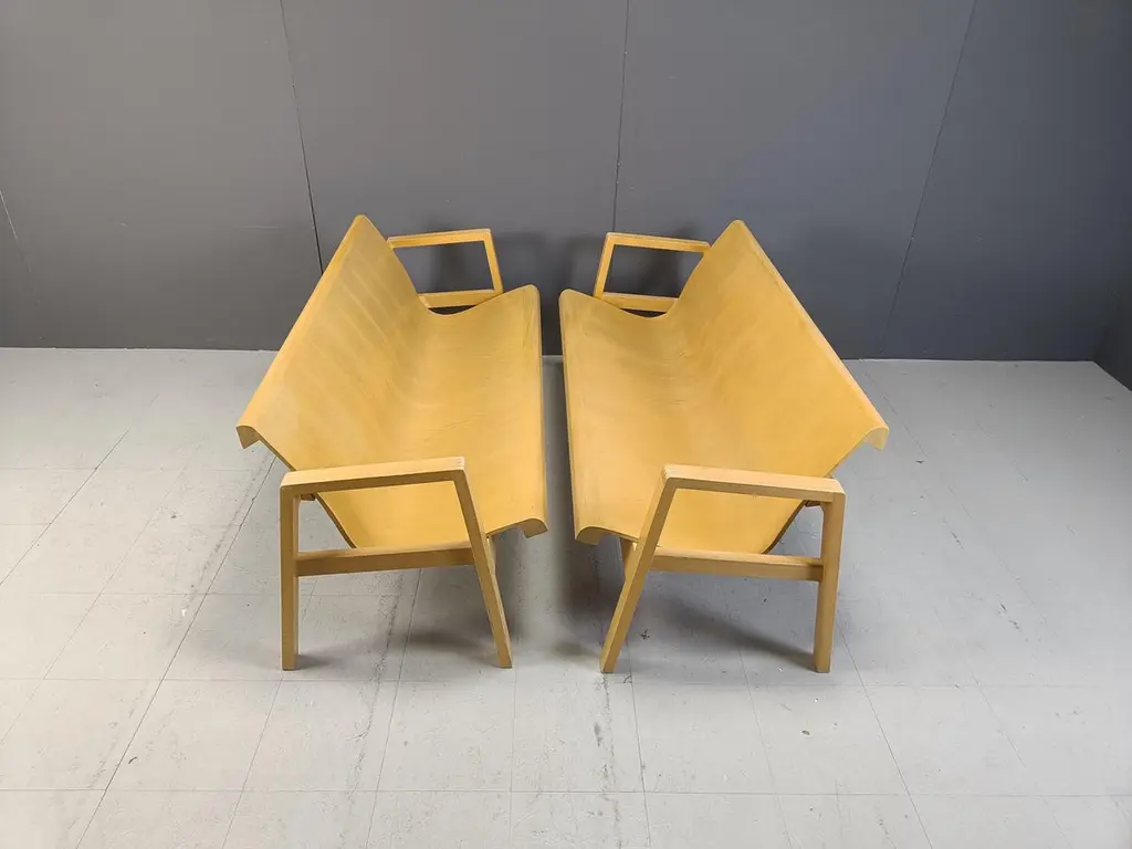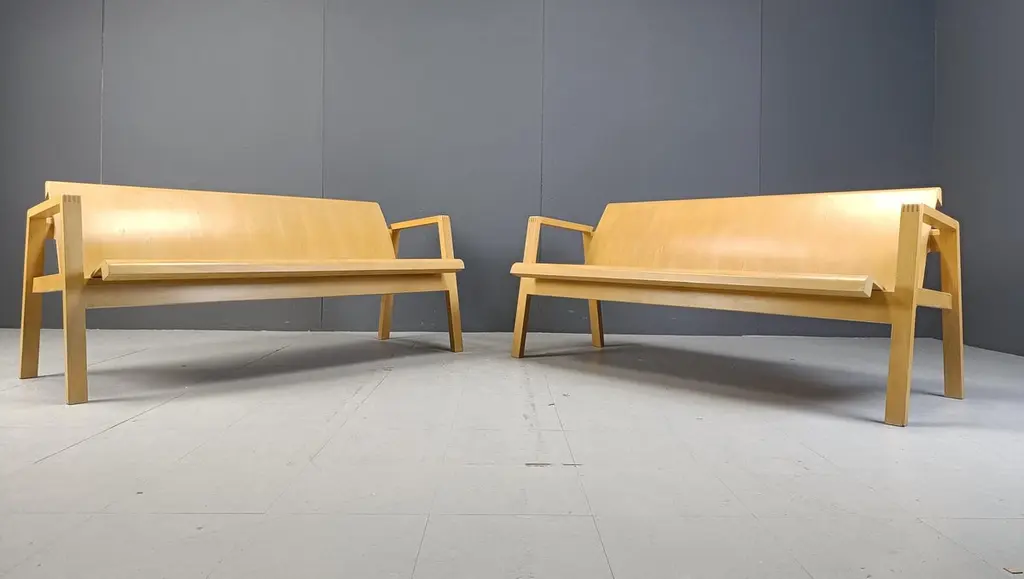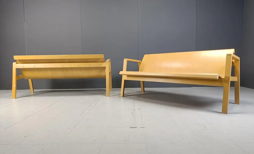 This pair of mid century benches are made out of plywood curved seats and a wooden base.The design is much like the Alvar Aalto 51/403 chair produced by Artek.We cant confirm this is 100% a design by Alvar Aalto, so we will respectfully attribute it to him.We salvaged these benches from a restaurant.1960s - Finland (Not confirmed)Good condition with nice age related wearDimensions:Height: 75cmWidth: 164cmDepth: 70cmSeat height: 42cmRef.: 241108012Images are aways part of the descriptionPrice is for the pair, 3 pairs available, also for sale per piece, contact us directly.