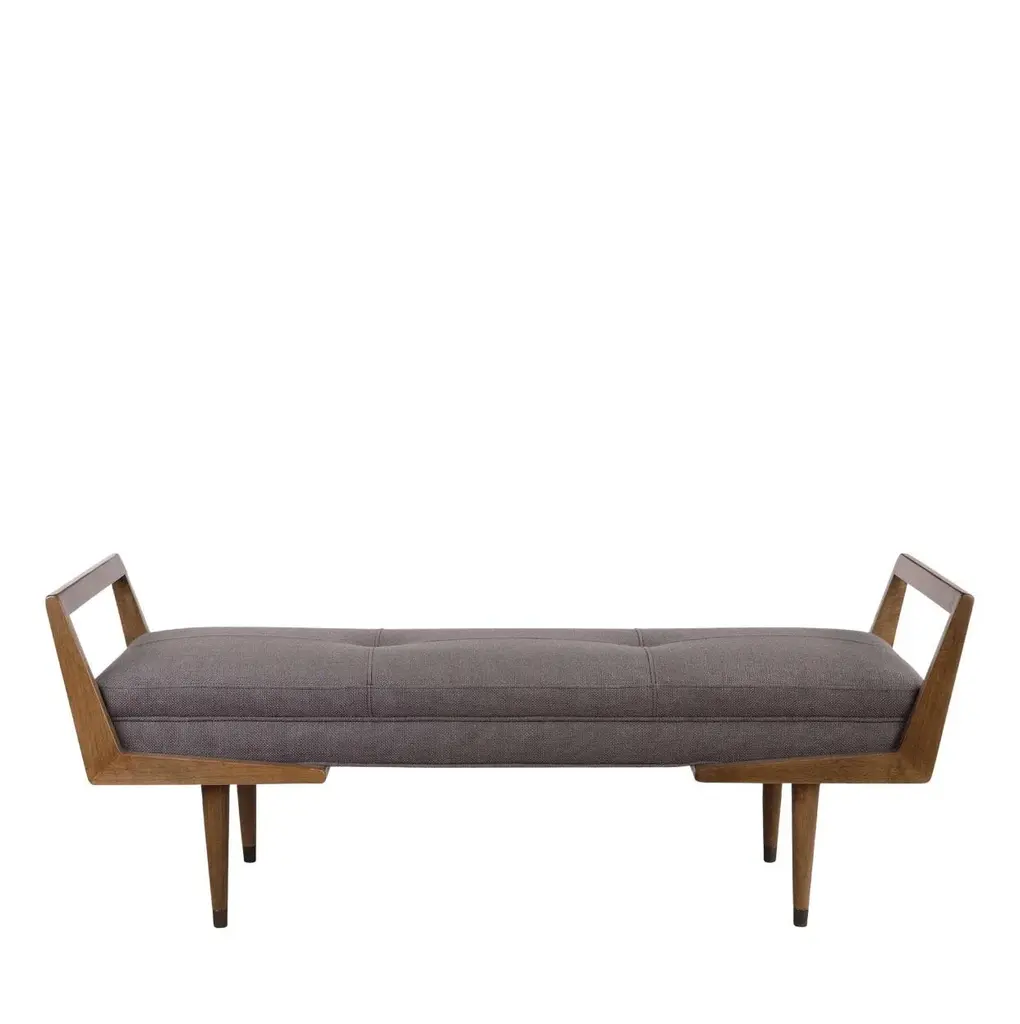 A classic bench with a tufted seat in a woven taupe gray fabric; great mid-century modern styling; features a modern birch wood frame. Adds class to any setting Seat Height 18" 59”W X 23”H X 20”D Ships Freight
