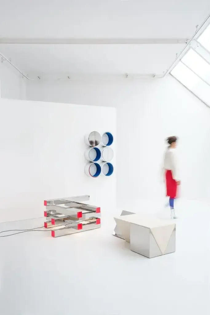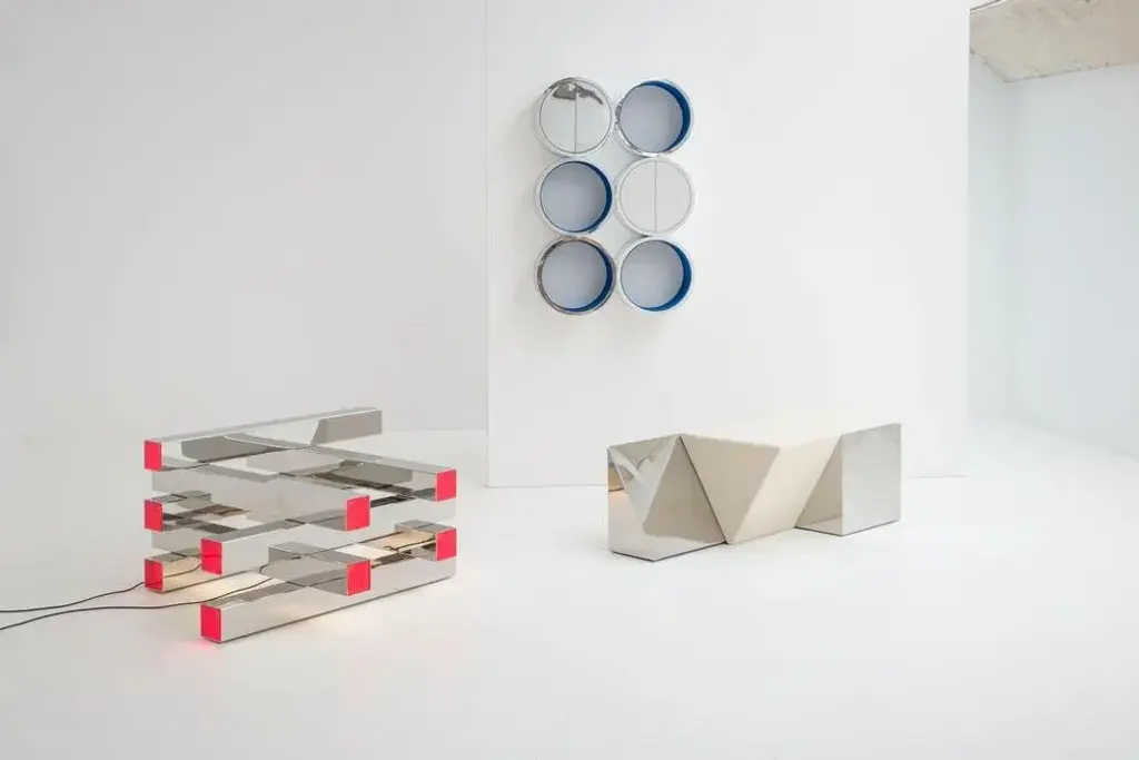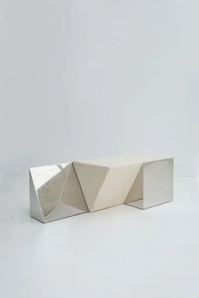 Miljevina bench by Nortstudio Dimensions: 40 x 120 x 46 cm Materials: Mirror polished steel, mirror-look HPL. Three abandoned buildings with a strong geometrical character were the inspiration behind a new collection of sculptural objects. After being abandoned and stripped of ornaments, the pure architectural structure of these buildings becomes even more visible. Each object has its own purified design following the geometrical structure of a building. Over time abandoned buildings seem to adapt to the surroundings, just like these objects adjust and interact with the surrounding context through the use of reflecting materials. Mirror-look material and polished steel suggest infinity, whereas the existence of an abandoned building seems finite. The triangular seating is not permanently connected. It can be positioned as desired.