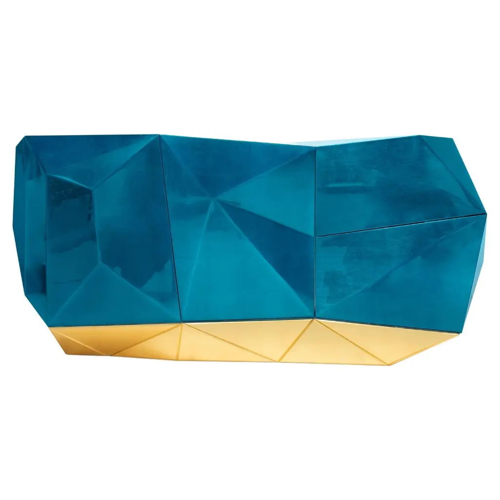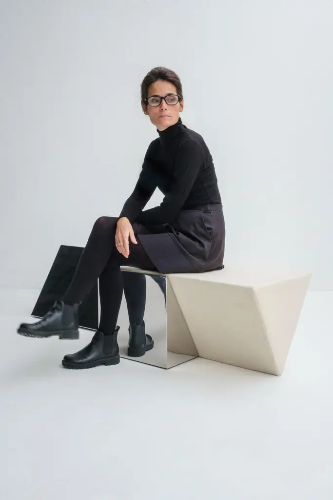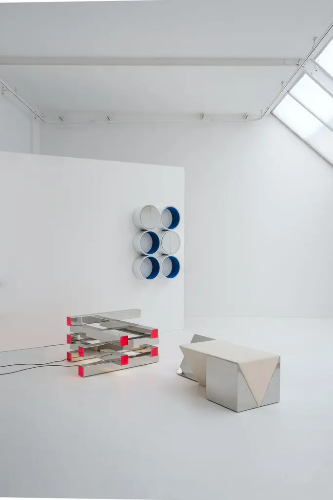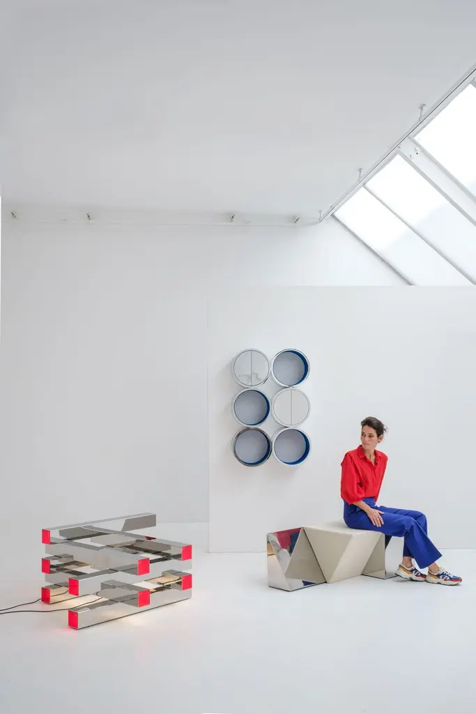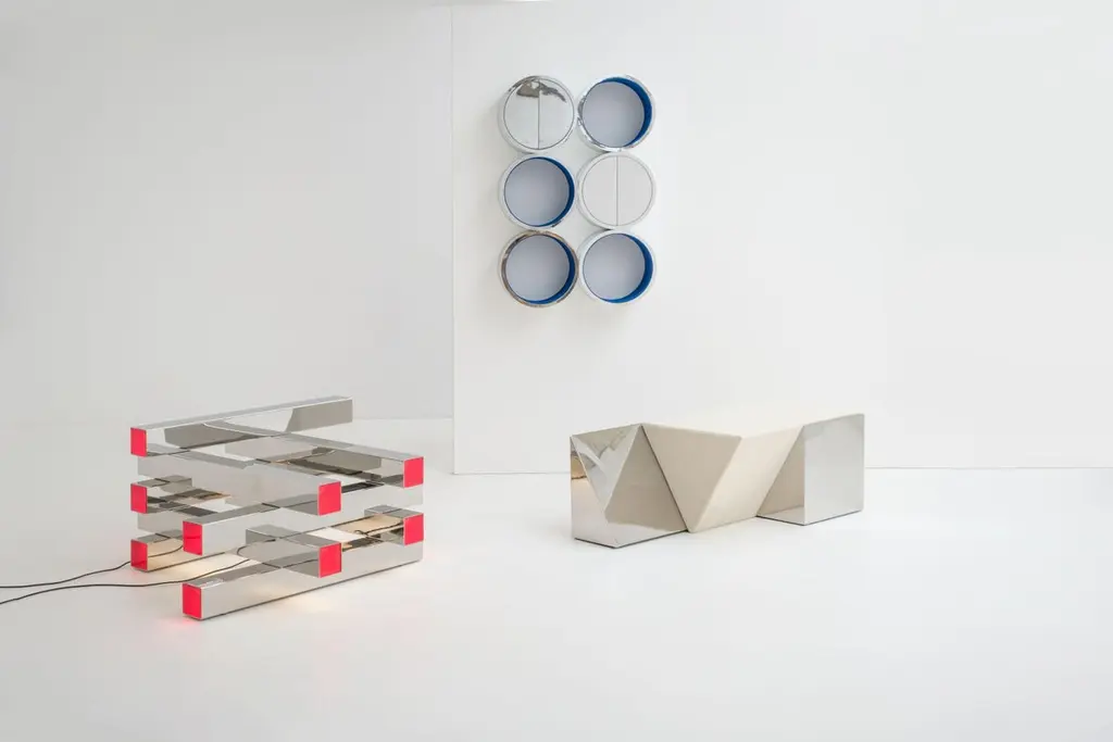 Miljevina bench by NortstudioDimensions: 40 x 120 x 46 cmMaterials: Mirror polished steel, mirror-look HPL.Three abandoned buildings with a strong geometrical character were the inspiration behind a new collection of sculptural objects.After being abandoned and stripped of ornaments, the pure architectural structure of these buildings becomes even more visible. Each object has its own purified design following the geometrical structure of a building.Over time abandoned buildings seem to adapt to the surroundings, just like these objects adjust and interact with the surrounding context through the use of reflecting materials.Mirror-look material and polished steel suggest infinity, whereas the existence of an abandoned building seems finite.The triangular seating is not permanently connected. It can be positioned as desired.Nortstudio was founded by Jef De Brabander and Kathleen Opdenacker in 2016. The studio and workshop is based in Antwerp.After working on individual projects, they decided to team up and start working as a couple together. They immediately experienced the advantages of working as a couple. Complete trust, understanding each other and never blaming one another, made it right from the start.
