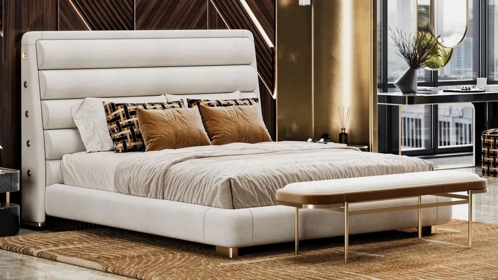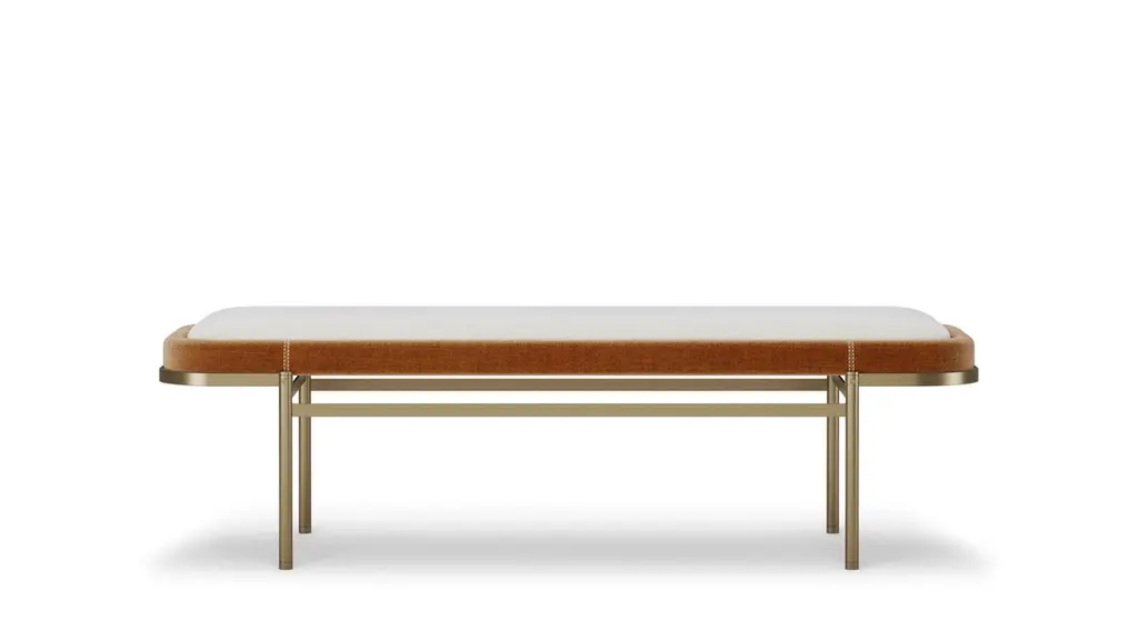 Klyne Bench is a refined study in contrasts,vivid yet restrained, minimal yet richly textured. Resting on four brushed metal legs, its clean architectural base creates a sense of lightness that perfectly balances the bench’s bold, two-tone upholstery. A warm orange fabric wraps the lower cushion and edges like a tailored frame, grounding the piece with vibrancy and depth. Above, a soft white seat panel offers a crisp, calming counterpoint, inviting both visual intrigue and tactile comfort.