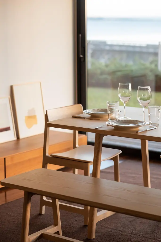 FRAME collection is the perfect trio for any gathering space. The collection includes a table, a chair and a bench, holding everything one needs for a cozy get together.Being a simple yet sculptural and self-explaining design, the collection is meant to resemble a craft feeling, an ode to classic wooden furniture and handcrafting. Inspired by the characteristics of Danish design, the collection impresses with its minimalistic shape and great attention to details. With simple but strong expression the FRAME pieces pay homage to the simple way of living culture and every step of it' s production is aligned with requirements of sustainability and quality at the same time.The bench has the same shape as the table. It can both be used with the table or separate, for sitting or as a long table for placing objects.