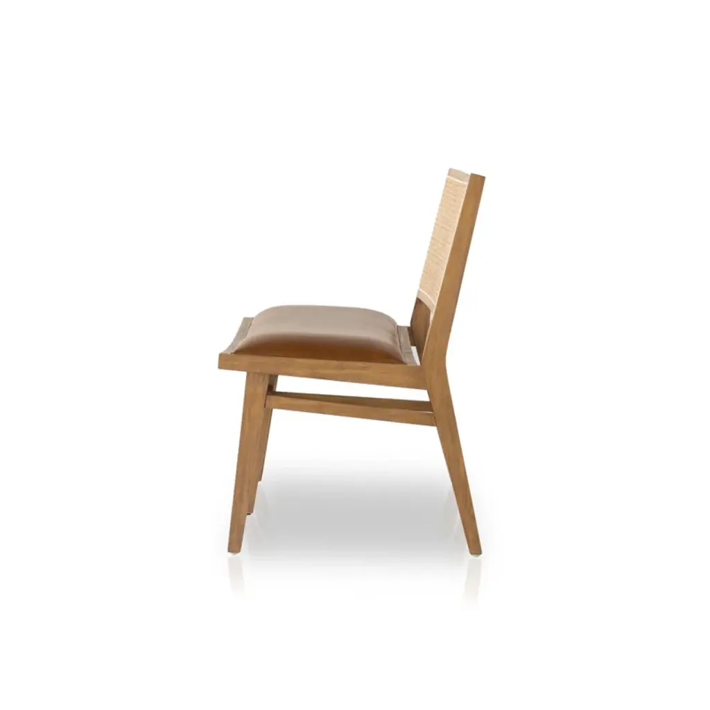 Mixed materials make the chair. Solid beech wood features a natural cane back for extra texture, while a butterscotch-finished faux leather seat serves total comfort.