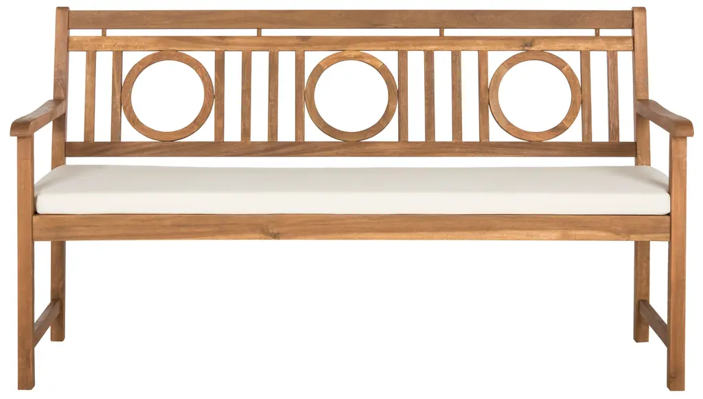 Inspired by furnishings used in the gardens of the great estates in the UK, this natural acacia wood 3 seat bench is a modern classic. it's circular geometric detail and plush cushion make it ideal for traditional or contemporary outdoor living. Store outdoor furniture indoors or cover well when not in use. Remove wooden furniture from standing water. Dust regularly with small brush or vacuum. Spills should be taken care of immediately before they harden or stain with a slightly dampened sponge. Do not use bleach solutions. Some assembly required.