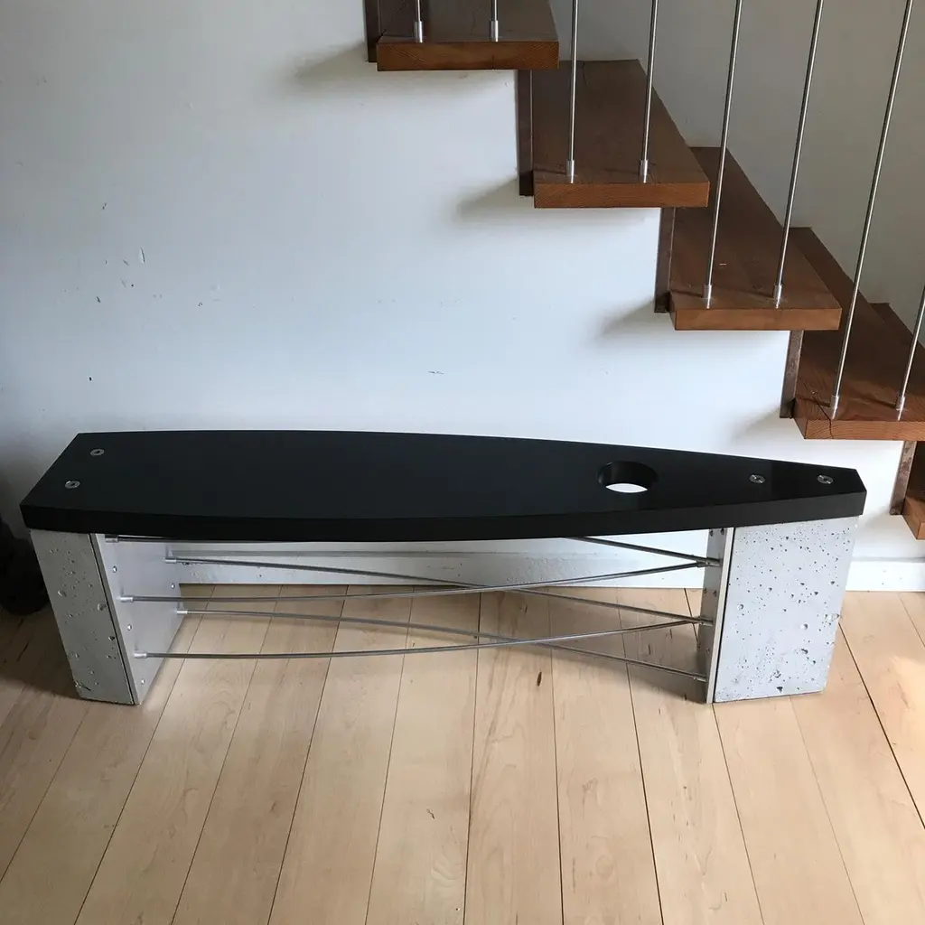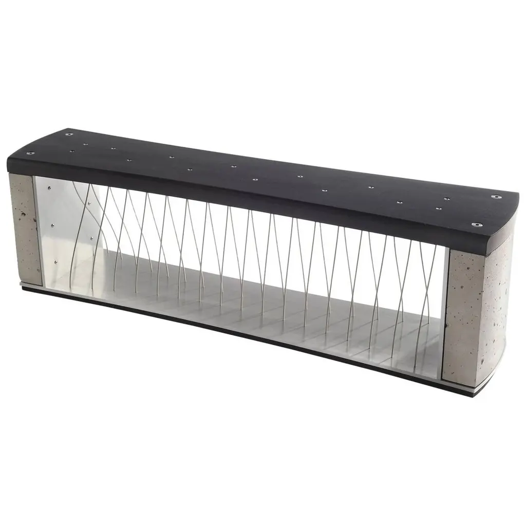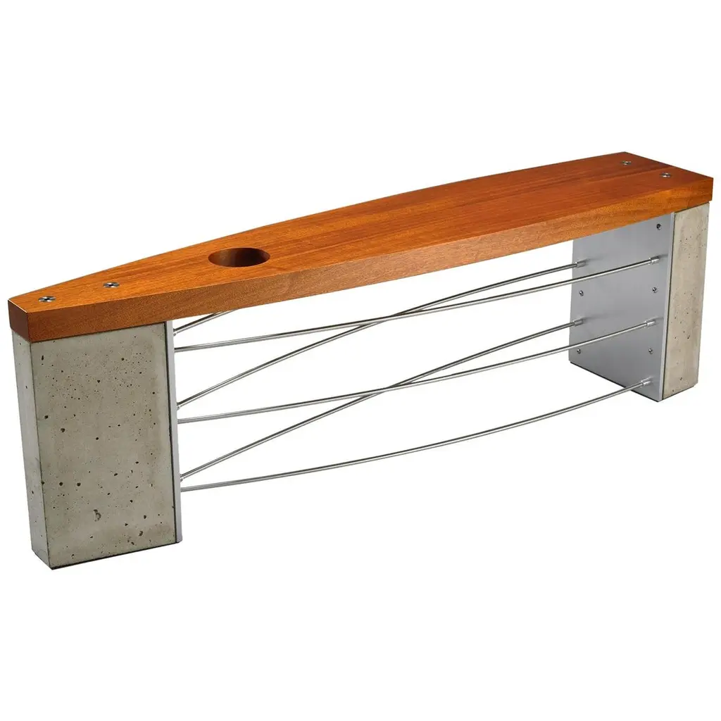 The Jupiter bench is elegantly constructed of concrete stainless steel, aluminium and mahogany. Its design has nautical references. The hole through the top centres over the crossing point of the gently curved stainless steel rods. Unorthodox concrete anchors the ends both visually and structurally. Polished exposed stainless steel fasteners punctuate this modern bench.This bench is 50.5" long. Also available in a 60" length as Jupiter XL- see my other listings. Jupiter will be made to order in your choice of woods or black dyed Mahogany. Also available in exterior versions.This bench is designed and handmade by Peter Harrison in his Upstate New York studio. This listing is studio direct. Please reach out with questions, I respond quickly!