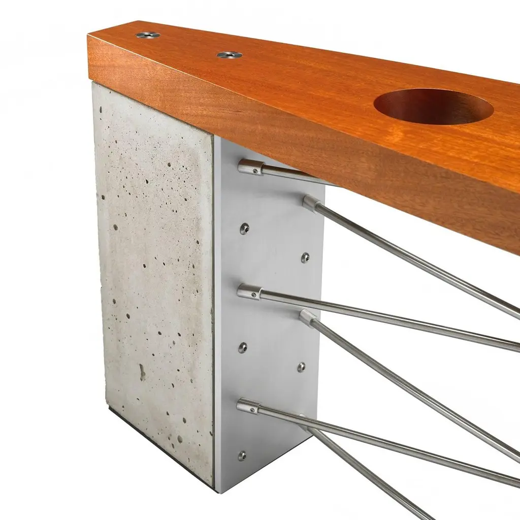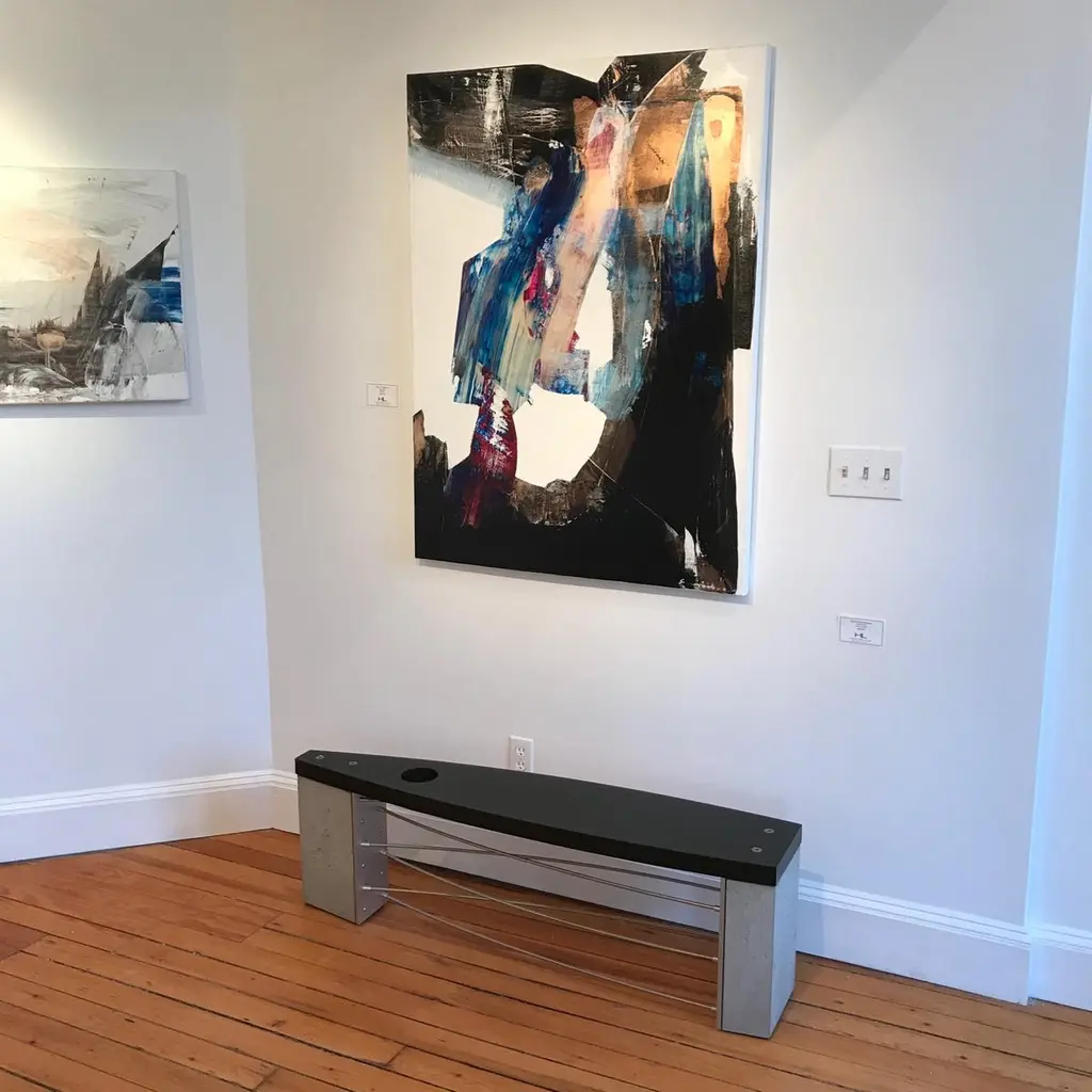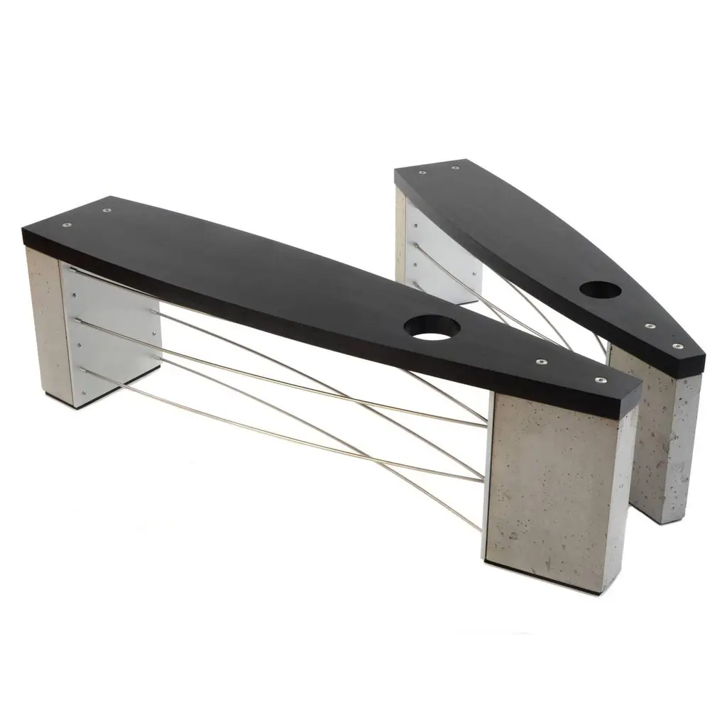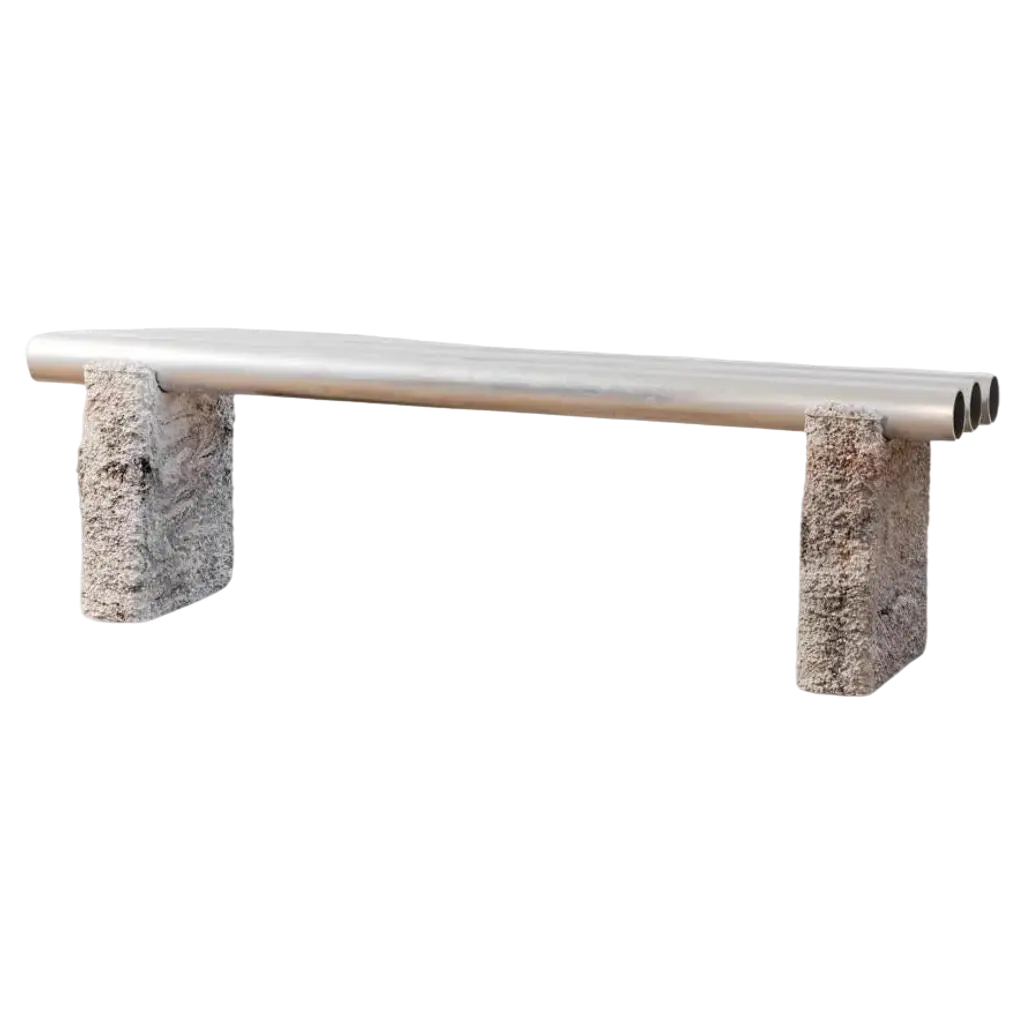 The Jupiter bench is elegantly constructed of concrete stainless steel, aluminium and mahogany. Its design has nautical references. The hole through the top centres over the crossing point of the gently curved stainless steel rods. Unorthodox concrete anchors the ends both visually and structurally. Polished exposed stainless steel fasteners punctuate this modern bench.This bench is 50.5" long. Also available in a 60" length as Jupiter XL- see my other listings. Jupiter will be made to order in your choice of woods or black dyed Mahogany. Also available in exterior versions.This bench is designed and handmade by Peter Harrison in his Upstate New York studio. This listing is studio direct. Please reach out with questions, I respond quickly!