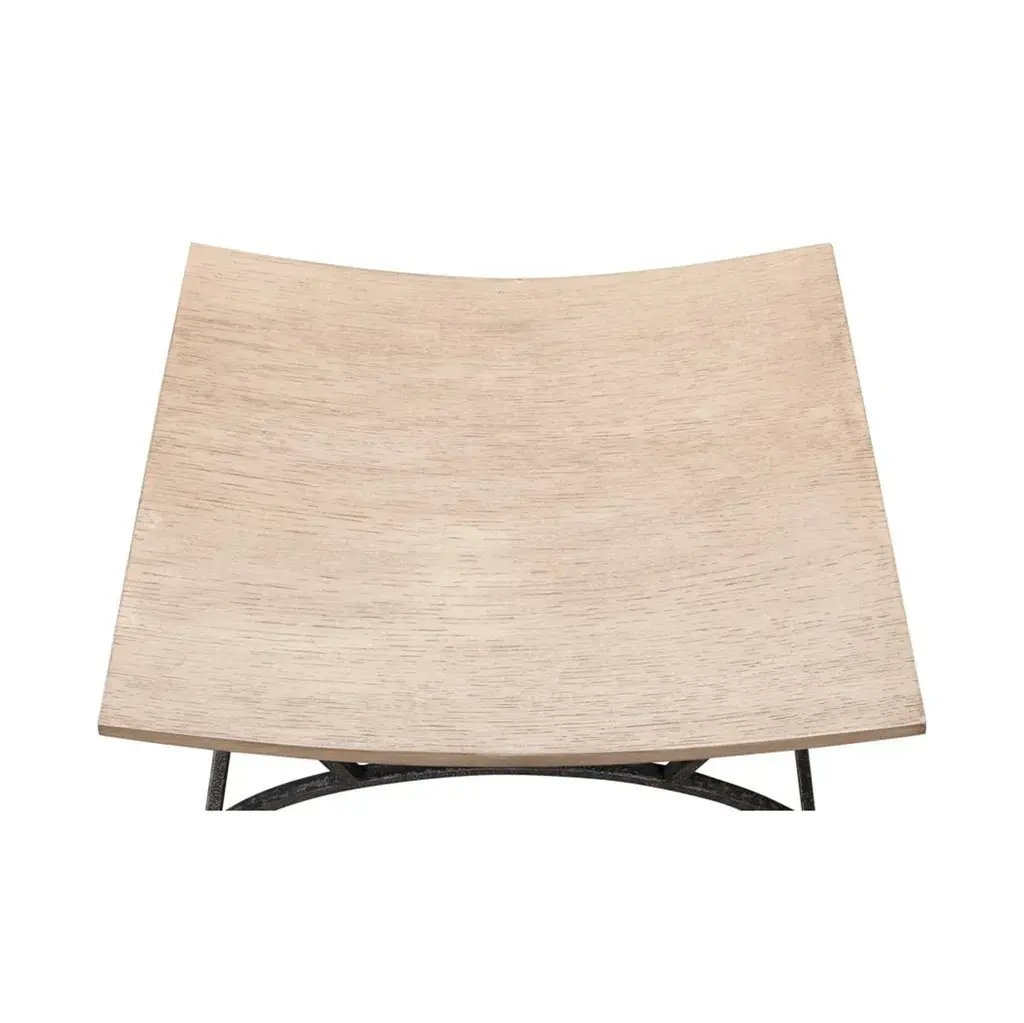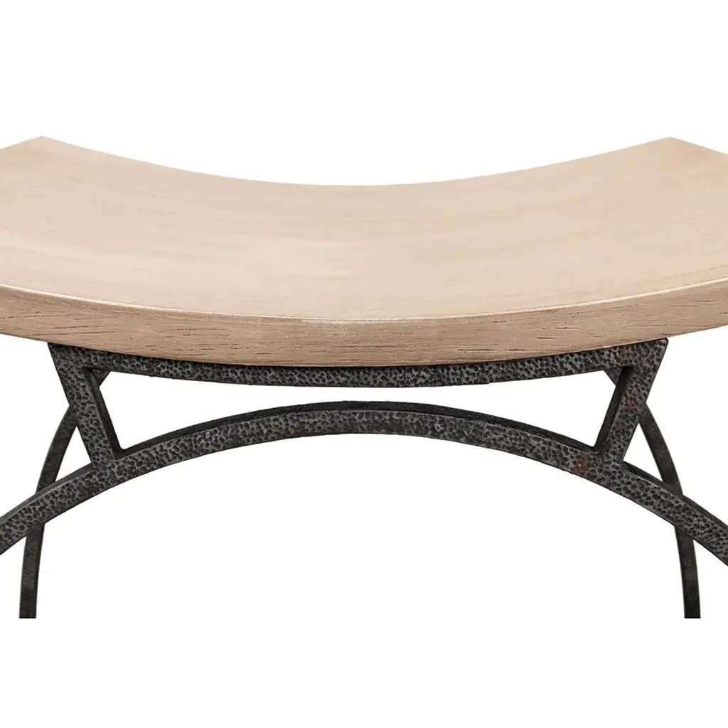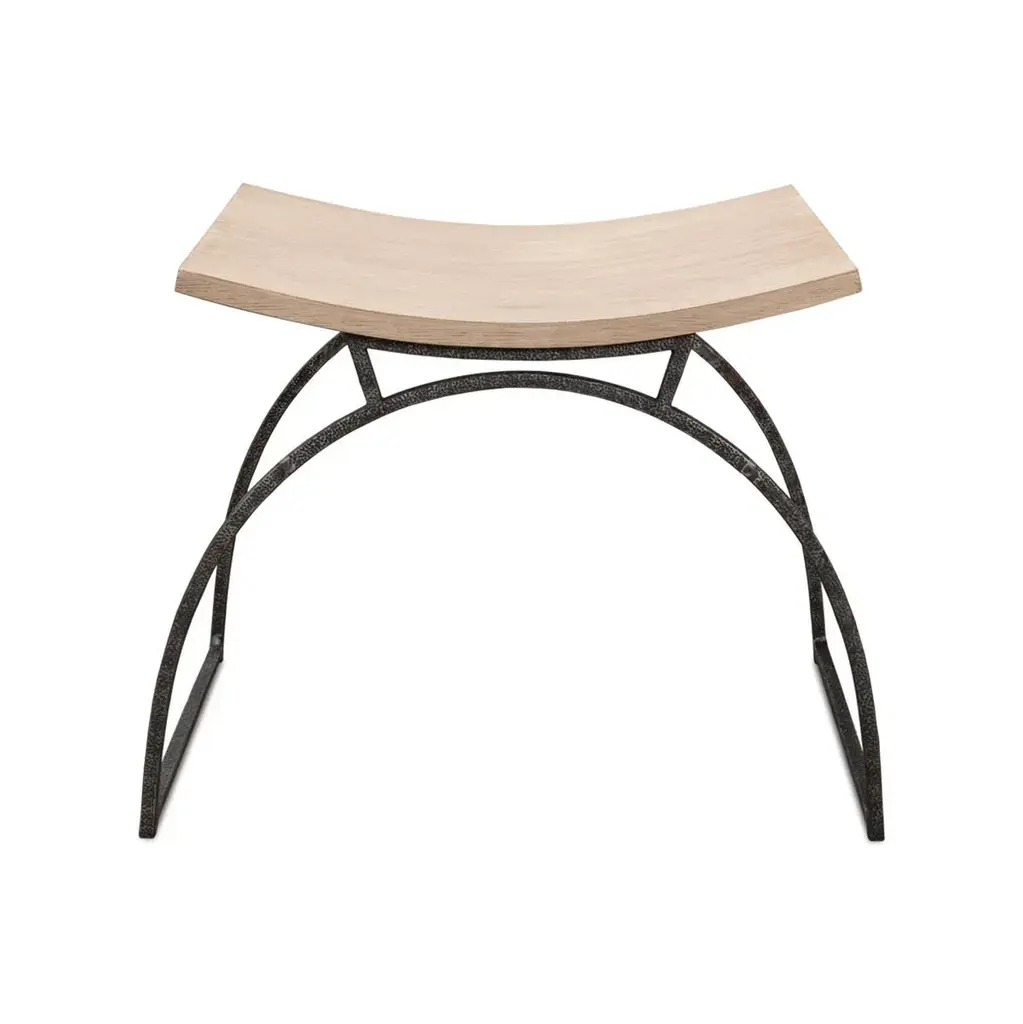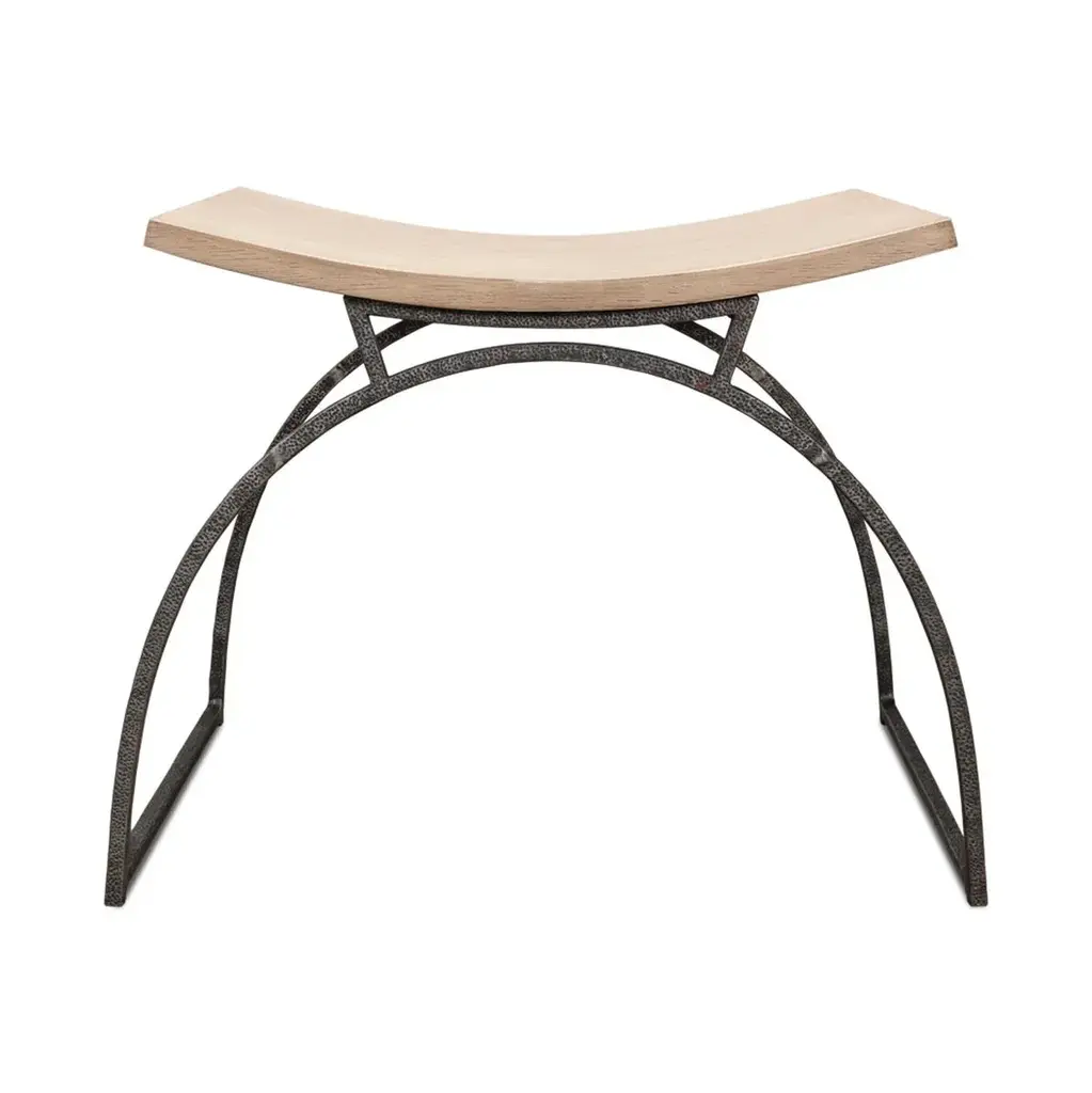 With a saddle seat form pine top on a hand-forged and hammered iron curule form base. Dimensions: 26" W x 18" D x 20" H Seat - 18" H