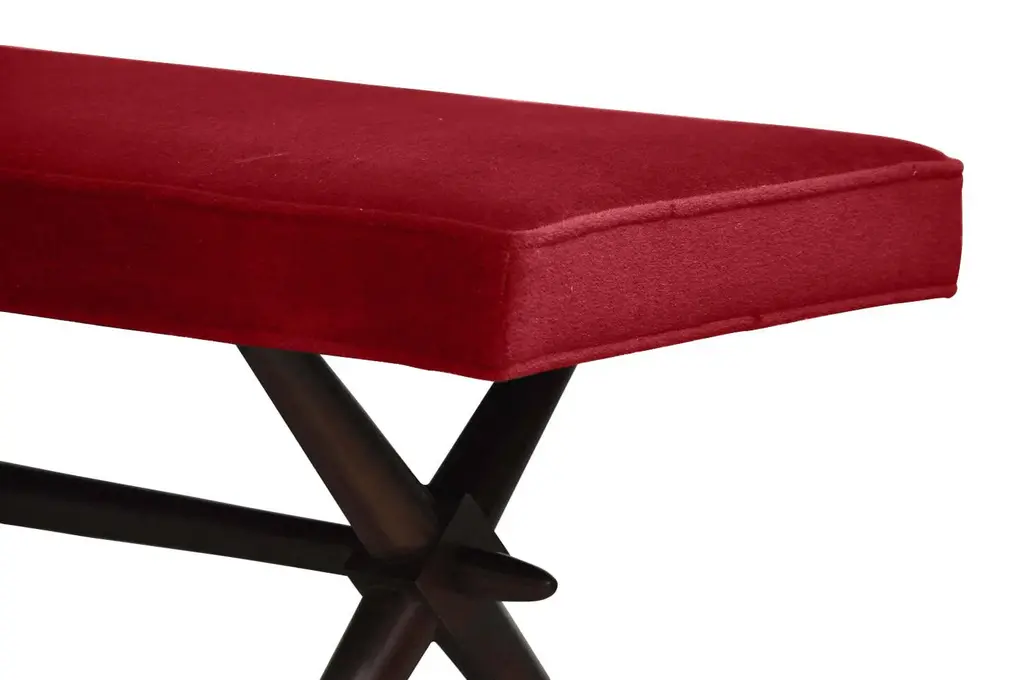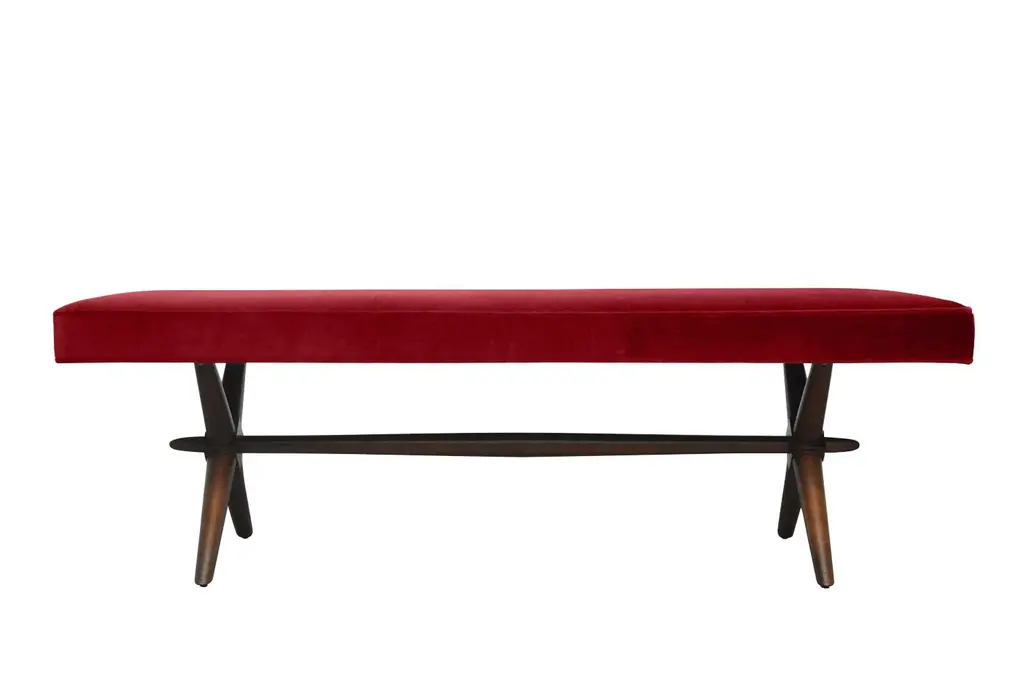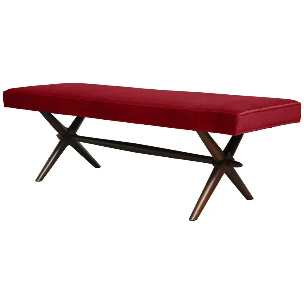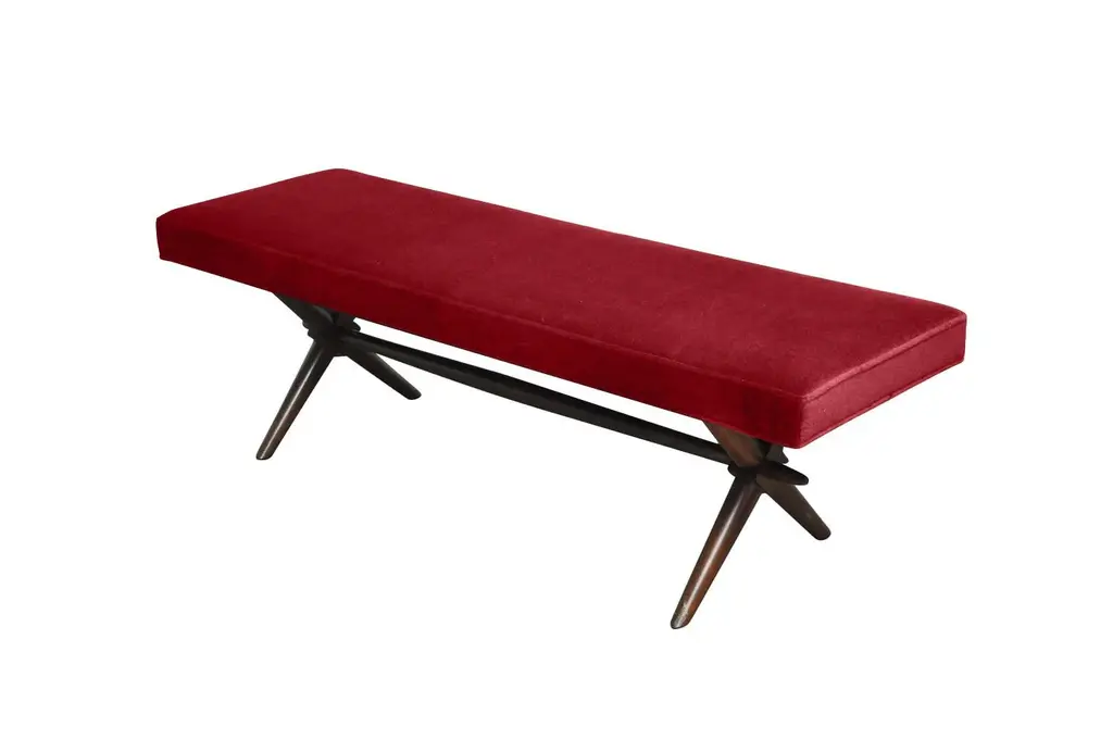 Mid-Century Modern bench.. Mid-century style at its finest! Frame is made of alder with a walnut finish, and upholstered in a red chenille. Wonderful Danish Modern style accents for any room! Dimensions: 19’’ tall, 19’’ deep, 52’’ long ʺMore than 3 Decades of high-end furniture design and manufacturing experience. Unique pieces, perfect for a variety of spaces! Unique upholstery, Unique finishes, Unique dimensions. Family owned and operated. Made in the USA. less less less