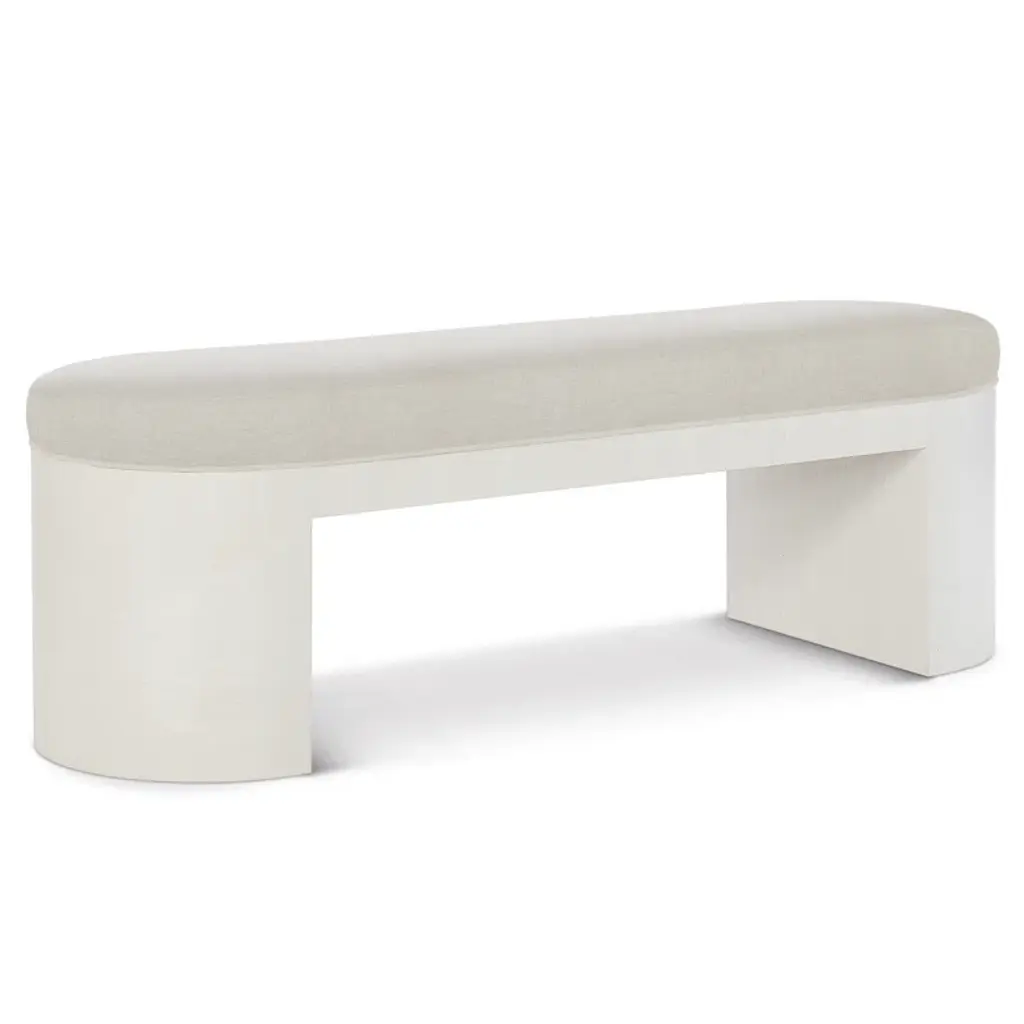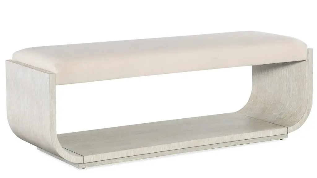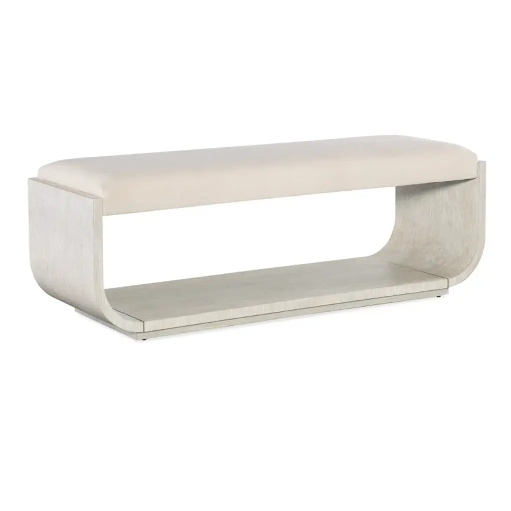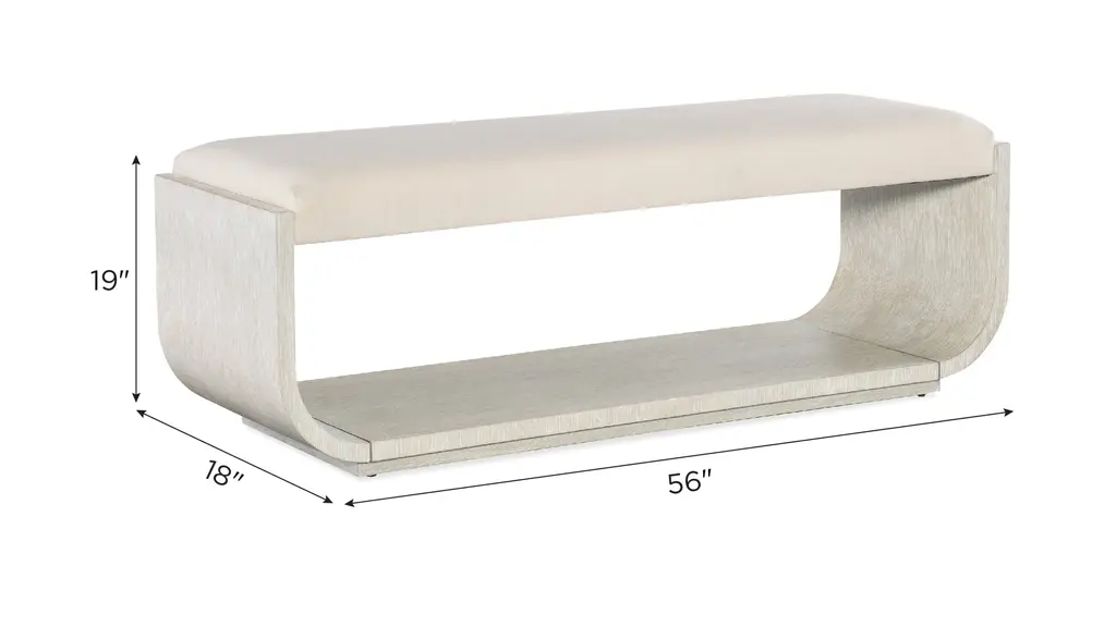 Modern Mood Bench is upholstered in a cozy Boucle fabric and finished in the crystal-like Diamond color with wire-brush detailing. The base is crafted of Quartered Oak Veneers.