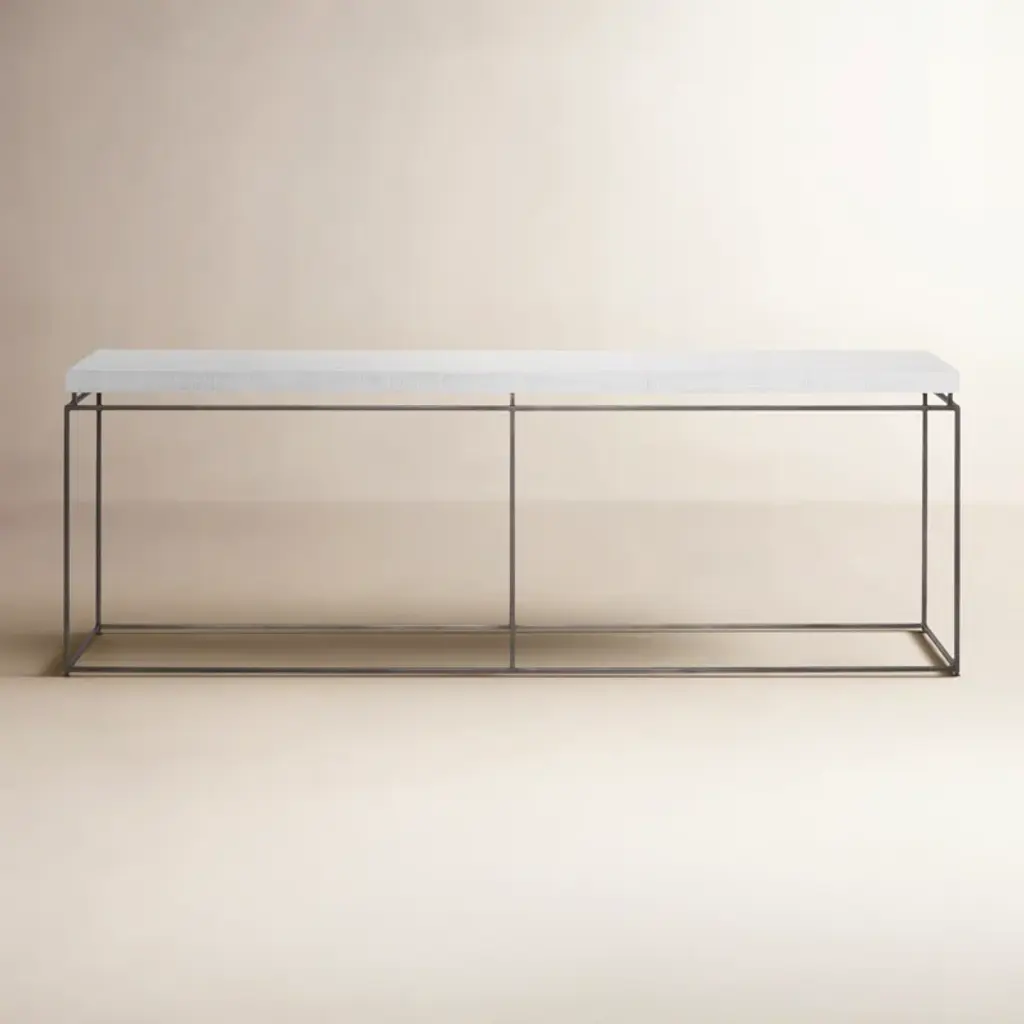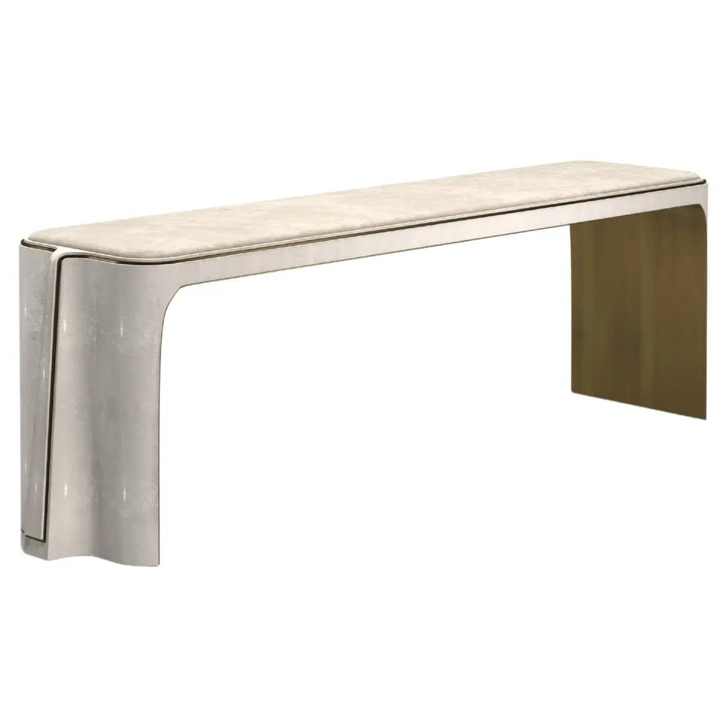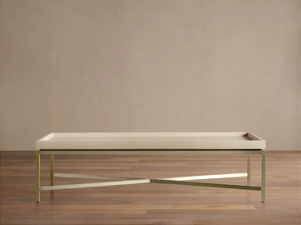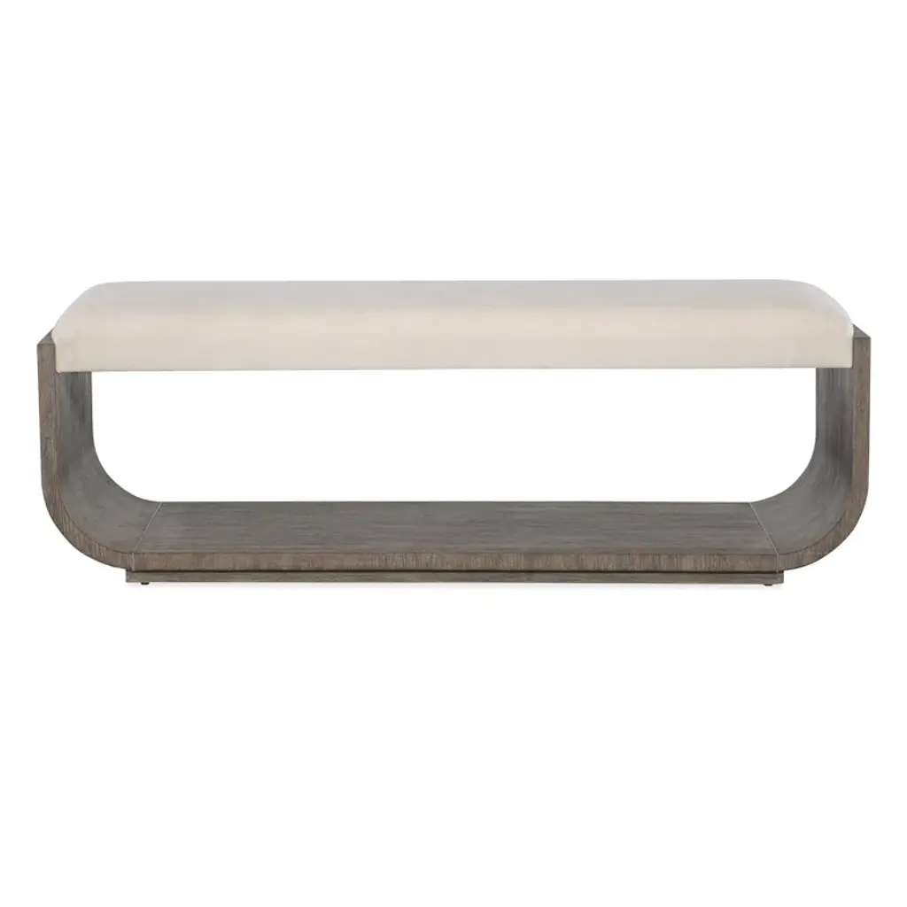Modern Mood Bench is upholstered in a cozy Boucle fabric and finished in the crystal-like Diamond color with wire-brush detailing. The base is crafted of Quartered Oak Veneers.