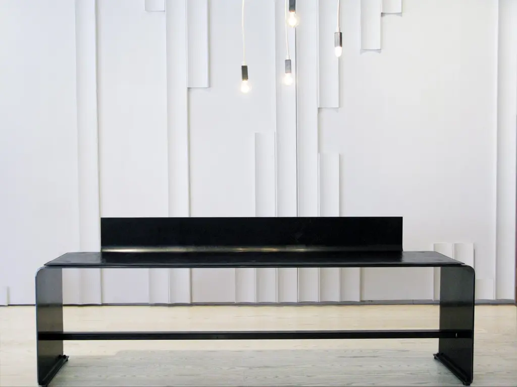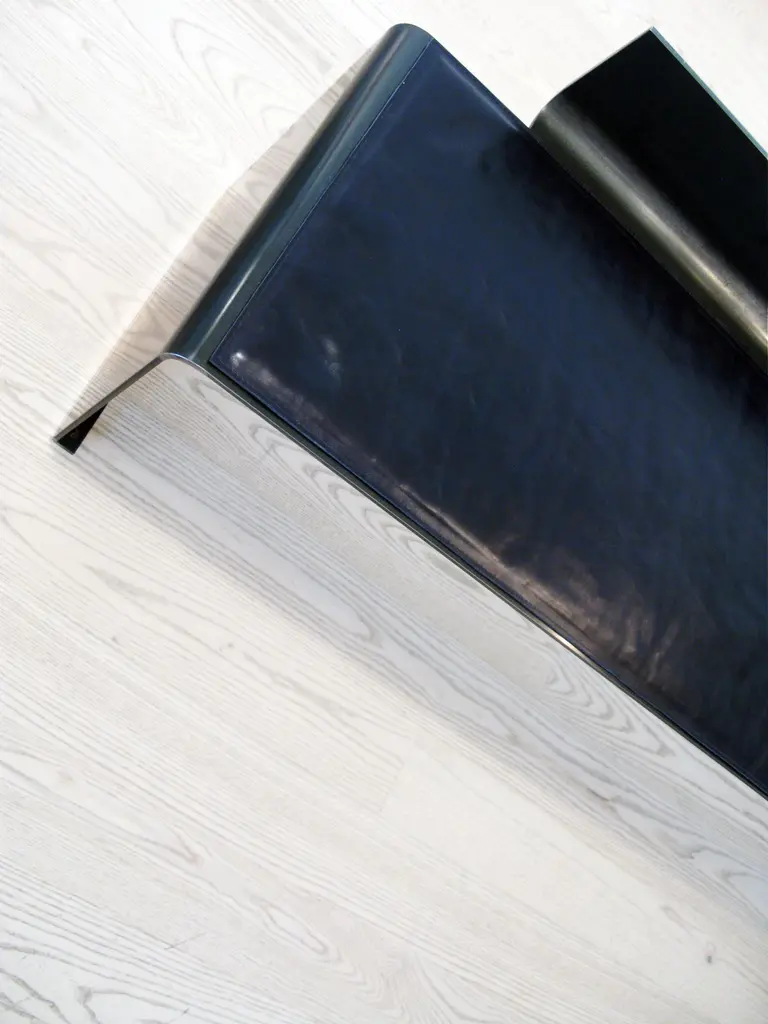 This modern styled steel bench is laser cut and folded from one sheet of metal. The visual lightness and elegance sets the perfect tone for any modern interior . Minimal leather padding with felt insert and magnets to hold into place. As this piece is fabricated with 1/4" structural steel, the finish will vary and is an inherent quality of this material.Leather is vegetable tanned and also varies in colouration.