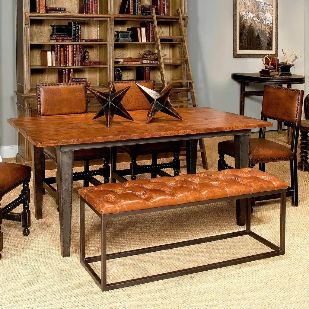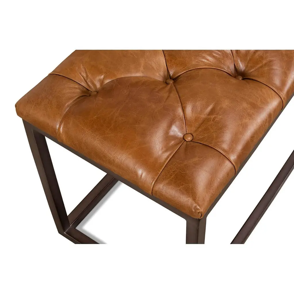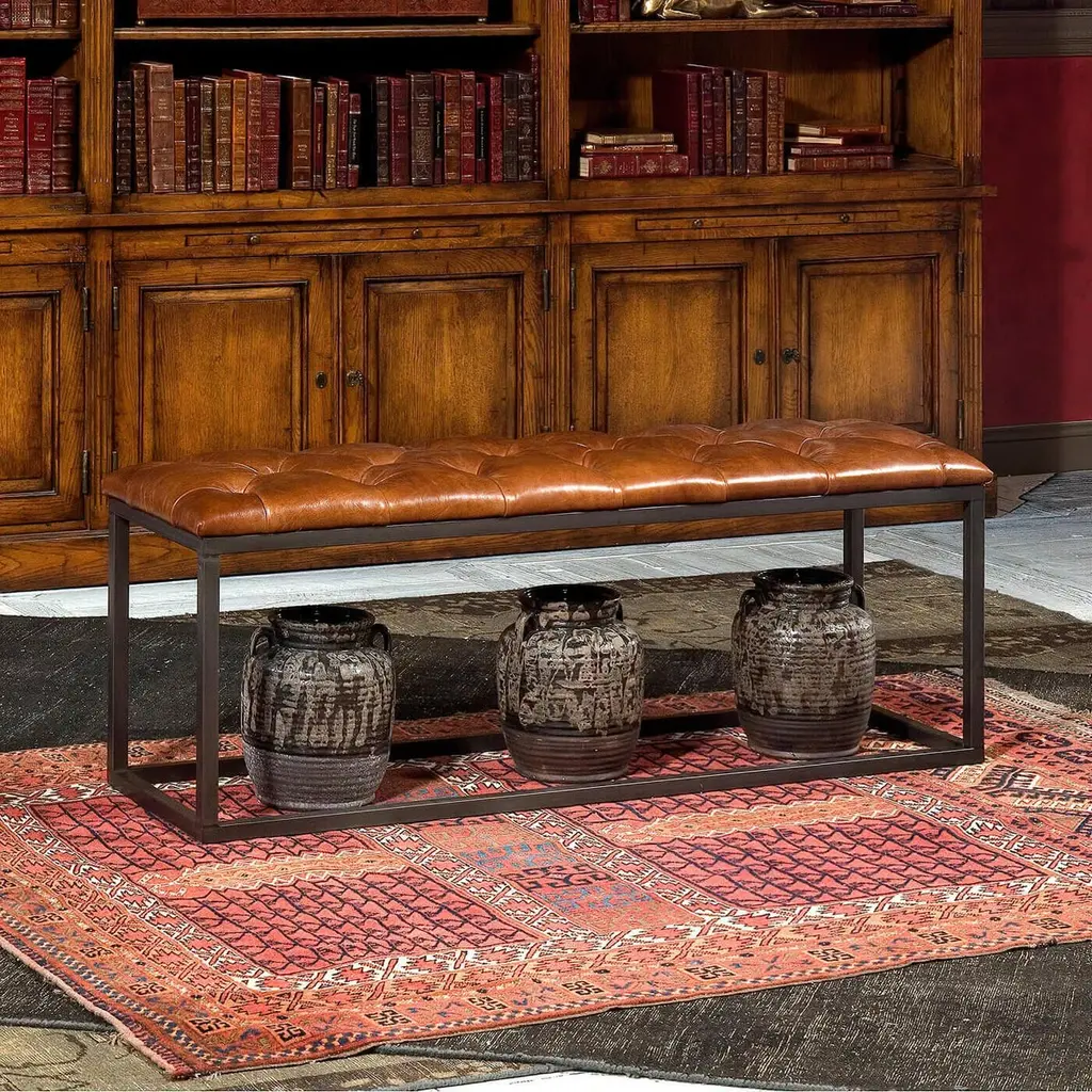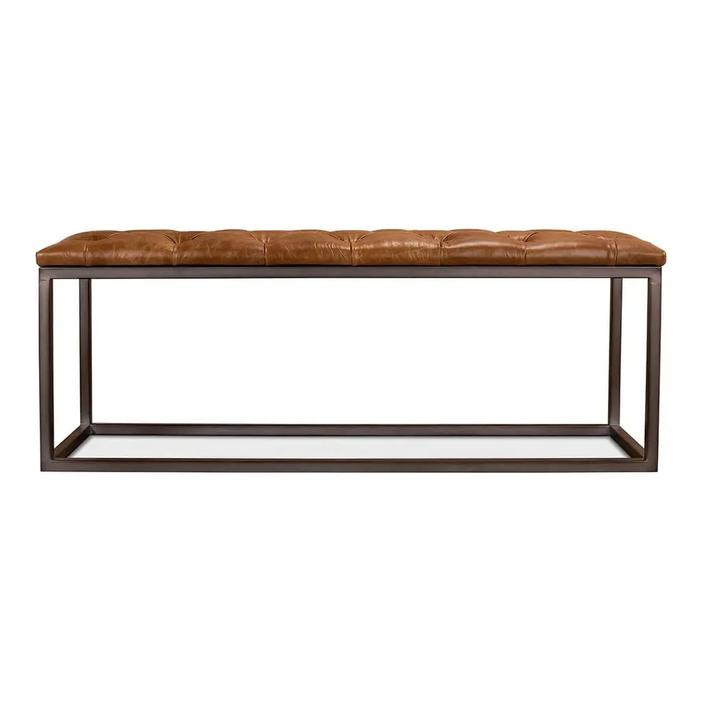 A modern tufted leather bench with a metal frame. The top leather upholstered cushion features button tufting and sits on a sleek open metal base in a dark brown finish. This piece has a classic meets contemporary look and feel, the versatile size and design make it perfect to use as a bench or ottoman.Made of pure Aniline top-grain leather in Cuba brown color. Color variation is common and acceptable on vintage-style leather, avoid heat and direct sun exposureDimensions: 52" W x 16" D x 20" H.
