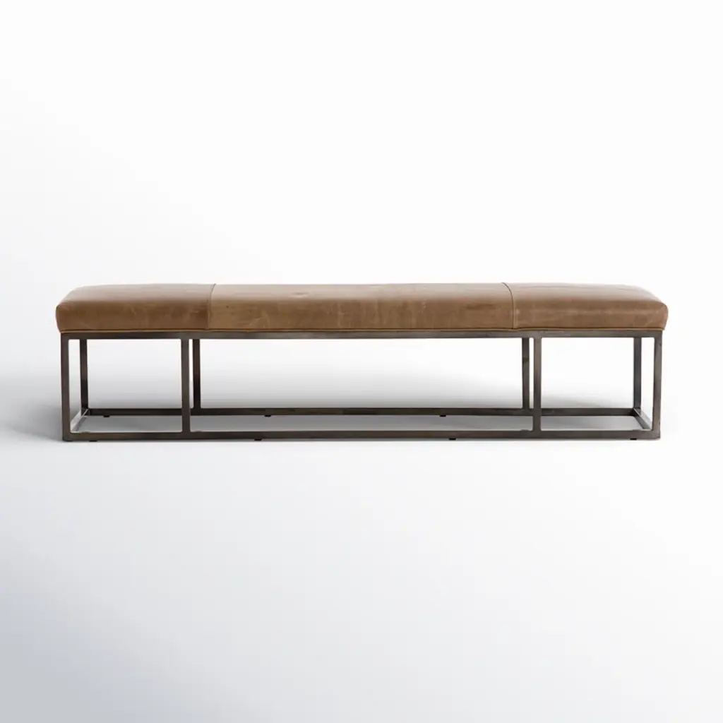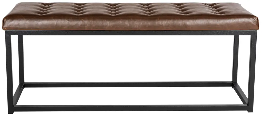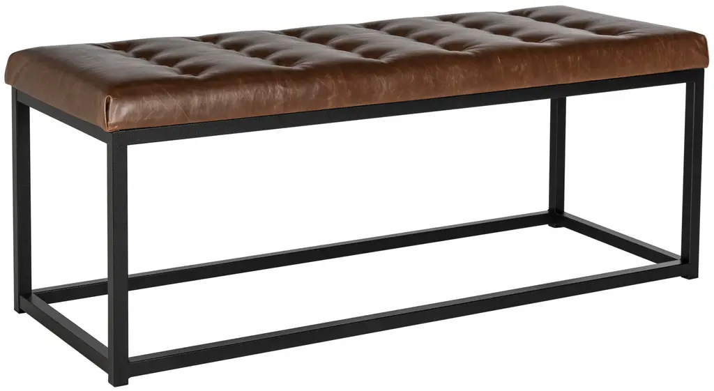 Graphic lines impart a designer look to the viewing bench, here with brown PU leather tufted upholstery and black Parsons-style legs. Universal in appeal, it adapts to industrial chic, contemporary or transitional spaces, from entry hall to the bedroom. To prevent overall soiling, frequent vacuum light brushing is recommended. Cushions and pillows should be turned on a weekly basis. Down-filled cushions should be brushed rather than vacuumed. Spot clean, using a mild water-free solvent or dry cleaning product. Only a professional cleaner should undertake a complete overall cleaning. The use of steam or water-based cleaners may cause excessive shrinking or staining. Some assembly required.