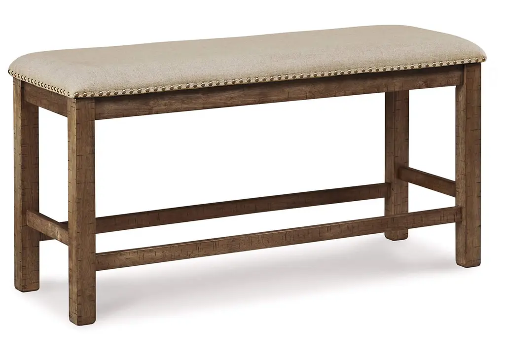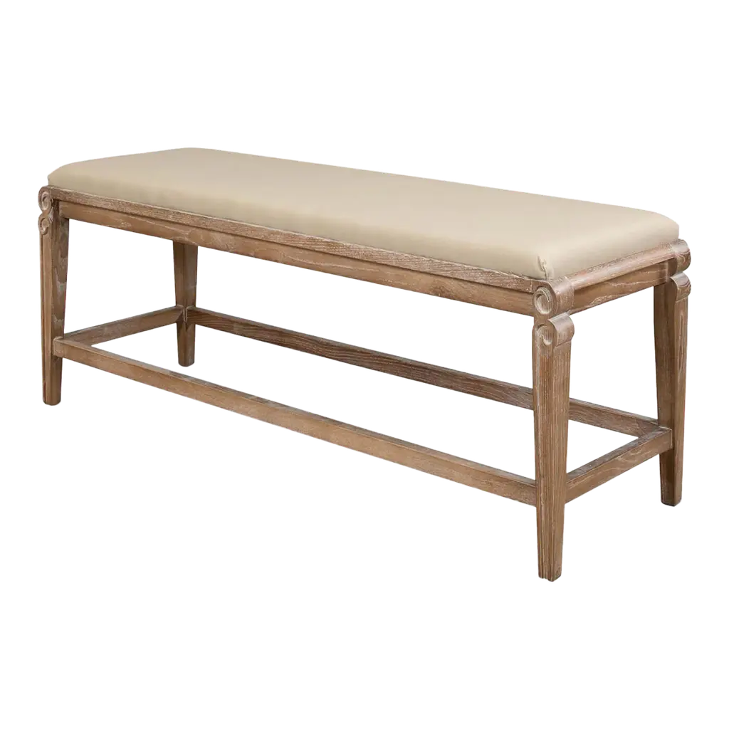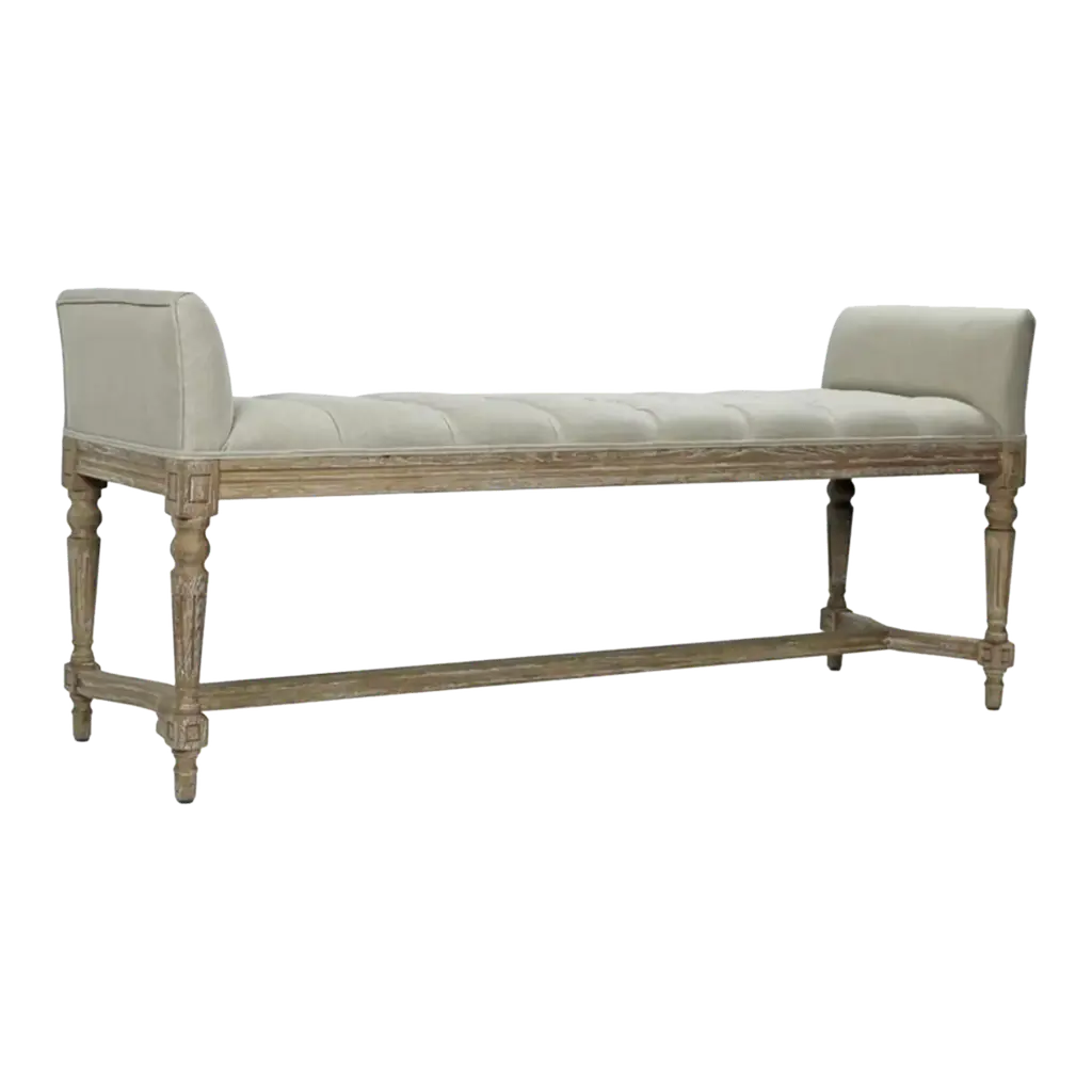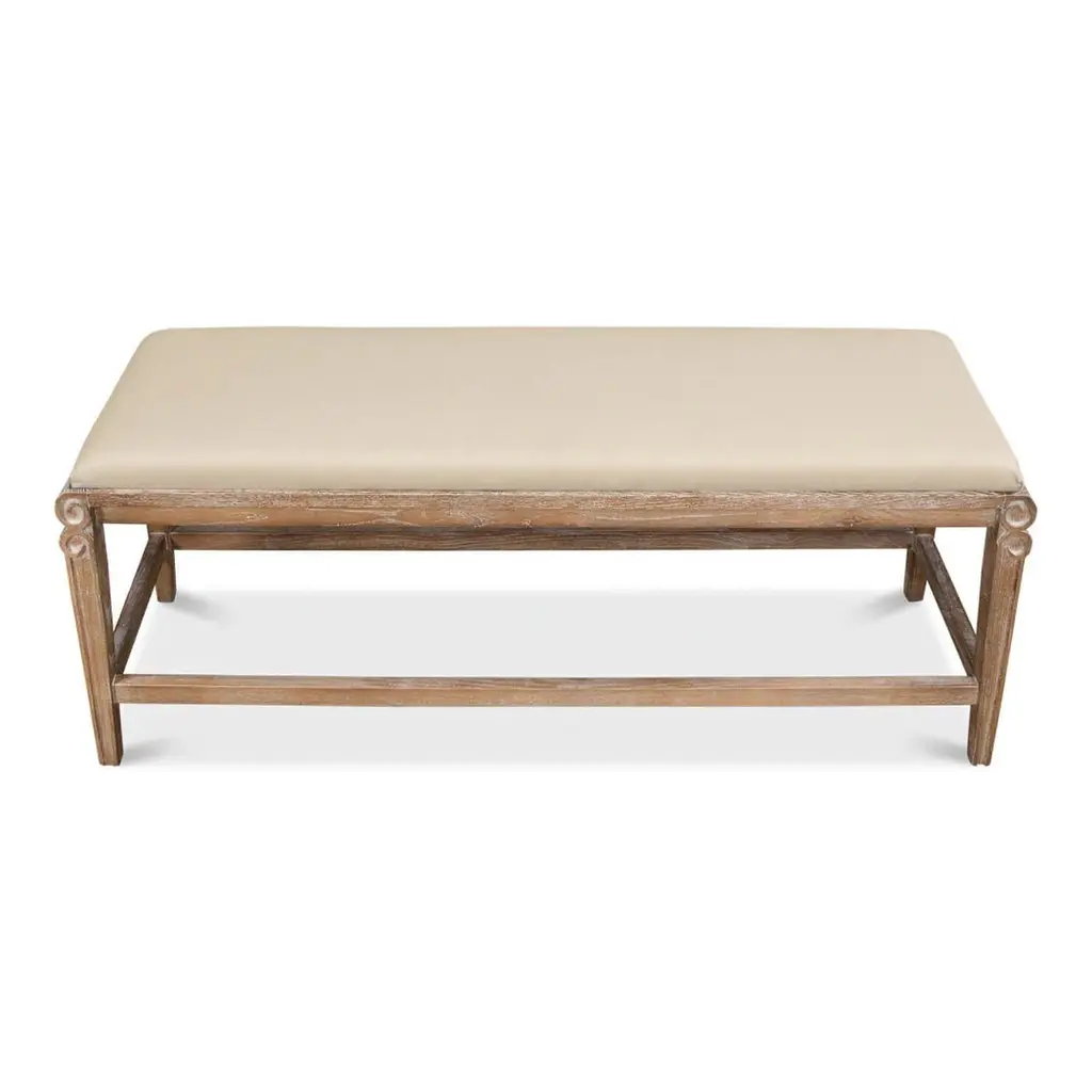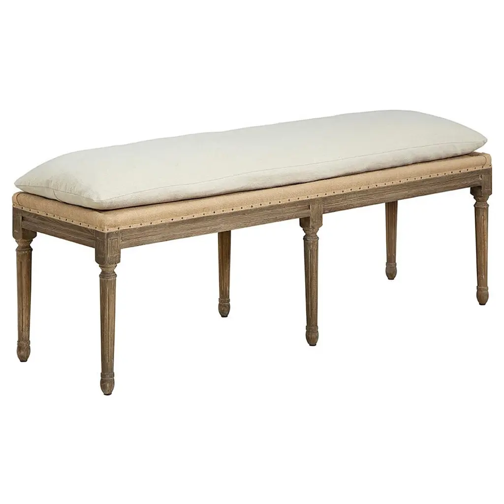 A modern whitewash and linen upholstered bench. This elegant bench has a beige linen-covered cushioned top and sits on a whitewashed oak frame with graceful lines.Crafted in neutral colors with a versatile design, this bench can easily be enjoyed in any room of your home. Dimensions: 47" W x 15" D x 19" H