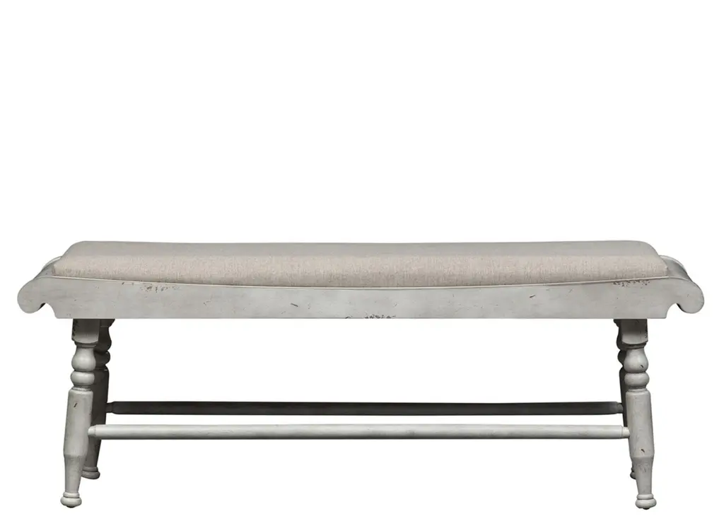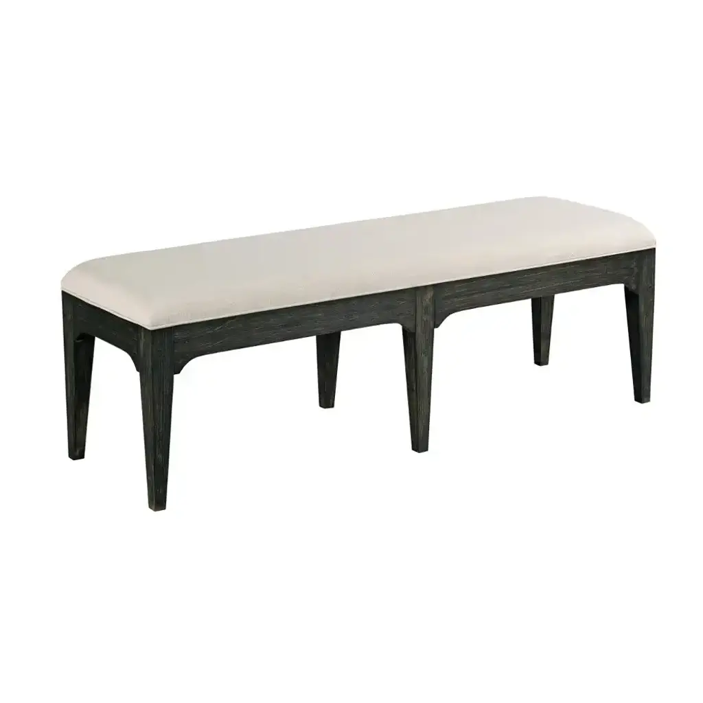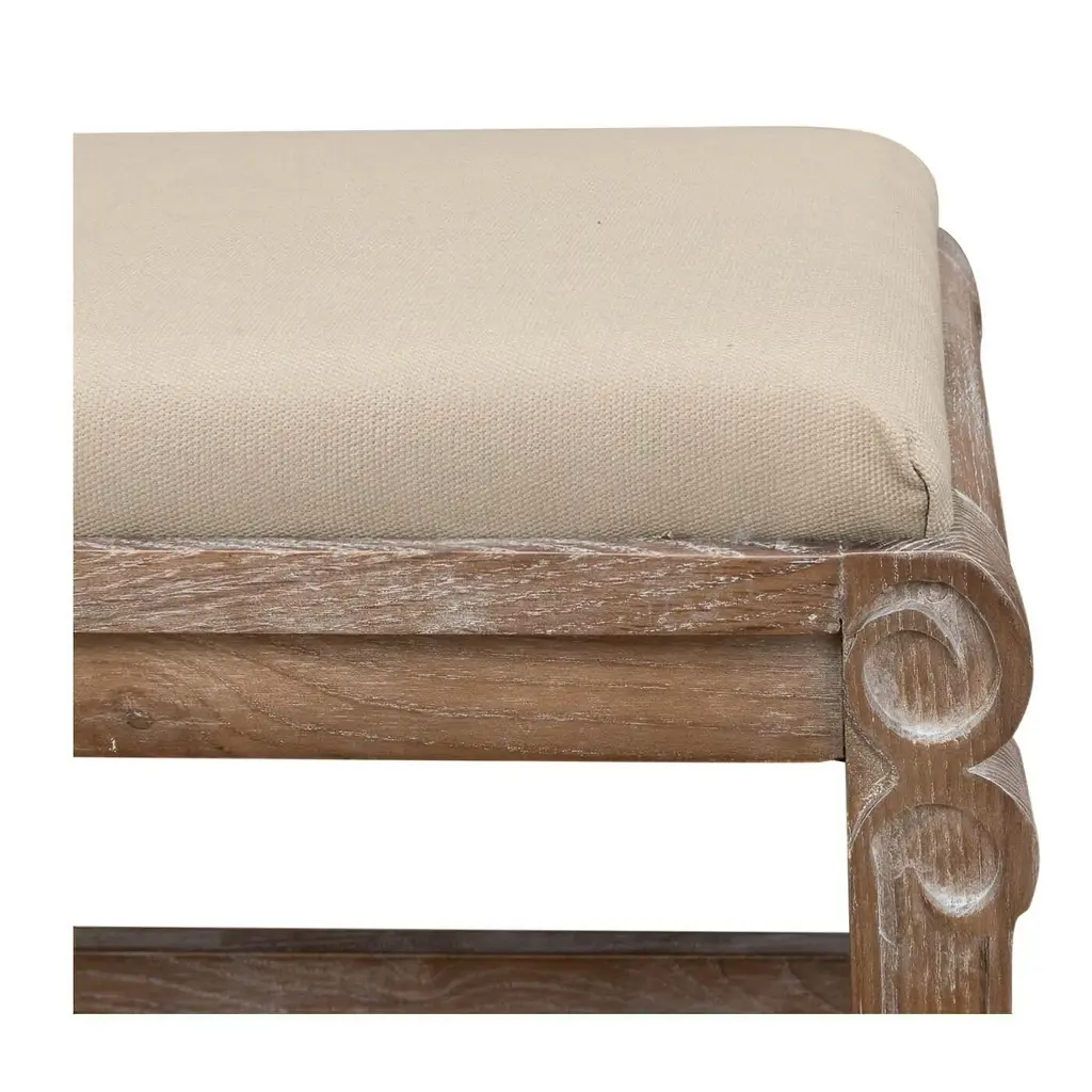 A modern whitewash and linen upholstered bench. This elegant bench has a beige linen-covered cushioned top and sits on a whitewashed oak frame with graceful lines. Crafted in neutral colors with a versatile design, this bench can easily be enjoyed in any room of your home. Dimensions: 47" W x 15" D x 19" H