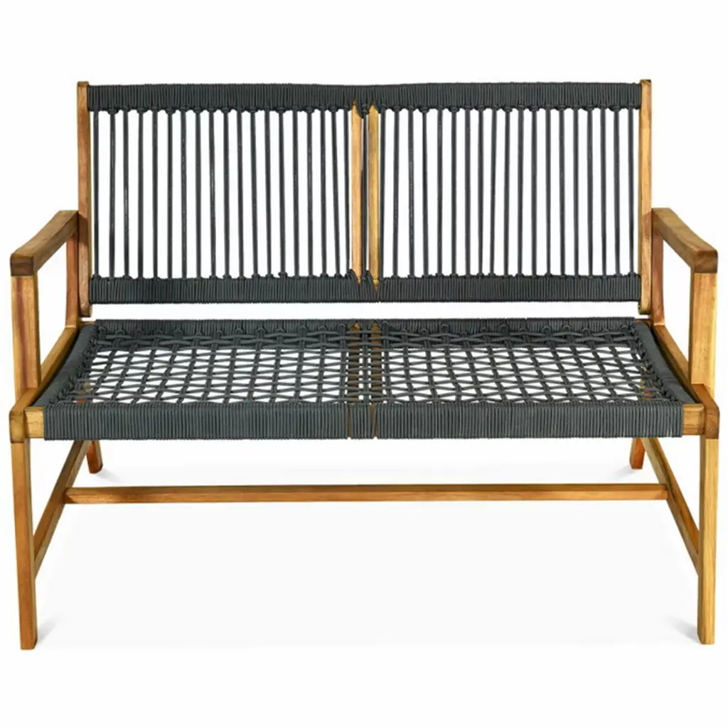 ¡ñ Sturdy and Durable Construction: Constructed of 100% natural acacia wood frame and wrapped with strong woven rope, our loveseat is durable without easy deformation and cracking. The legs are reinforced by crossbars, ensuring a stable structure and excellent load-bearing capacity of up to 705 pounds.¡ñ Comfortable and Ergonomic Design: The chair's back and seat are woven from ropes, which can promote air circulation and prevent the accumulation of heat and humidity near the human body. The ergonomic backrest and wide armrests provide a comfortable sitting feeling and can effectively relieve fatigue.¡ñ Exquisite and Stylish Appearance: The teak oil coating adds an extra layer of protection and provides a beautiful, lustrous finish. Simple lines and natural color create a relaxed and stylish look, allowing this chair to perfectly blend in with any style of patio decoration.¡ñ Ideal for Outdoor Use: The breathable design keeps your back and legs cool and sweat free even in hot summer. With a simple and modern appearance, this double chair is a striking decoration no matter where it is placed. It's perfect for your balcony, backyard, pool, etc.¡ñ Easy to Assemble and Clean: With detailed instructions and all necessary hardware provided, you can easily assemble the double chair in a few minutes, measuring 46.5" x 29.5" x 32" (L x W x H). In addition, the rope weaving design facilitates drainage and air-drying, making daily maintenance a breeze.