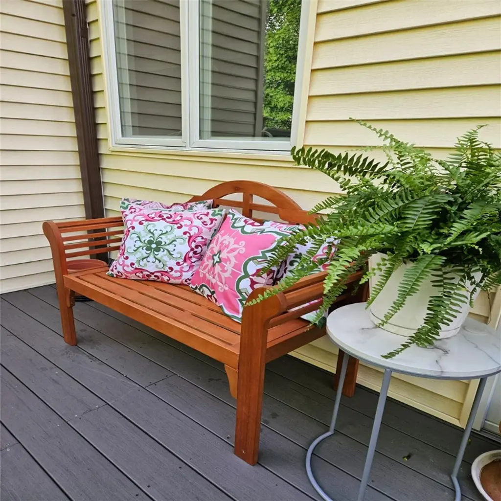 ¡ñ Sturdy Solid Wood Frame:?Made of premium eucalyptus wood, the folding bench is solid and durable for use. And the weight capacity of the bench is up to 800lbs. In addition, the bottom of leg is equipped with mats to prevent slipping and scratching.¡ñ Folding and Space-saving Design:?Unlike other garden benches, this bench can be folded with simple steps when not in use. And you can store it in the corner. In addition, the seat can be fixed with hasp to add additional stableness of the bench.¡ñ Comfortable Seating Experience:?The seating of the bench is spacious enough for 2 people to sit together. Featuring a comfortable backrest, the bench will provide comfortable support for your back. In addition, the height of the armrest is suitable to put your hand and arm on.¡ñ Natural Style and Versatility:?With natural and concise style, the bench will be a good complement to your home and matches your other furniture well. It is suitable for various outdoor or indoor places such as your patio, backyard, garden and poolside.¡ñ Convenient to Assemble and Maintain:?All necessary hardware and instruction are included for quickly assembly. With a waterproof surface, the bench is easy to clean with cloth. Dimensions of the bench: 49" x 21" x 38" (L x W x H), Dimensions after folding: 49" x 38" (L x H).