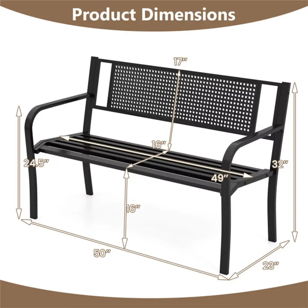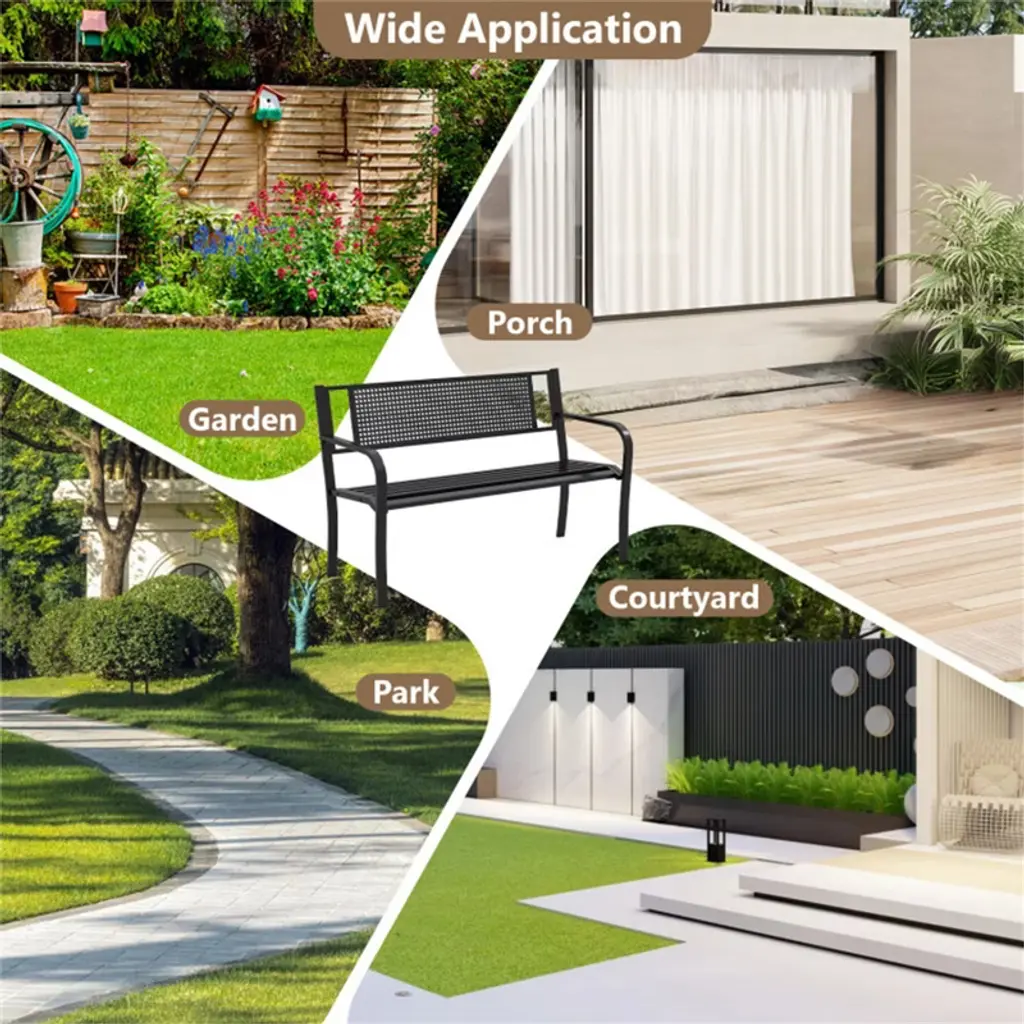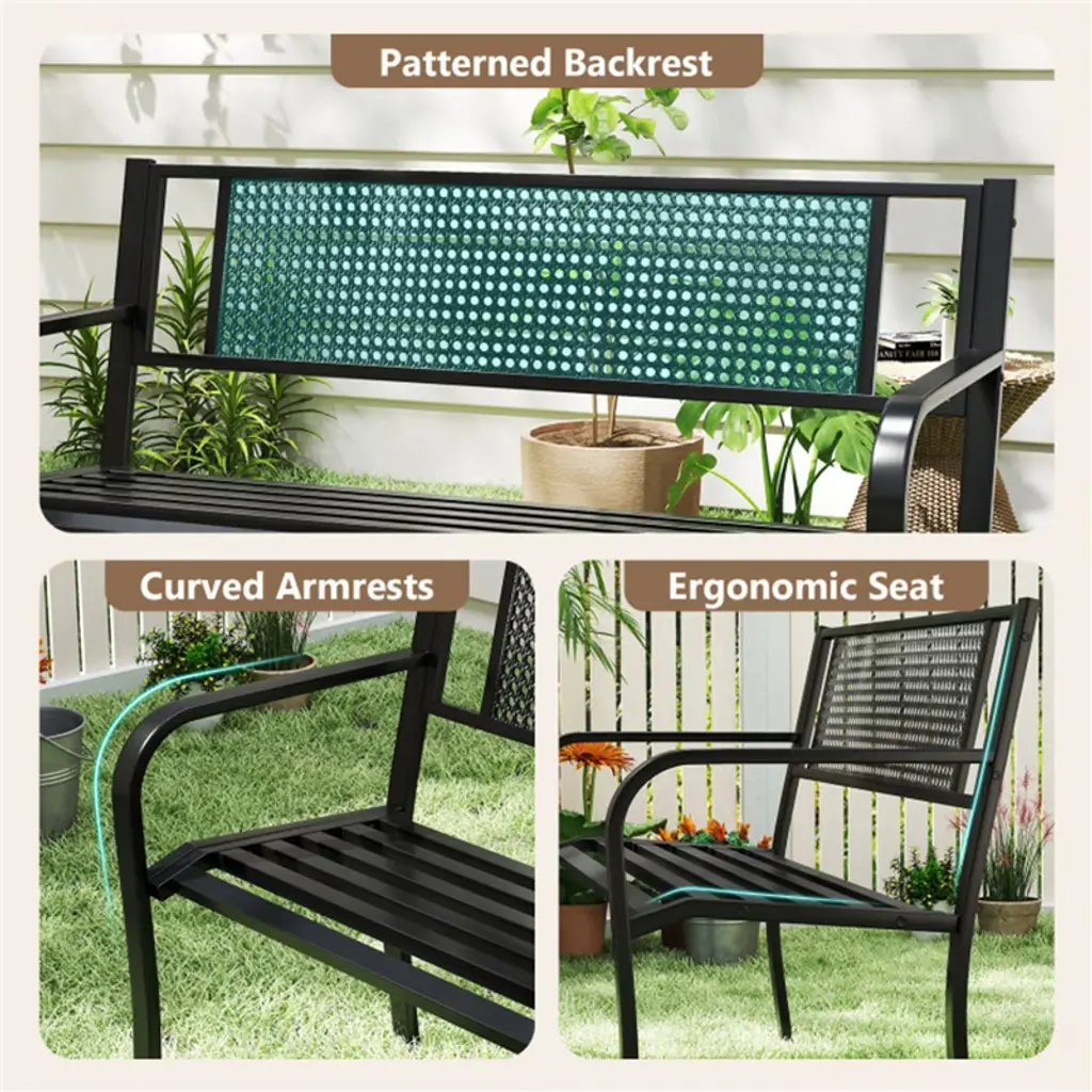 ¡ñ Exceptional Durability:?The spray-painted metal frame resists wear and tear, making this patio bench stand the test of time. Moreover, the heavy-duty construction enables the bench to accommodate up to 660 lbs.¡ñ Designed for 2-3 People:?With a wide sitting area, you are able to indulge in the serene outdoors with your loved ones. The ergonomic seat, coupled with a patterned backrest and curved armrests, offers an idyllic spot for relaxation in your outdoor setting.¡ñ Comfy Garden Bench:?This garden bench integrates sophistication and functional flair in your outdoor spaces. Its simple yet elegant outlook will blend well with other outdoor furniture.¡ñ Suitable for Outdoors:?Suitable for a wide range of outdoor settings, the outdoor bench is a perfect addition to your furniture collection. No matter for gardens, courtyards, or parks, this bench offers a comfortable sitting solution.¡ñ Hassle-Free Installation:?Coming with a detailed instruction, this outdoor loveseat chair boasts a fuss-free installation process. The simple structure lets you spend less time on setup and more on enjoying your outdoor retreat.