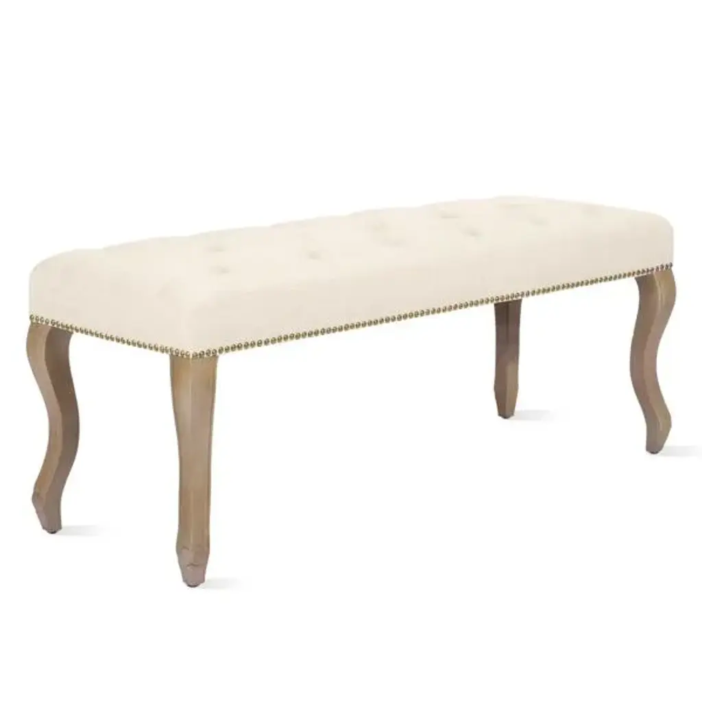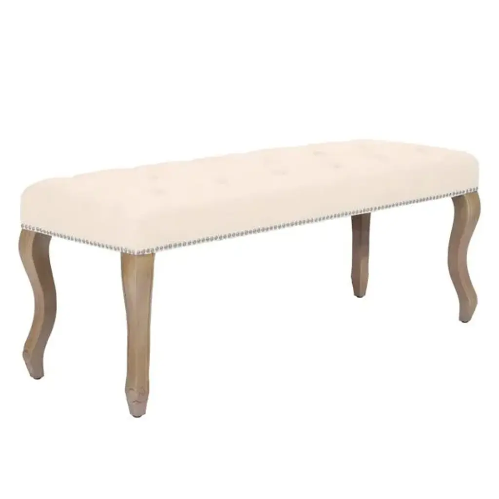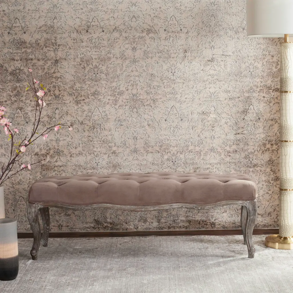 Exuding Country French charm, the Bench recreates the look of a family heirloom with beautifully carved distressed oak frame and timeless cabriole legs. Upholstered in mushroom taupe colored cotton velour,makes a welcome statement in a entry hall, and inviting one in bedroom or living room. To prevent overall soiling, frequent vacuum light brushing is recommended. Cushions and pillows should be turned on a weekly basis. Down-filled cushions should be brushed rather than vacuumed. Spot clean, using a mild water-free solvent or dry cleaning product. Only a professional cleaner should undertake a complete overall cleaning. The use of steam or water-based cleaners may cause excessive shrinking or staining.