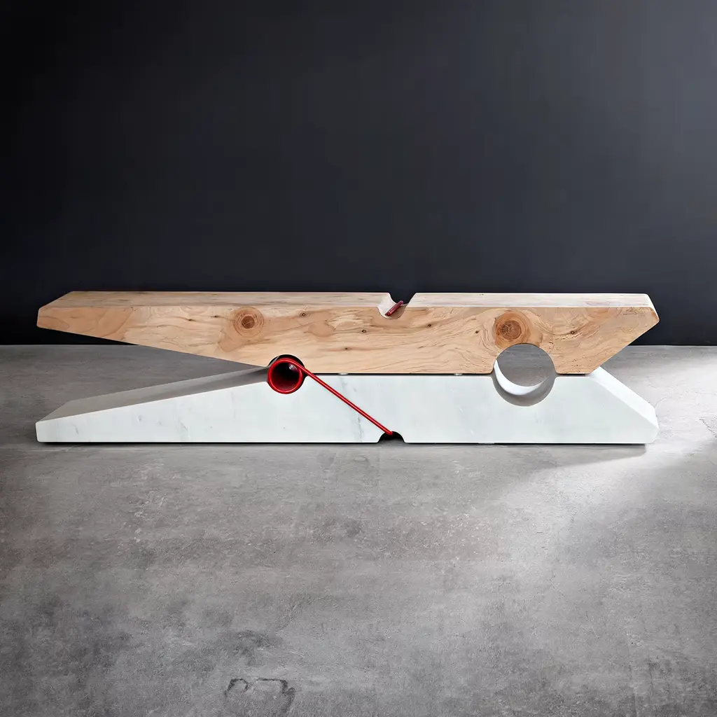 This extravagant bench shaped like a clothespin ("molletta" in Italian) will effortlessly capture the eye in any contemporary decor thanks to its whimsical look tempered by neutral tones. Available in three size variants, the design is crafted overlapping perfectly symmetrical elements in white Statuario Macchietta marble and unrefined cedar, creating an unexpected harmony of tones and textures.