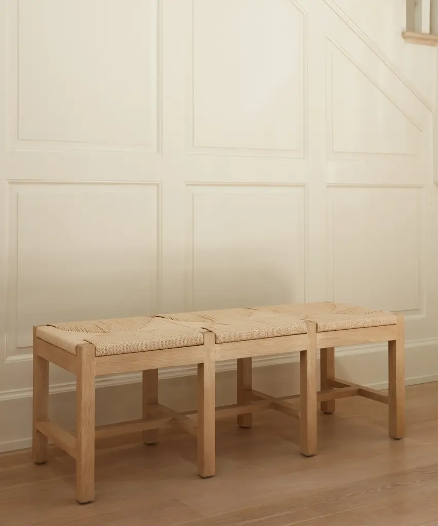 Montecito Bench Oak Inspired by a vintage piece sourced by Jenni for the Jenni Kayne Ranch, our Montecito collection features solid White Oak frames with a natural finish and handwoven Danish paper cord. Handmade with care, each piece boasts a durability that welcomes natural patina and signs of a life well-lived. Vintage-inspired bench with a solid White Oak Frame and handwoven Danish paper cord seat. Features a mortise and tenon joints and three small seats. For furniture purchases, please refer to our furniture inspection policy here, and for help styling this piece in your space, contact [email protected] for a complimentary consultation. CA Residents: Prop 65 Information