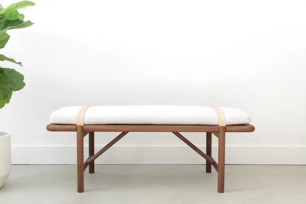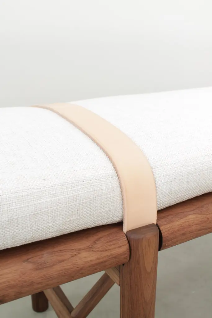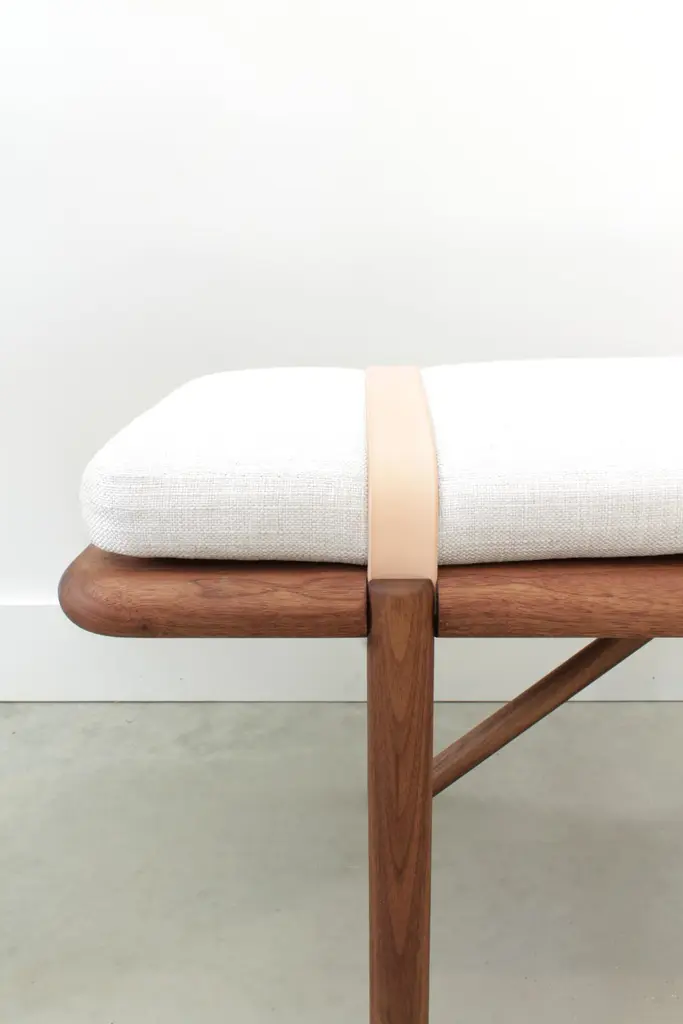 The Mora bench introduces textile to our line up and we welcome this new form to our familiar pieces. The bench is being offered with and without a cushion in a variety of material choices. With a delicate look, structural stability is achieved through solid wood mortise and tenon joinery and is shipped flat.