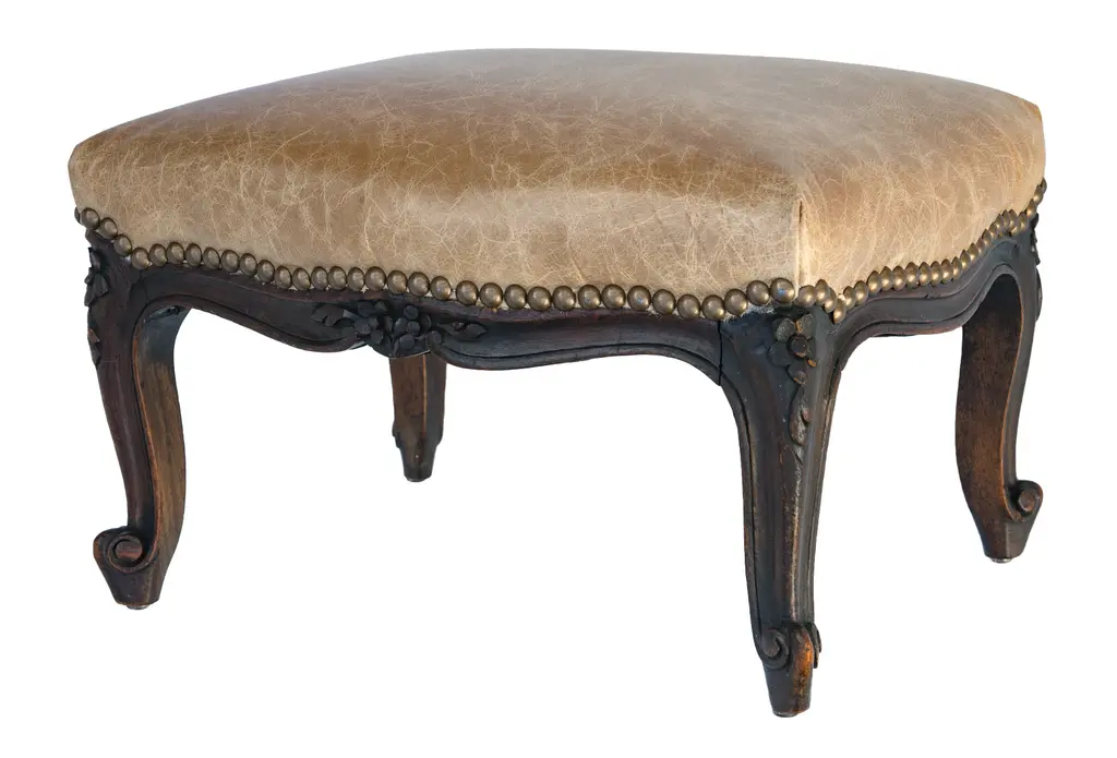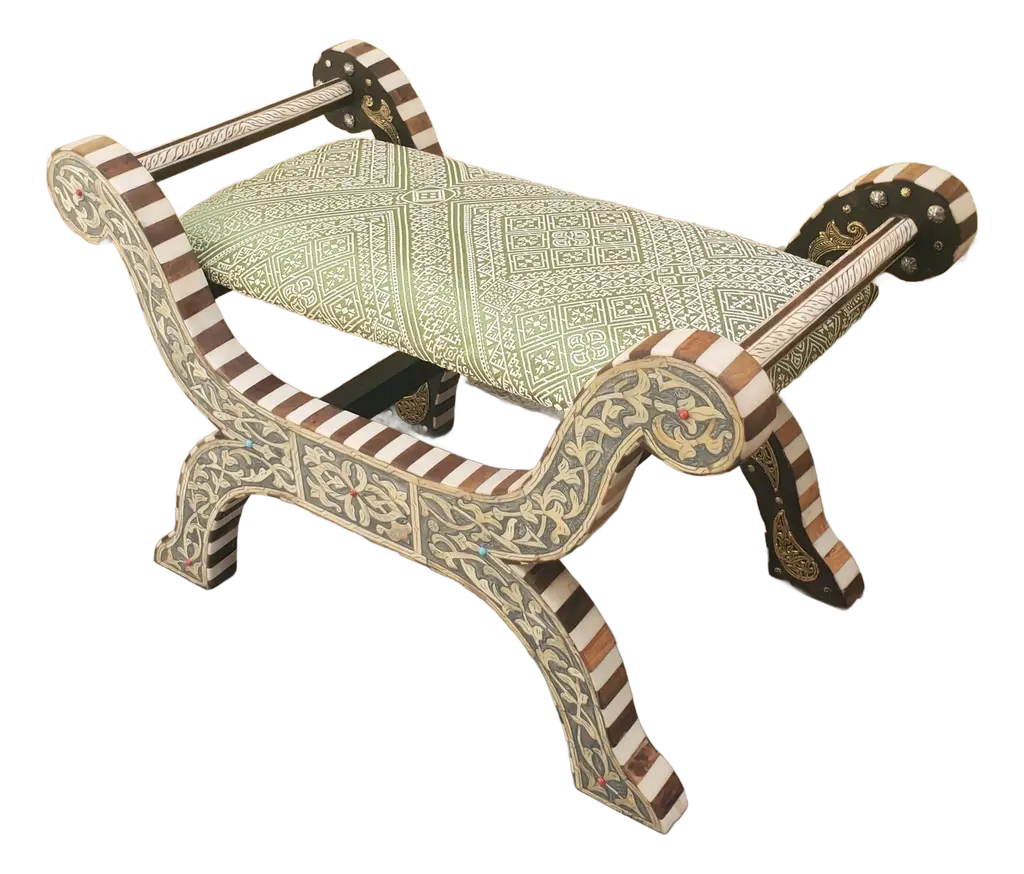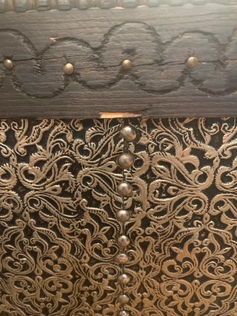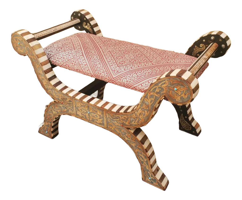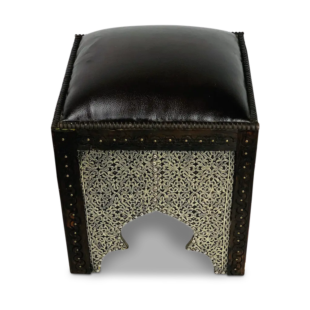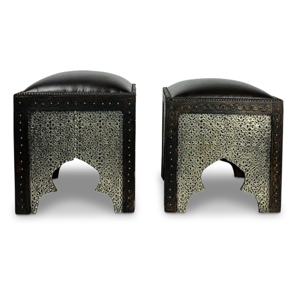 Traditional Moroccan detailed craftsmanship, embossed metalwork square benches with stud detail and upholstered leather seat to a dark carved wood frame. Could be used as a pair, although not an exact match as one is half an inch taller, sold separately.