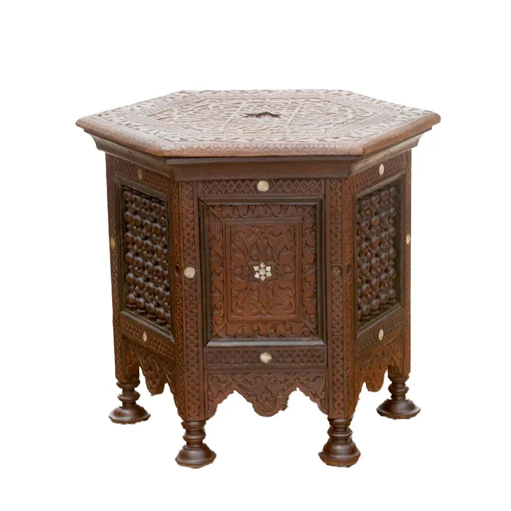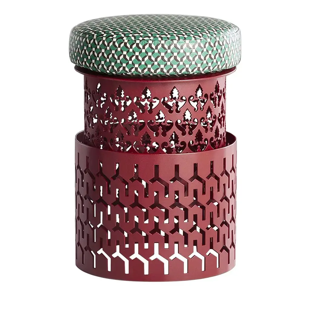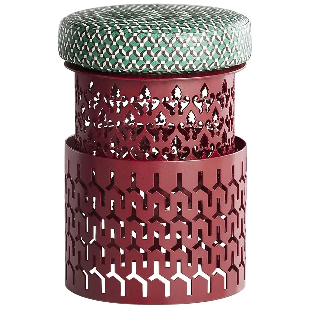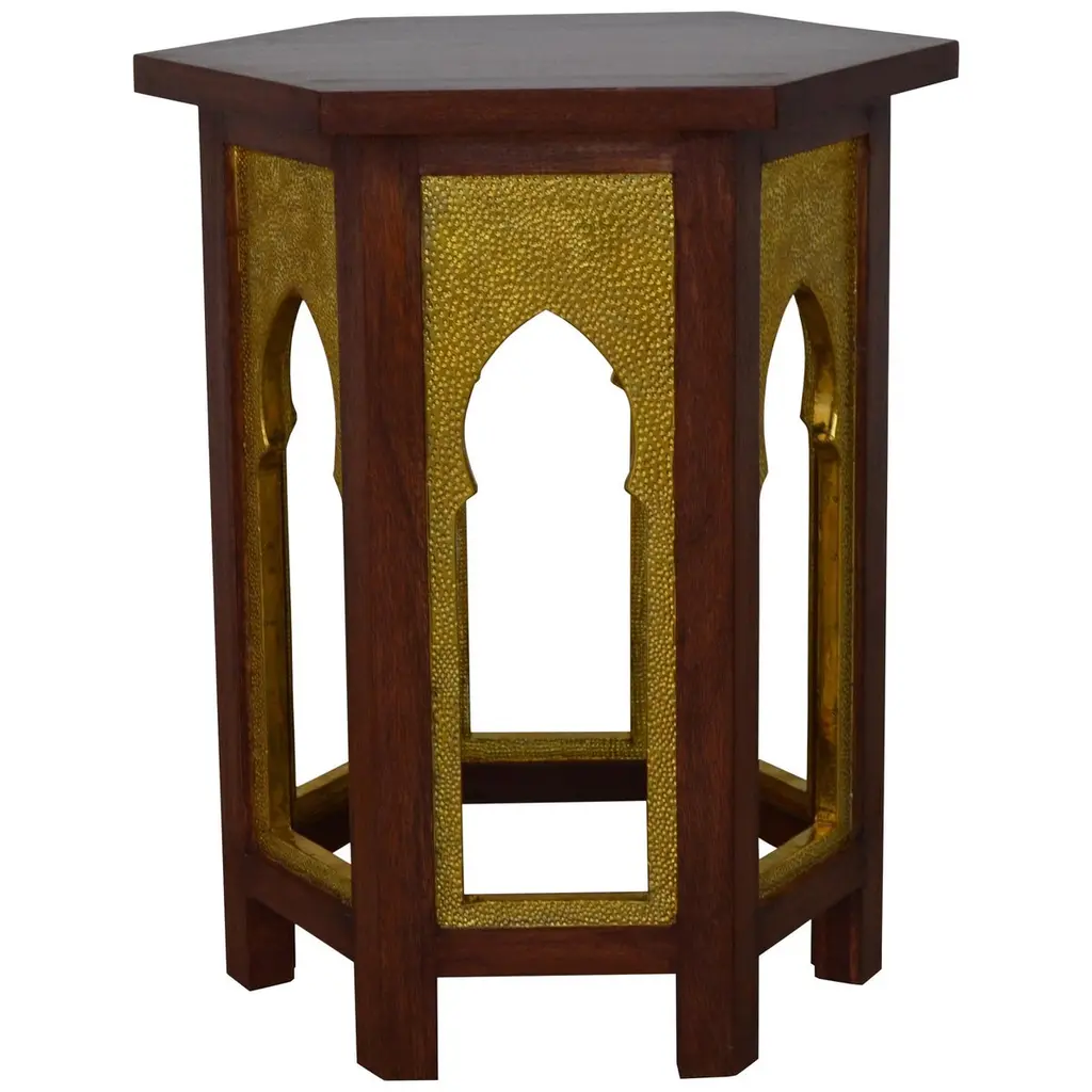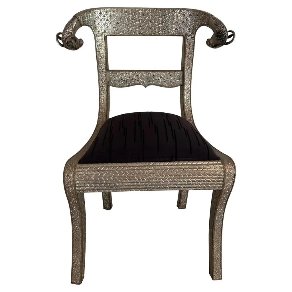 Traditional Moroccan detailed craftsmanship, embossed metalwork square benches with stud detail and upholstered leather seat to a dark carved wood frame. Could be used as a pair, although not an exact match as one is half an inch taller, sold separately.