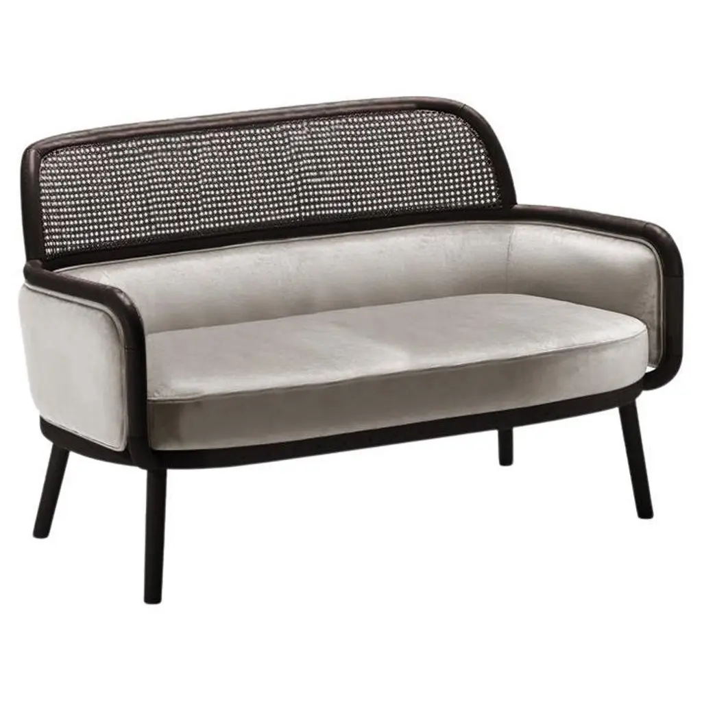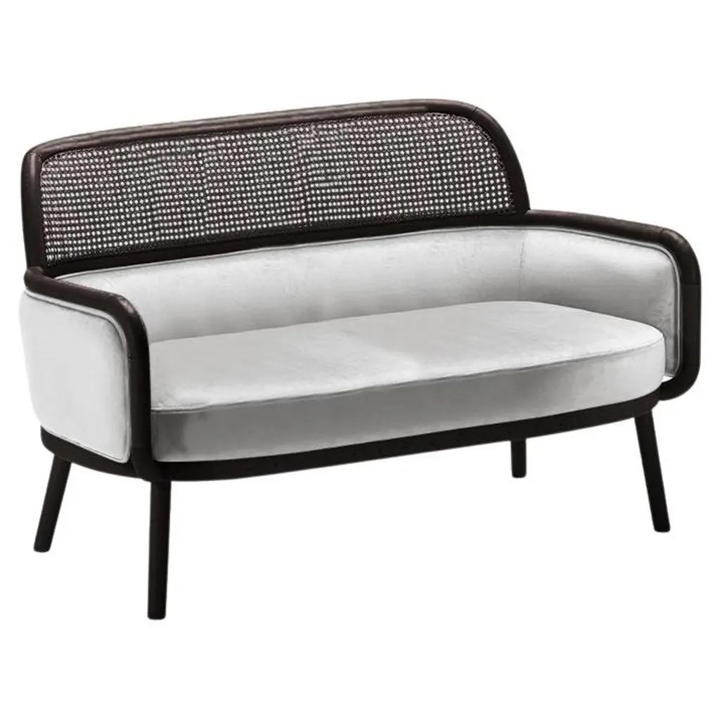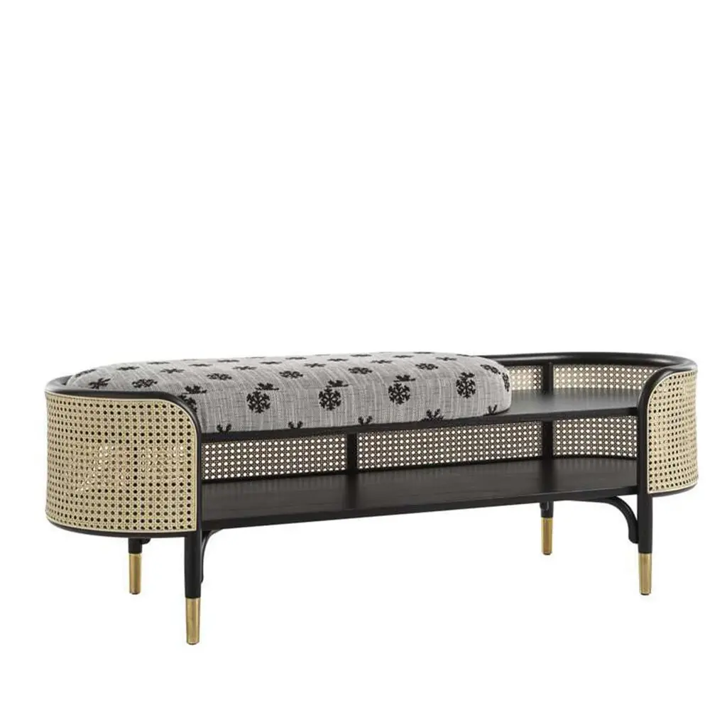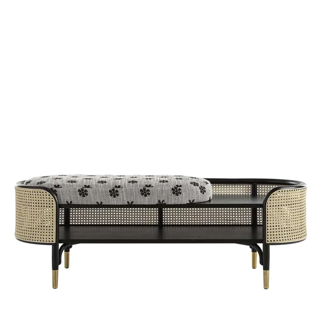 A well-proportioned design that incorporates a double function, the MOS bench features an elliptical frame of steam-bent beechwood enclosed in an inviting Vienna cane shell. Supported by straight legs with brass feet, the bench seat has a removable cushion covered in gray fabric with white snowflakes covering 3/4 of the surface (available also in a full-length), with the small section exposed used as a functional side table. Designed for the bedroom, this contemporary piece would work well also in a foyer or lounge\. Signed by Maker