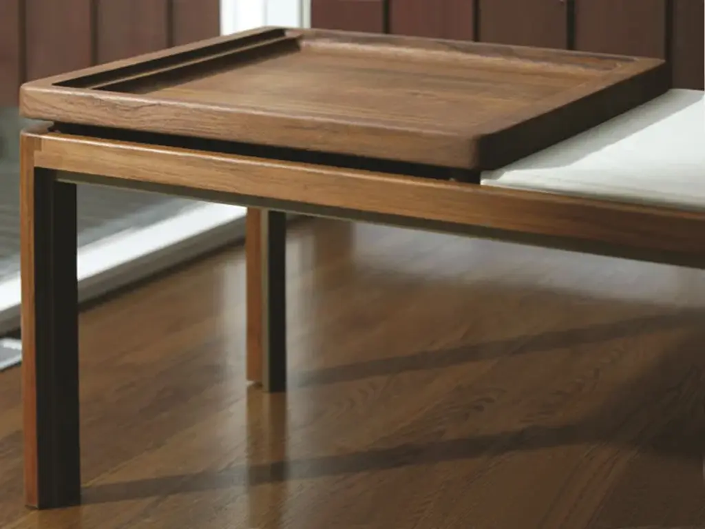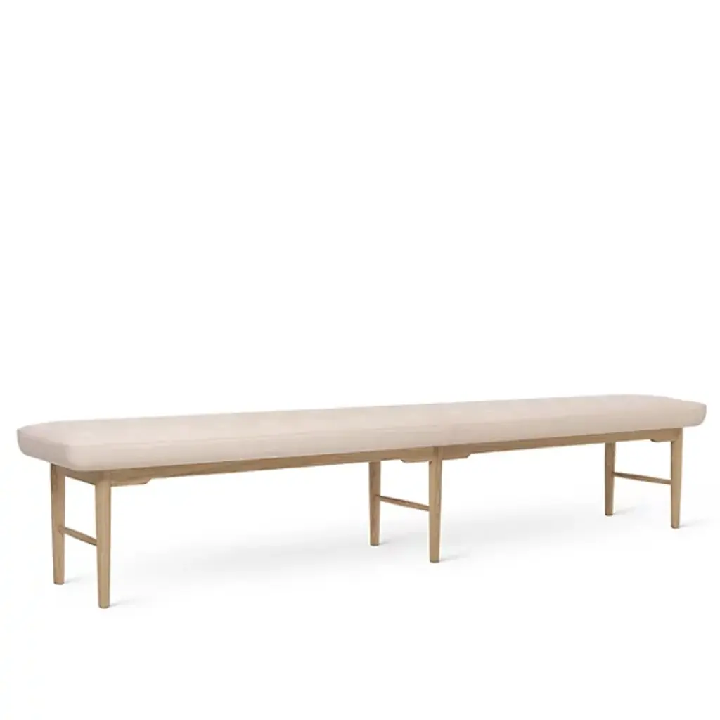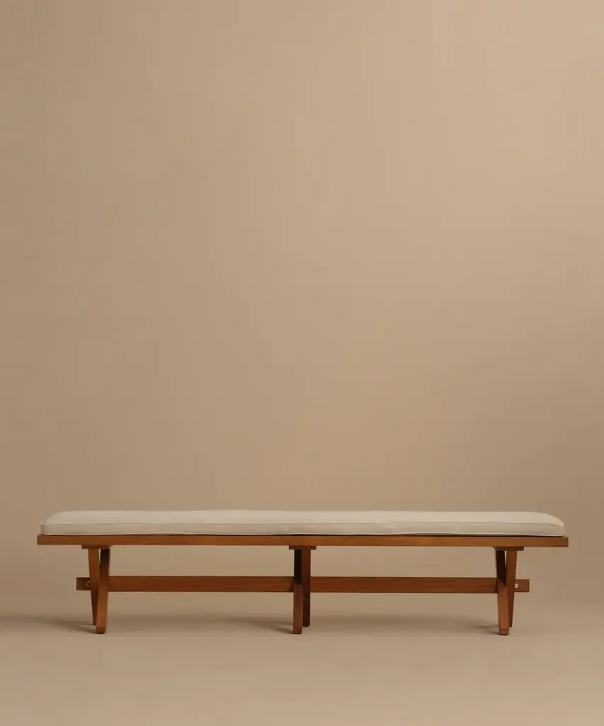 The Museum Bench is a solid wood bench buttressed by a solid brass inner frame. Cushion available in different lengths and can be combined with the CB-12 Stacking Tray. Materials: Solid Walnut, Oak, Ash, or Ebonized Ash with oxidized brass inner frame. A fresh approach to the classic museum bench, BassamFellows’ version is a sophisticated hybrid, ingeniously constructed using two separate frames, one made in hand-worked brass and the other in solid wood. The inner brass frame buttresses the bench’s generous horizontal span, giving it balance and strength. The design of the Museum Bench allows for multiple configurations. The outer wood frame can hold a seating cushion or tray, depending on the desired use. The bench is fully adaptable in both its traditional function and, when combined with the tray, as an elegant and graciously proportioned multi-use table. Both frames are plainly visible to underscore the piece’s structural integrity and synthesis of natural material. As with all the solid wood elements, precisely keyed joinery details emphasize the luxury of craft. The bench is suitable for both residential or contract use – including high use areas.