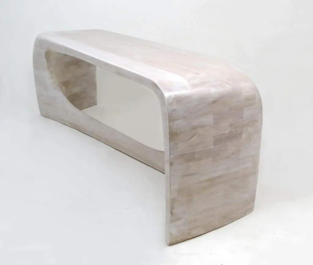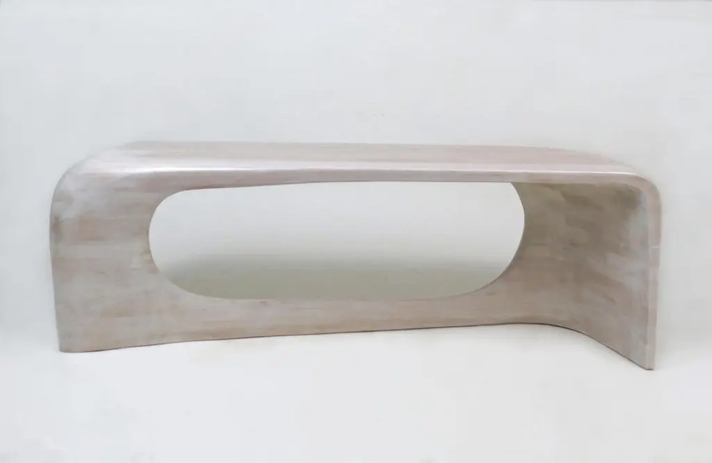 N2V Bench by Aaron ScottDimensions: D 34.5 x W 122 x H 41 cmMaterials: bleached cherry.Also available in other woods: lacquered cherry, bleached walnut, walnut. Brooklyn-based designer Aaron Scott was raised in the mountains and forests of Southwest Oregon. He studied philosophy at the University of Colorado,Boulder, followed by fine art at the San Francisco Art Institute. Since moving toNYC in the late 90s Scott has worked in a variety of mediums – film, sculpture,writing and furniture design. Drawing inspiration from nature, science andmathematics, Scott’s work explores relationships of space, light and movement.Using a meticulous, labor-intensive process that relies on the hand and the eye, improvisation and experimentation, Scott has developed a body of sculptural furniture characterized by complex geometries, rotational symmetry and unconventional engineering. Since the early 2000s Scott’s furniture has been built using the stacked-laminate method – a technique that relies on the careful laying-out of alternating grain patterns on parallel pieces of wood, overlapped in successive layers. The process is both additive and subtractive. In the first stage the rough form is built by stacking glued-up layers, each corresponding to a given point on the x, y or z axes. These layers, laminated together in a stair-like or topographical form, are then sculpted with handheld power tools to obtain the final, smooth surface. With each new piece Scott attempts to push the boundaries of the medium of wood and his own imagination, posing and re-posing the question to himself: Which parts of the form are essential and which can be removed?.