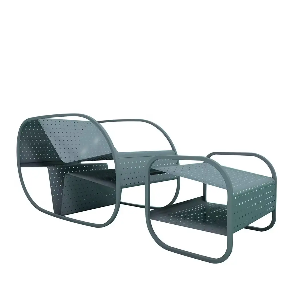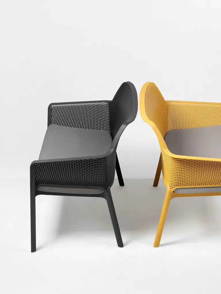 A romantic and inviting two-seater outdoor bench, Net Bench makes a statement with its elegant design, clear-cut lines and narrow profiles.Net Bench, made of non-toxic, antistatic and 100% recyclable fiberglass resin with a matt finish, features a perforated mesh pattern.Easily stackable and with non-slip feet, it's ideal for outdoor and indoor use.Bench color: anthraciteAccessories: cushionCushion color: Denim