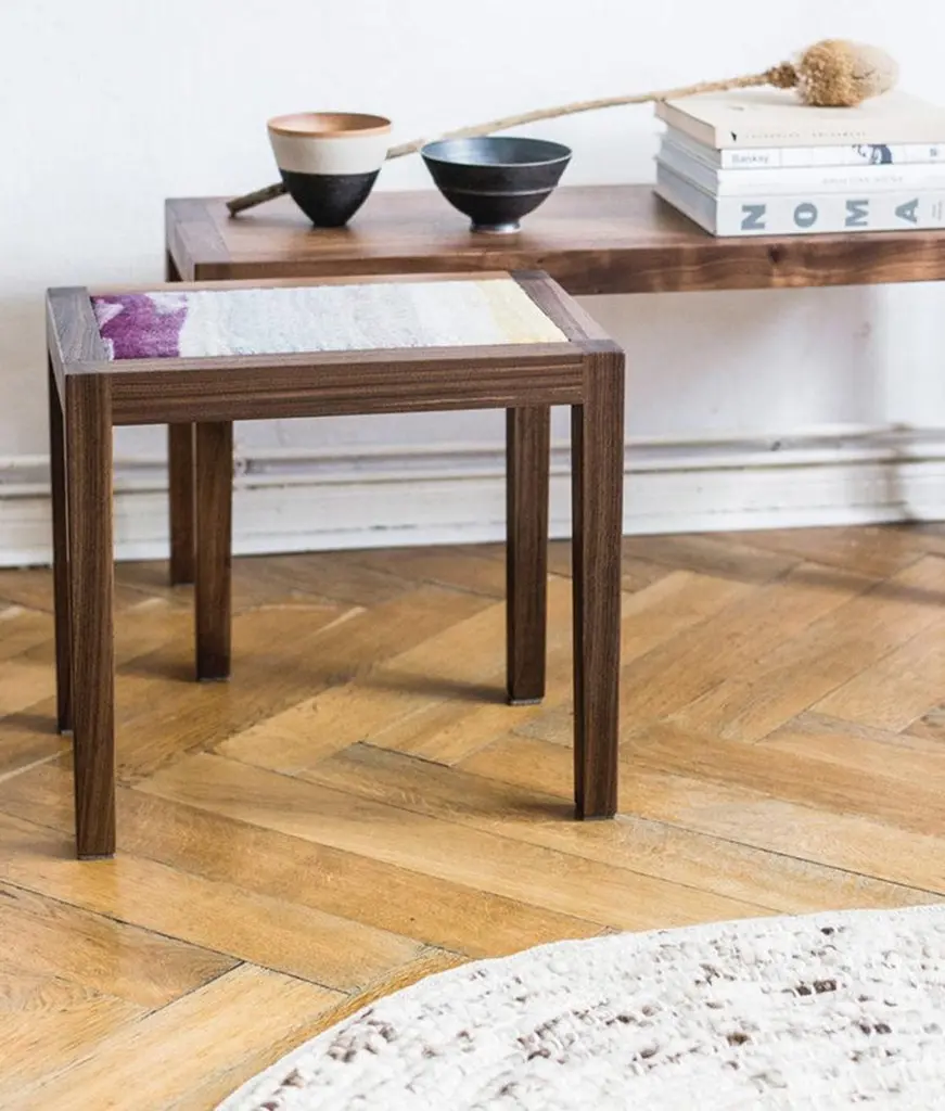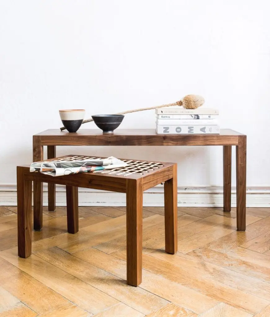 Natú Bench by Frau CazeDimensions: D 34 x W 100 x H 44 cm.Materials: Oiled walnut.Stool Natú appears in a variety of costumes and sizes.Its construction of walnut, cherry, or oak combines with wooden seating or soft fabric seating.Although Berlin has been her home for many years, Carolin – the designer behind Frau Caze, with “Caze” being a fusion of her first and last name – has never been one to stand still. She has traveled the world relentlessly in search of inspiration for her work. These travels have greatly influenced her unique sense of atmosphere and texture, as well as her concern for our planet – Frau Caze places a great emphasis on sustainability, quality, and functionality.Currently, Carolin splits her time between Berlin and Lake Constance, and has devoted herself to furniture and interior design ever since studying design at the FH Potsdam and the Escola Superior de Desenho Industrial in Rio de Janeiro until 2012. Founding Frau Caze in 2016, her work pays tribute to her love of natural, high-quality materials as well as sustainable, responsible craftsmanship – including ethical treatment of all people involved in production.