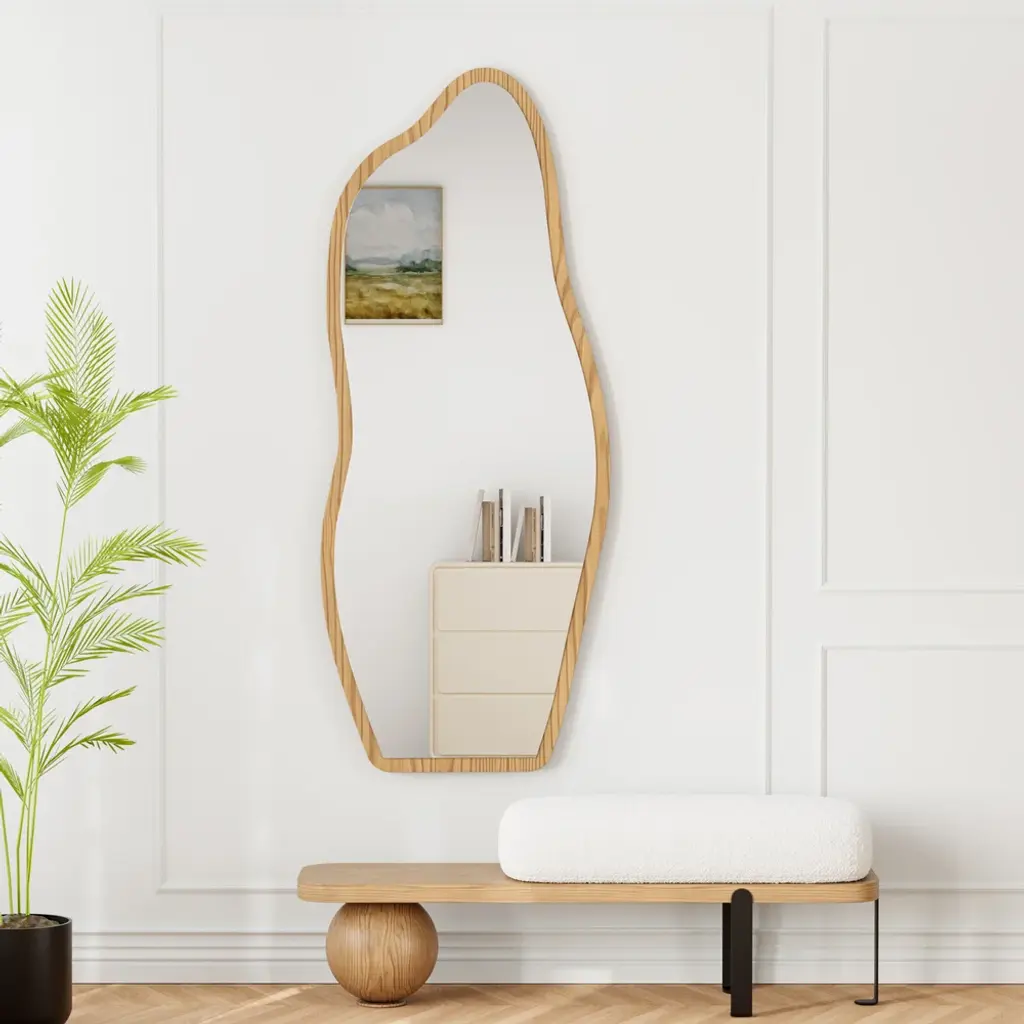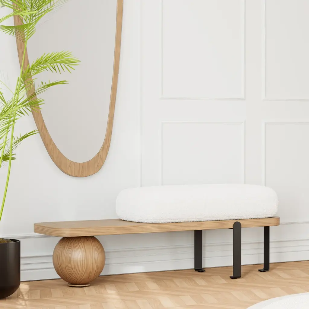 This contemporary luxury bench is upholstered in white bouclé and features a Fleece cushion with a natural wooden seat. The abstract geometry of its metal legs gives clean lines and unique design. Perfect for toys, keys, and sports equipment, it's also a handy place to sit to put on or take off your shoes.
