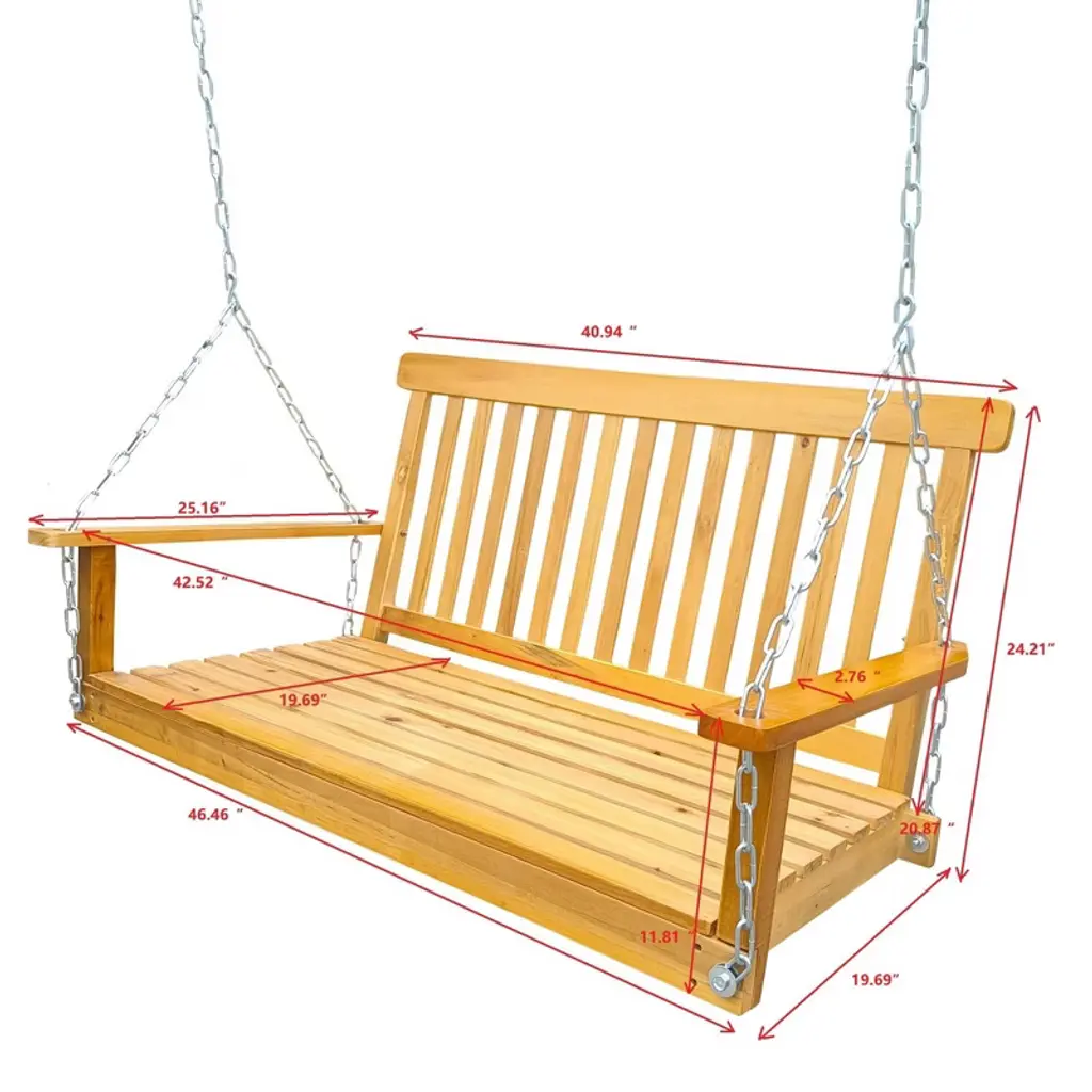 Enjoy the outdoors with the NAYSAYE Patio Swing Wooden Bench Swing. Crafted from durable fir wood, this swing features a wide seat with armrests and a high 800 lbs weight capacity, perfect for two people to relax together. The zinc plated hanging chains are rust resistant and provide secure seating. The wood is treated with a water resistant varnish, ensuring durability in all weather conditions. Easy to assemble, this swing is ideal for enhancing your porch or patio with comfort and style.