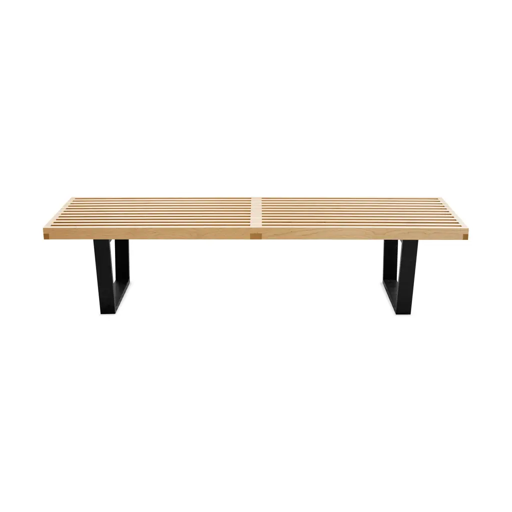 Like much of George Nelson's work, the platform bench has clean, rectilinear lines, reflecting his architectural background and insistence on making an honest visual statement about an object's purpose. Ideal for bench seating or as a low table, the Platform Bench is made of a solid maple slatted top with lacquered solid wood legs, finger-jointed for superior strength. A versatile piece, it is appropriate for a variety of uses throughout the home or office. Made by Herman Miller®.