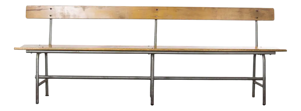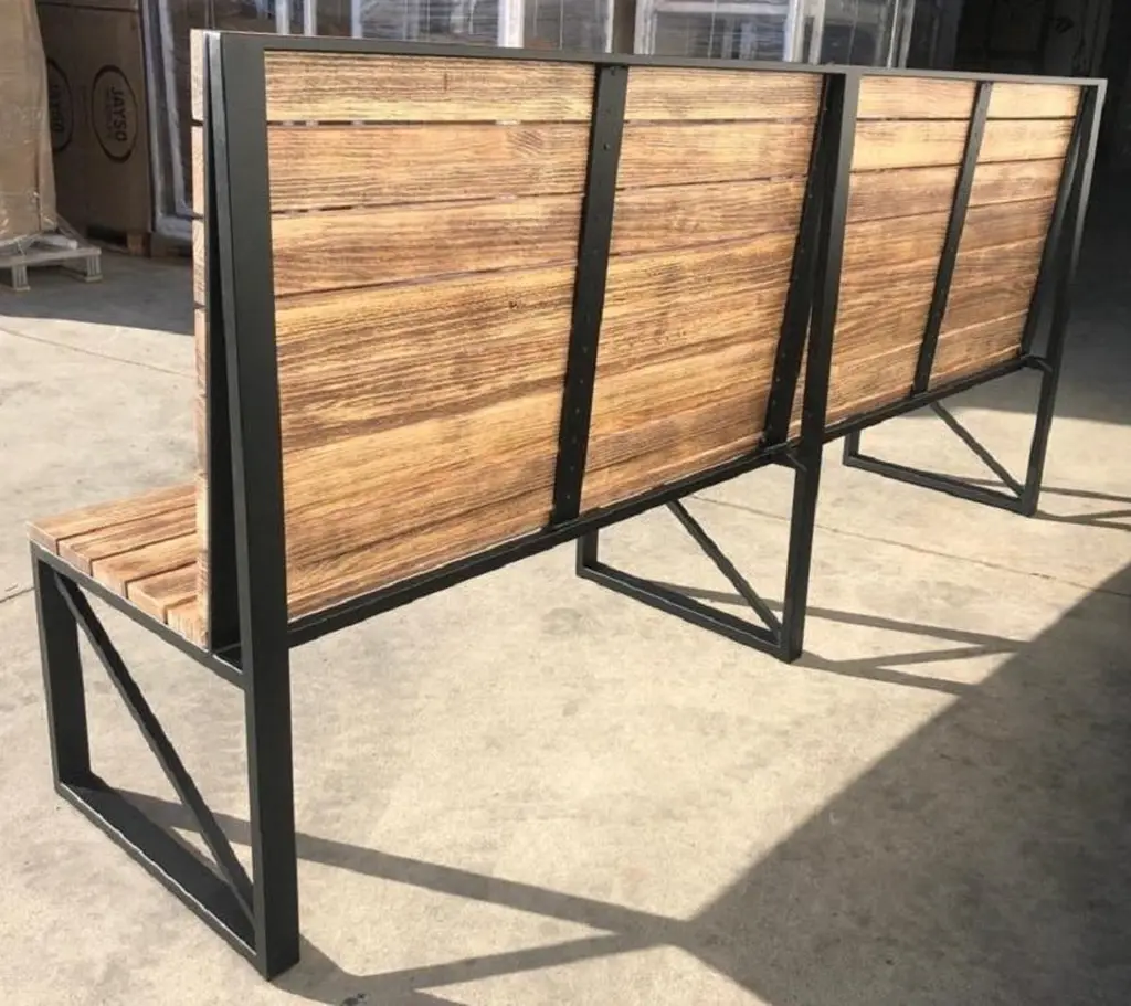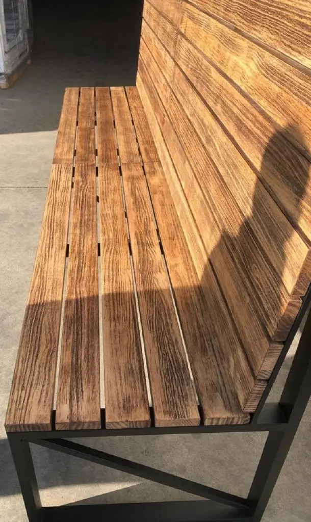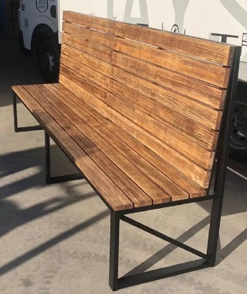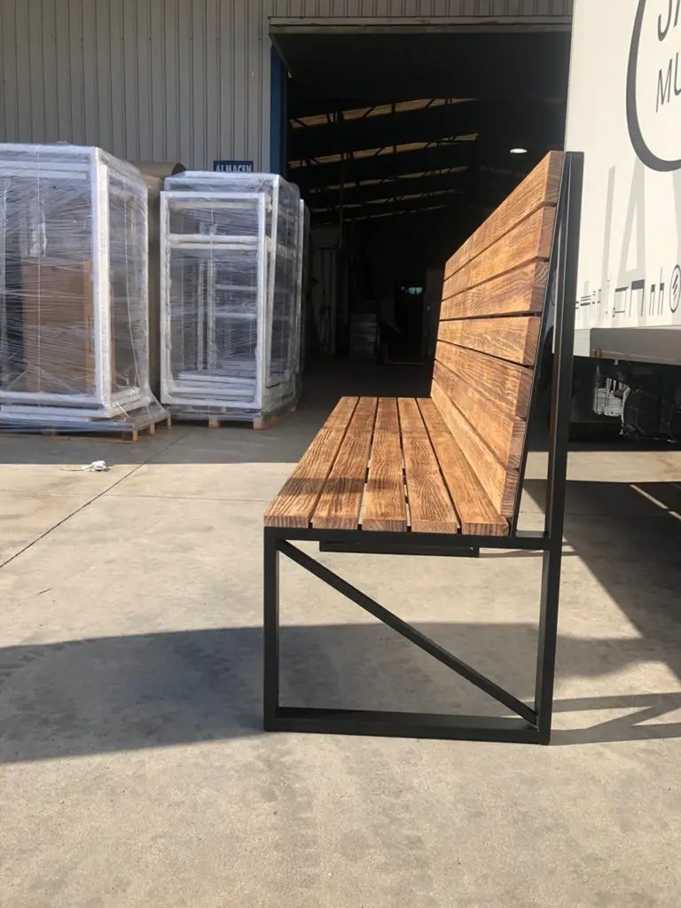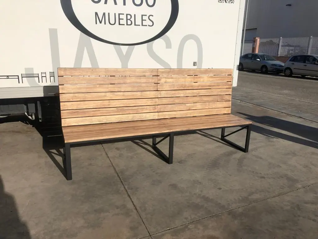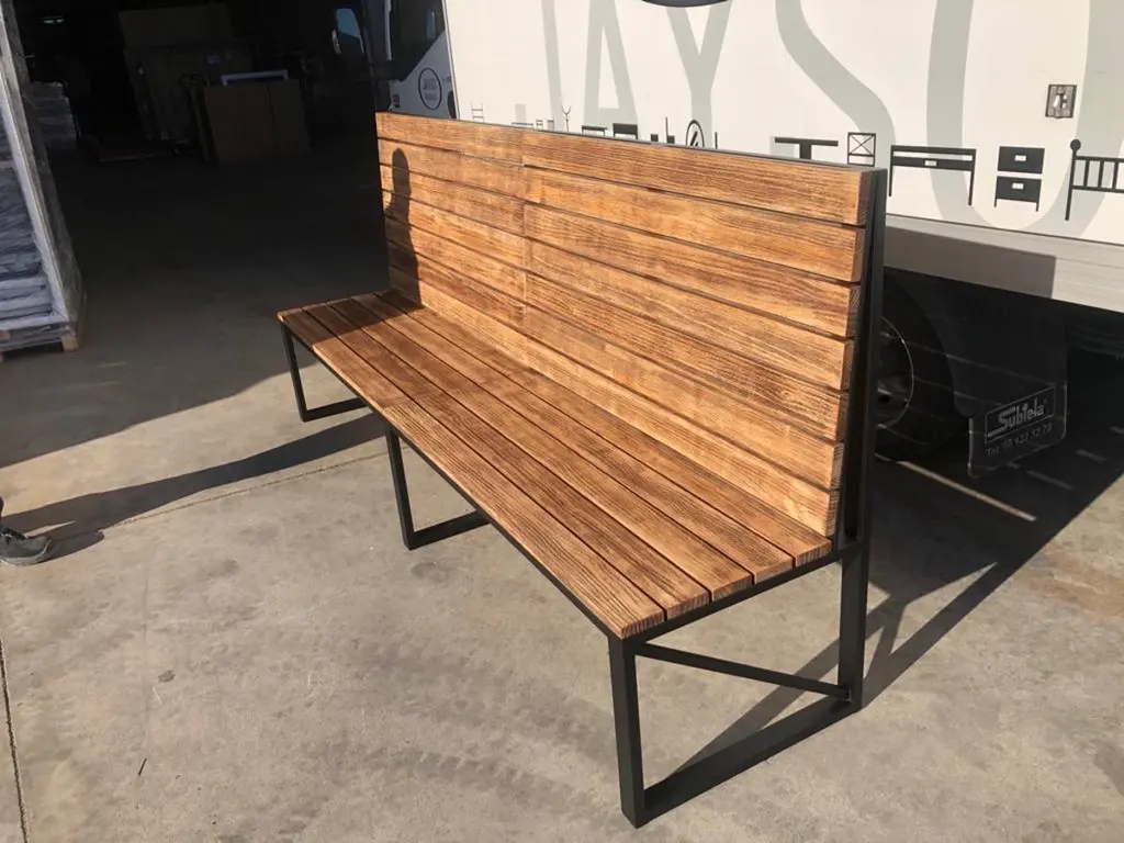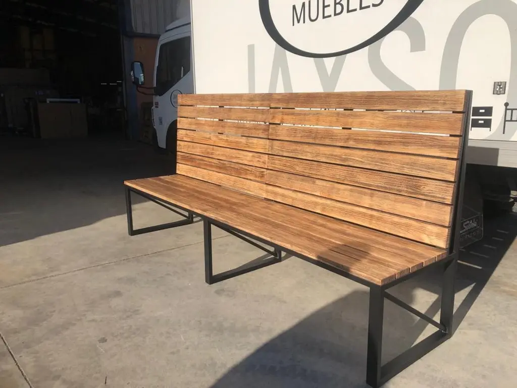 New park or garden bench in iron structure with wood slabs. Indoor and outdoor.
