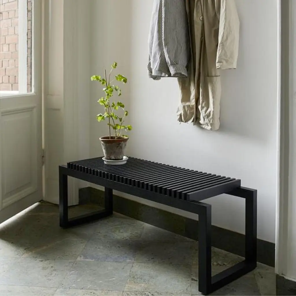 Niels Hvass outdoor 'Cutter' bench in black stained oak for SkagerakSkagerak was founded in 1976 by Jesper and Vibeke Panduro, who took inspiration from their love of Scandinavian design and its rich tradition. The brand emphasizes sustainability by using responsibly sourced materials and production methods that minimize waste and reduce environmental impact. Each piece of handcrafted furniture is designed to age with grace and last for generations.The Cutter bench was originally designed for an exhibition called Walk the Plank. Here, inspired by the German Bauhaus movement, the idea of a slatted seat on a coherent frame came to life. The minimalist design is effortless in its expression and does well in most indoor and outdoor settings. Available in choice of FSC certified teak, natural oak or oak stained black and fabricated to the exacting standards of Skagerak.Price per item. Available to order in unlimited quantities. Available in a teak, natural oak, or black stained oak finish, as well as with an optional stool - please see our other listings. This listing is for the 'Cutter' bench in black stained oak.In stock lead time 2-3 weeks. Out of stock lead time can be an additional 3-4 weeks, or longer. Lead times and stock availability are subject to change at any time and without notice. Please inquire for current lead times prior to placing time sensitive orders.Made to order.All sales final.