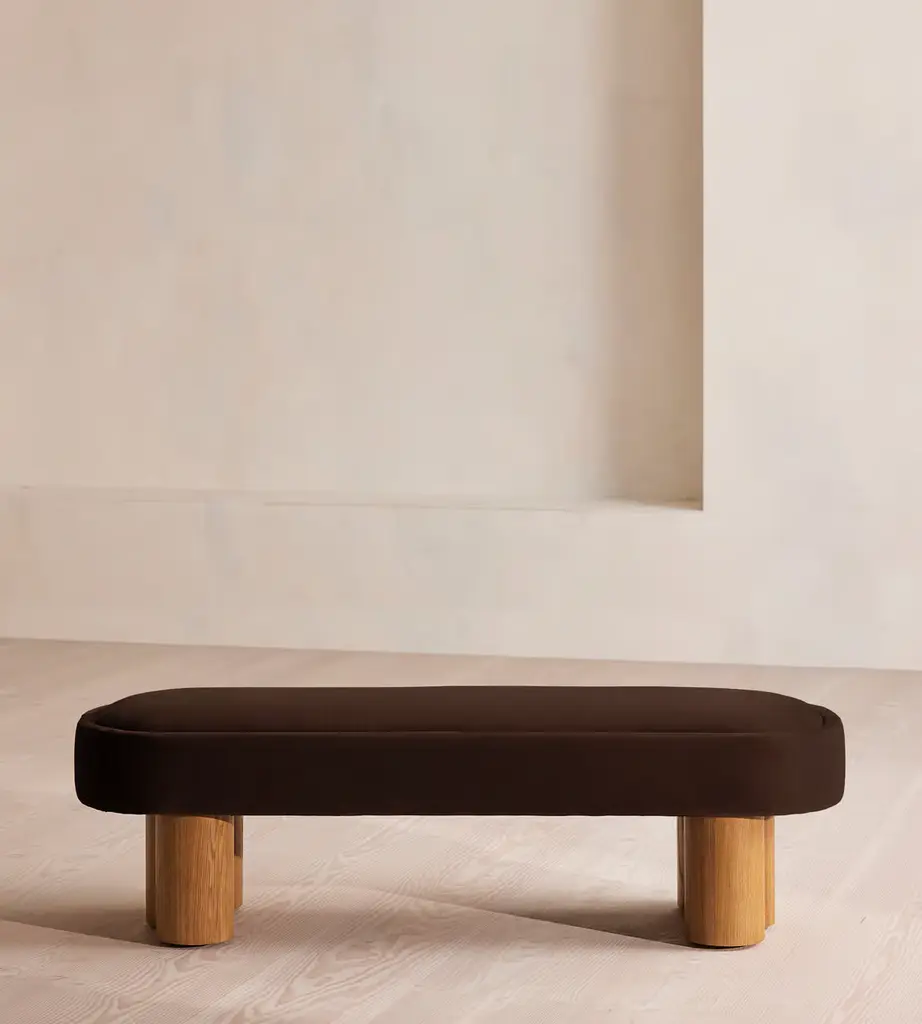 Ideal for placing in the hallway or at the end of your bed, our Nieve bench has been crafted using a solid oak frame. A fully upholstered velvet seat adds rich tones and rests on four oversized cylindrical legs for a contemporary twist.