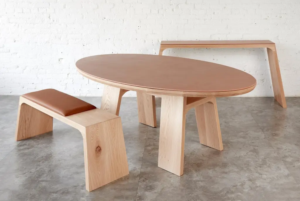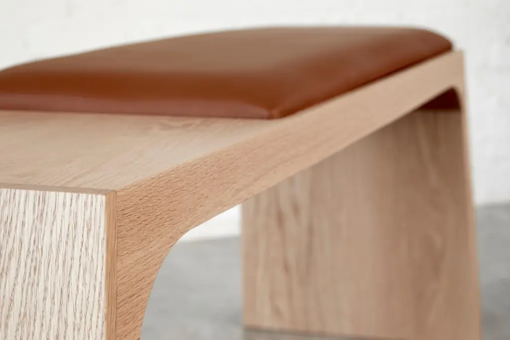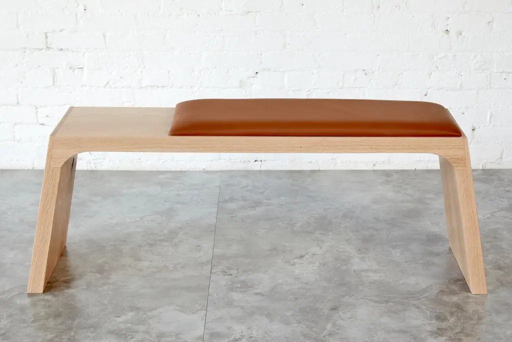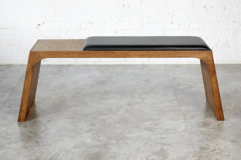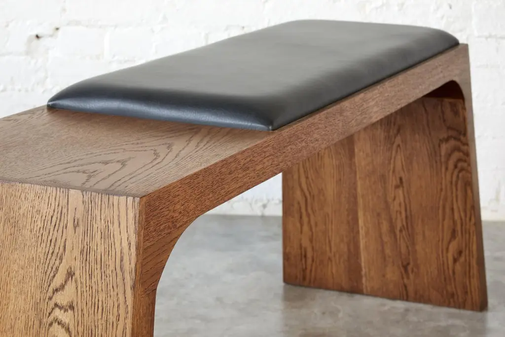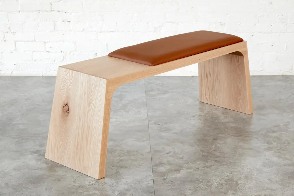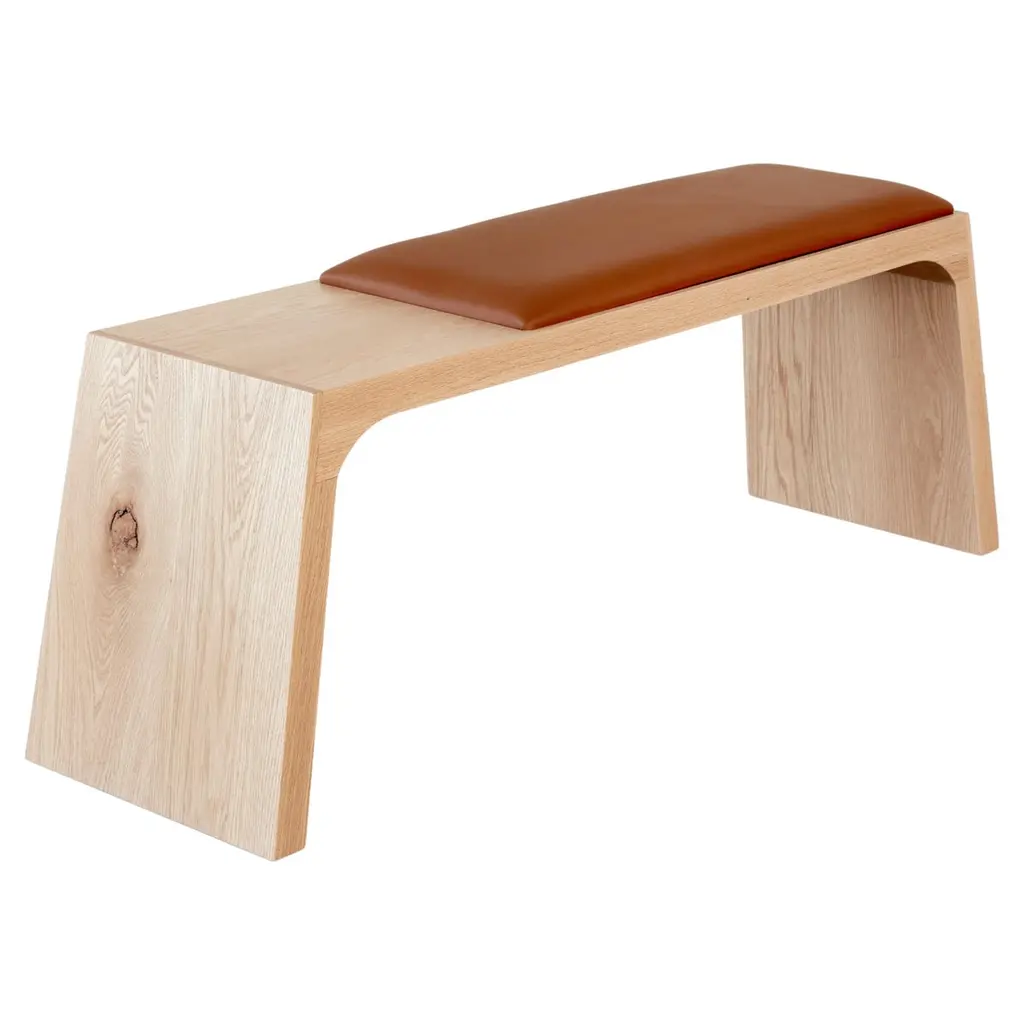 The Nieves Bench is a labor of love years in the making, it embodies our designer Kirk Van Ludwig's relentless pursuit of beauty and functionality. In fact, the Nieves bench has been on the books for years long before the table and console came to light.Crafted from solid White Oak, the natural tobacco-tinted oil and wax finish not only enhance the wood's natural beauty but also serves as a gentle reminder of the simplicity and elegance of days gone by.But it's the details that truly set the Nieves Bench apart. The offset positioning of the leather seat, discovered serendipitously during a chance encounter with a classic car upholsterer, adds a touch of luxury and sophistication. Whether used as a resting place for a morning coffee or a quiet spot for contemplation, the bench invites you to linger, to savour the moment, and to look good while doing so.The Nieves Bench defies convention, challenges expectations, and reminds us of the enduring power of design to inspire, to delight, and to endure.Specifications:45" Long x 13" Depth x 18" High (Height to top of cushion: 19.5"). Leg placement: 51.5" Long x 15" Depth.White Oak with tobacco-tinted oil and wax finish. Available in any of our wood species (Black Walnut, Whitened Ash, White Oak, Blackened Oak).