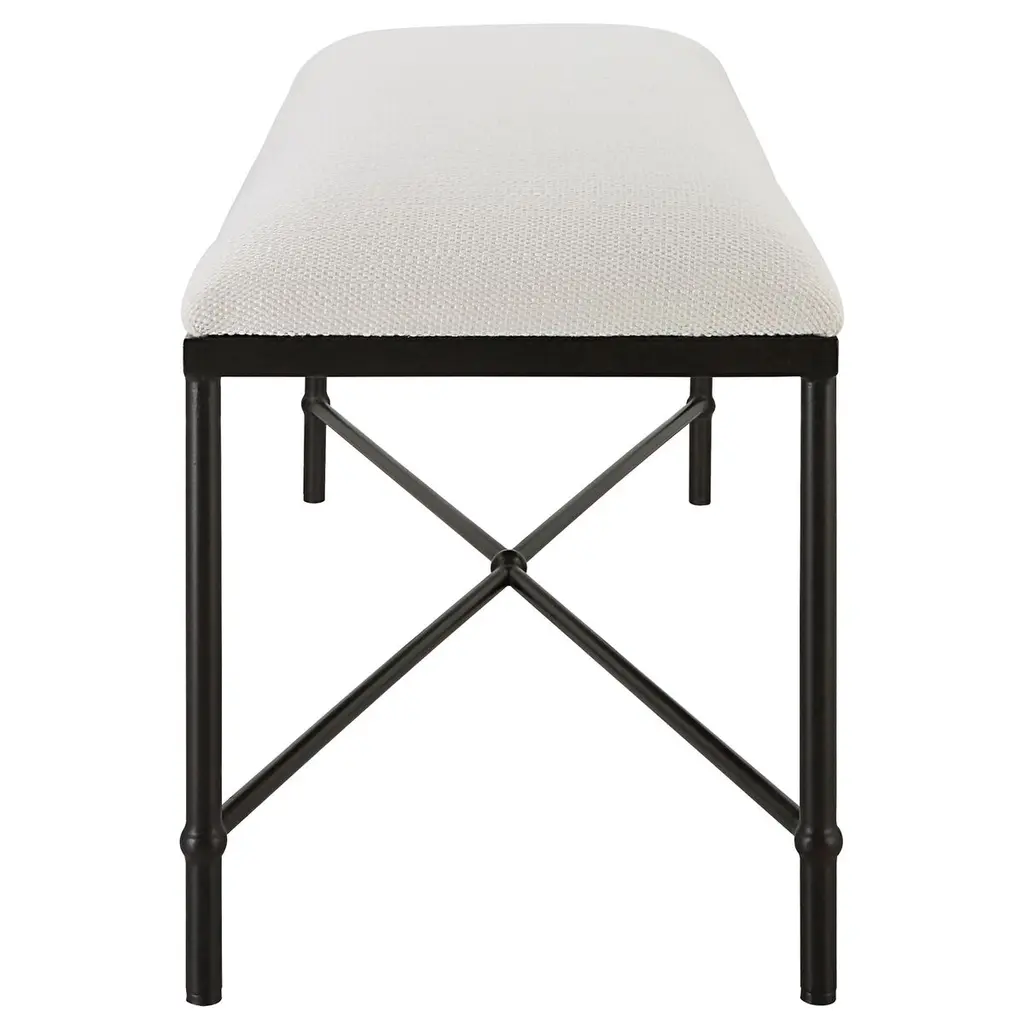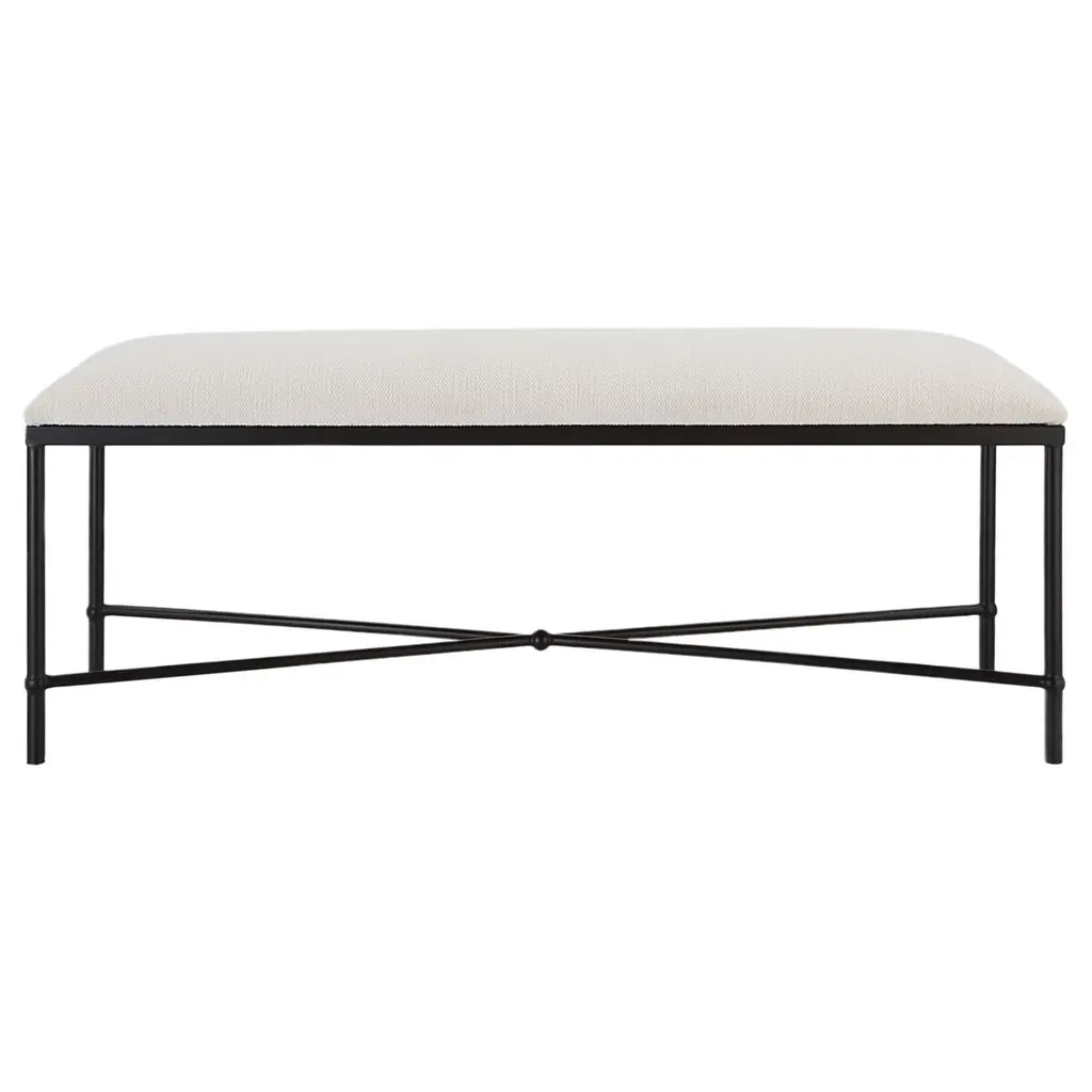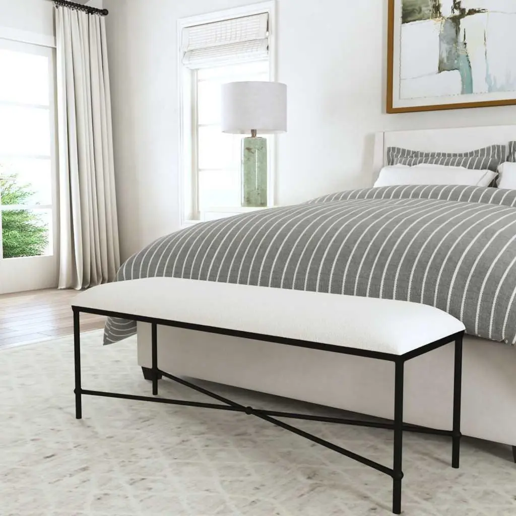 The Nikolai Bench is a harmonious blend of modern sophistication and classic elegance. Its design is a testament to timeless style, featuring a sleek iron frame that exudes a sense of strength and grace. The upholstery, a crisp white textured fabric, adds a touch of purity and refinement, inviting you to sit and linger. This bench is not just a piece of furniture; it's a statement of taste and an invitation to experience the beauty of well-crafted design. Whether placed in a grand hallway or a cozy nook, the Nikolai Bench promises to be a cherished addition to any space, offering both functionality and a romantic allure that captivates the senses.