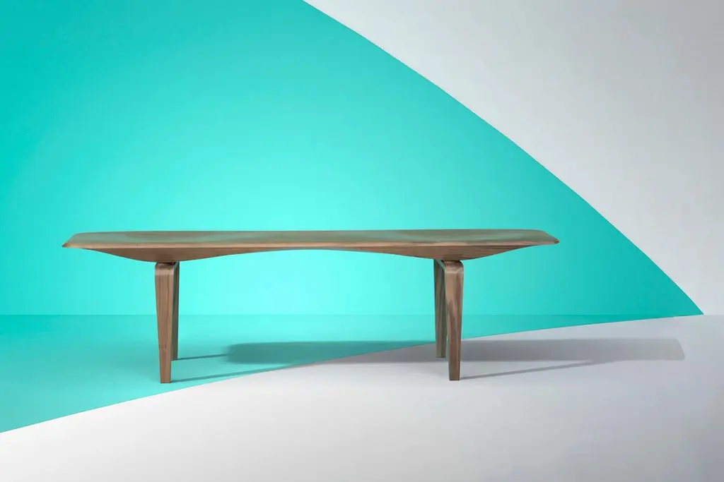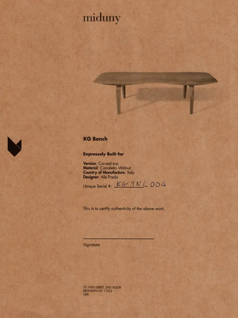 Listing for European Client. Named 2018 Best of Year Awards Honoree by Interior Design Magazine. KG bench merges mannerism with engineering. Carved out of the finest solid Noce Canaletto (Black Walnut), the sinuous arched profile goes from mysteriously thin to substantial in a continuous swoop. The material has a beautiful straight grain and a light brown color emphasizing the piece's unique geometry. KGB comes in two versions: the one depicted in this listing has a carved top, which invites seating. It's also available with a flat top, ideal for using the surface as a low table. KG Bench was originally designed as a gift to celebrate the union of two special friends. The first specimen of the bench was delivered to the "newly" weds some two years after the wedding at Miduny, we believe there are no shortcuts for good design.Designed in Brooklyn by Italian-born architect Ale Preda for Miduny, this artisanal product is made in Italy by master craftsmen. The thick slab of solid black walnut made from 3 full-length boards is carved for several hours on a 5-axis CNC machine, hand-sanded, stained, and finished with a slightly reflective gloss. The legs follow a similar workflow. The overall process takes no less than 25 steps. Each bench features a hand-stamped unique serial number on the underside and comes with a signed “Certificate of Authenticity”.Like all our products, the KG bench is designed for shipping flat inside a custom built box, and minimal assembly is required. This allows shipping to be more efficient and sustainable. Each of the two legs fits into a carved slot and is attached with two countersunk bolts.