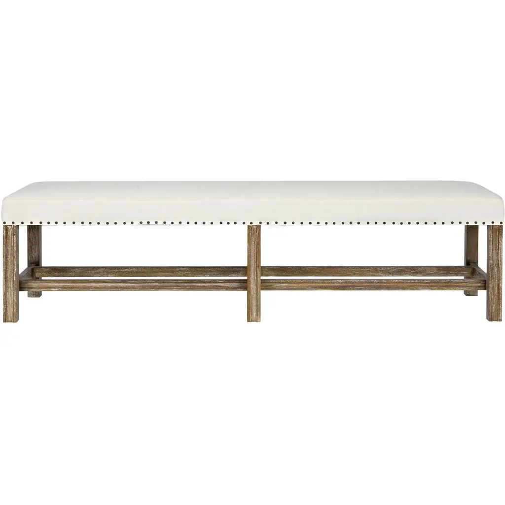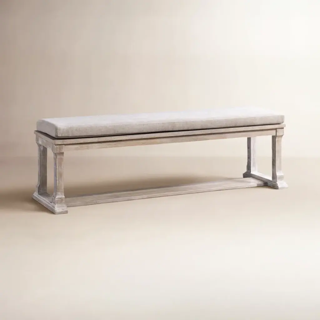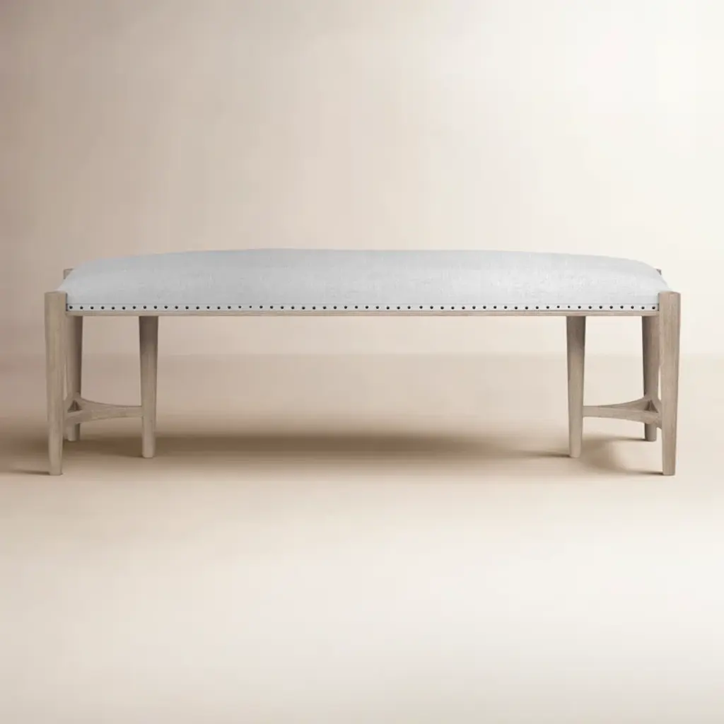The perfect addition to the foot of any bed, this rustic oak bench, pictured in the Dawn finish, stands on tapered oak legs and features a refined upholstered seat.