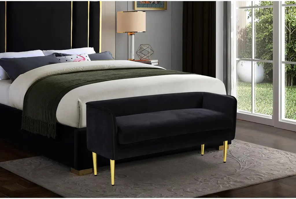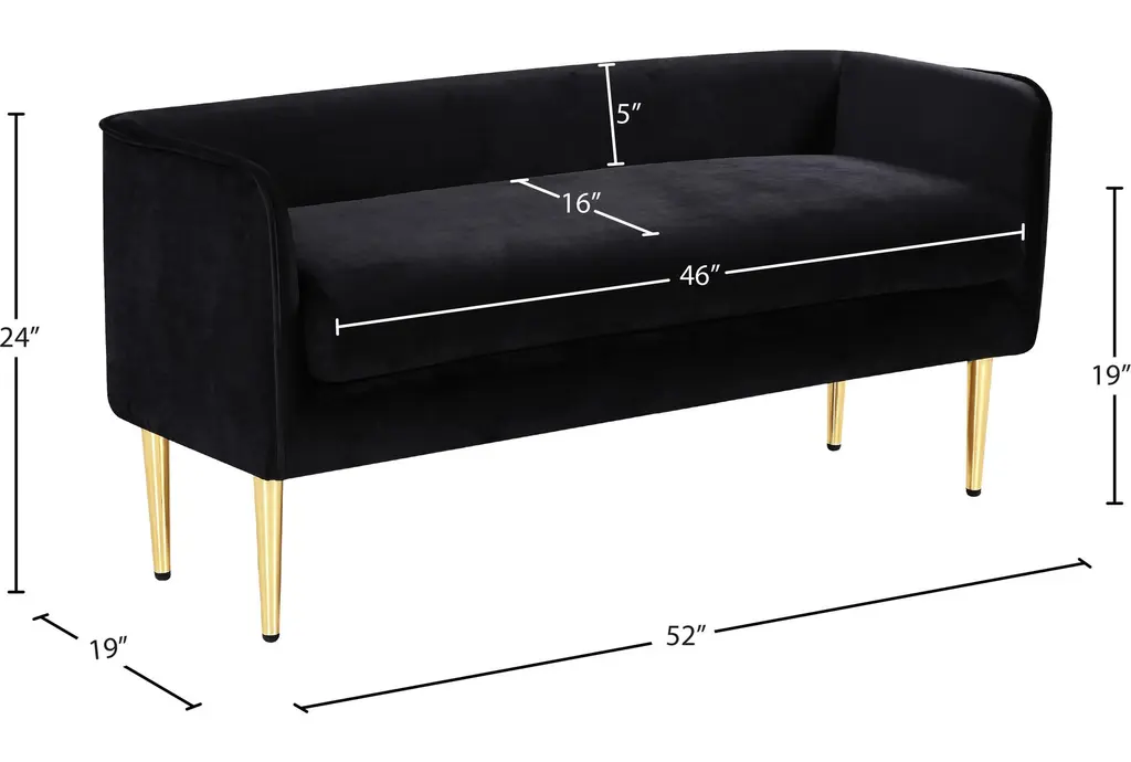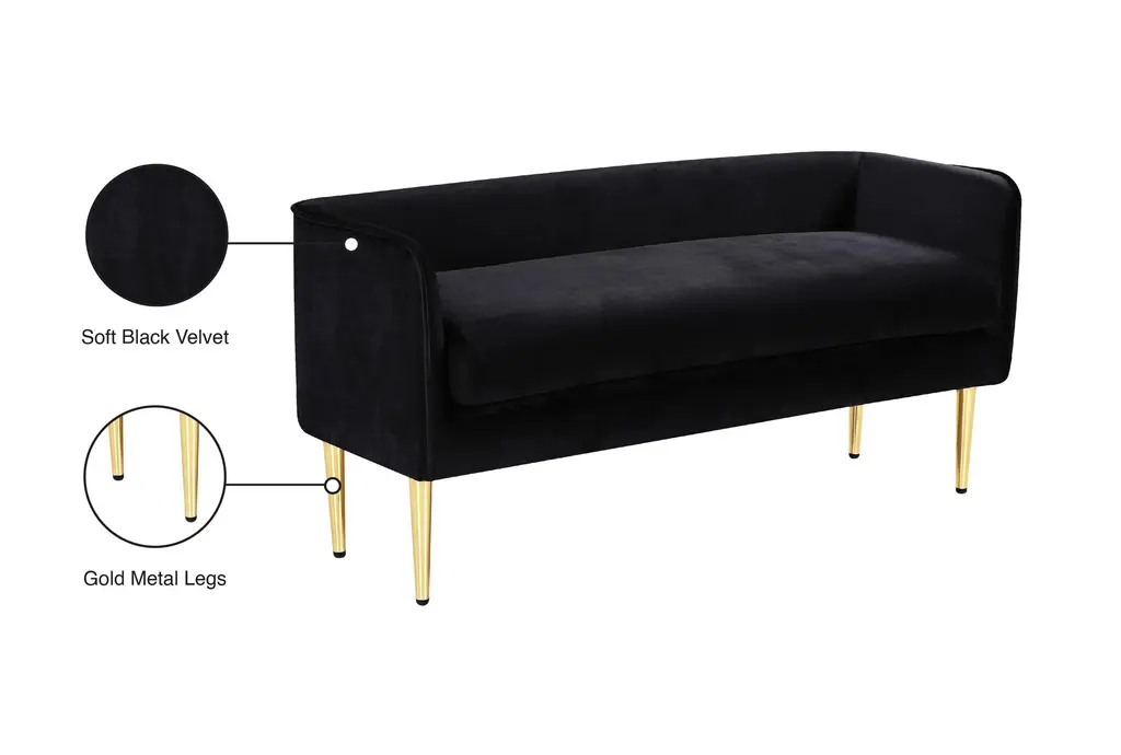 The Nova Black Velvet Upholstered Bedroom Bench brings a touch of modern sophistication to your space. Its luxurious black velvet upholstery offers a plush seating experience, while the sleek design fits seamlessly in bedrooms or entryways. Supported by sturdy metal legs, this bench is both stylish and functional.