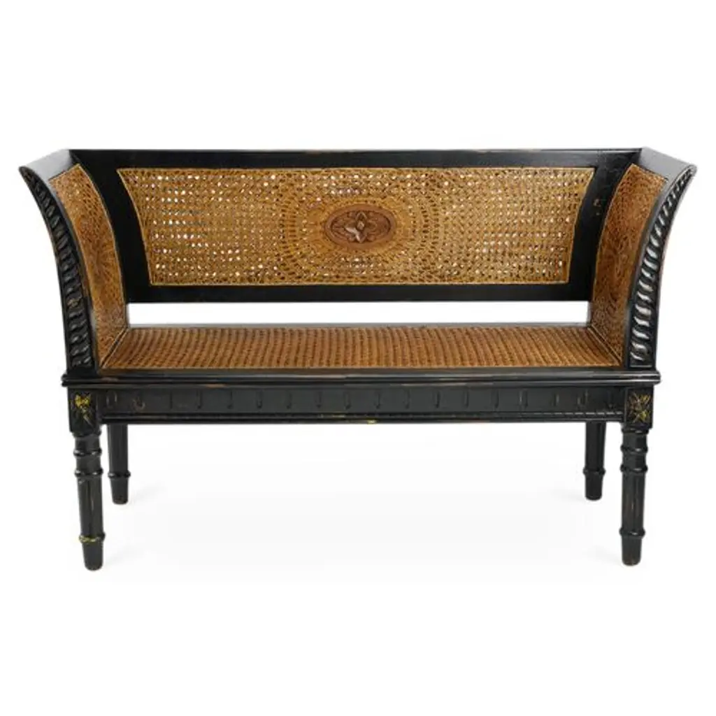 Exclusive to One Kings Lane: This handcrafted settee pairs intricate wicker caning with a frame carved of mahogany, a hardwood prized for both its beauty and its durability. The gently distressed black stain gives the bench the allure of a family heirloom.