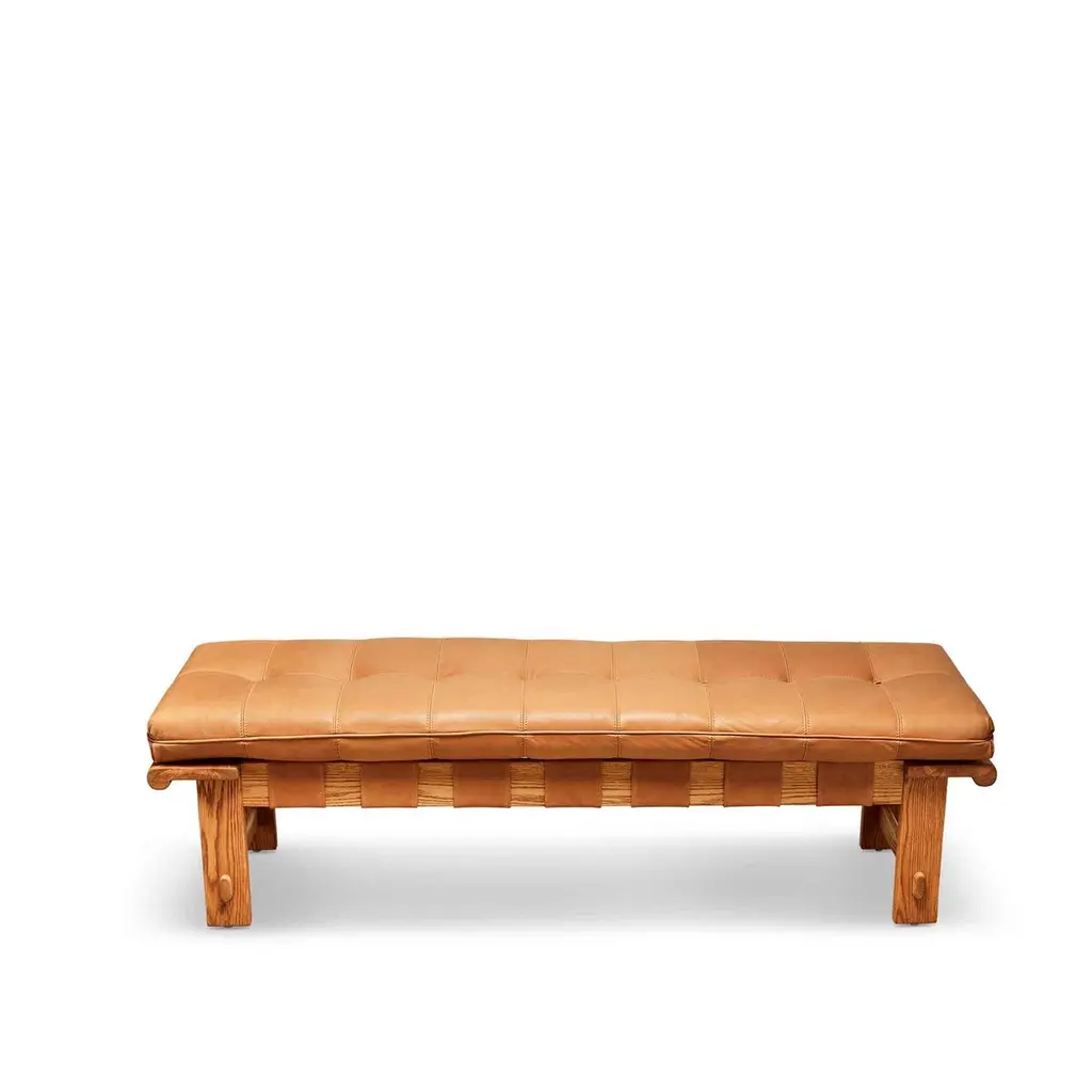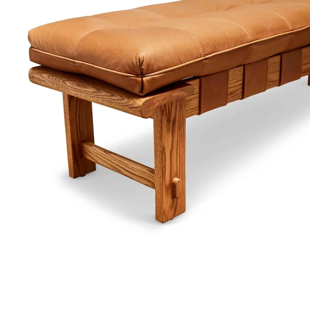 The Ojai bench features a solid white oak or solid walnut base and a tuftedleather cushion with leather straps.