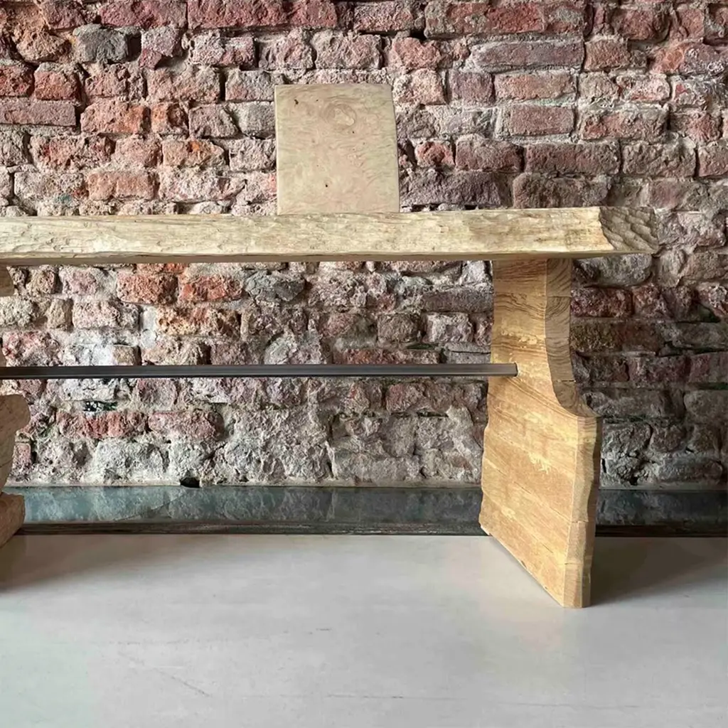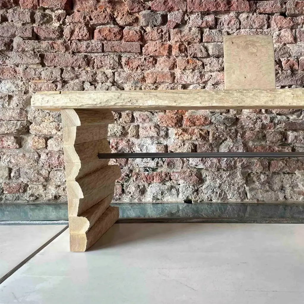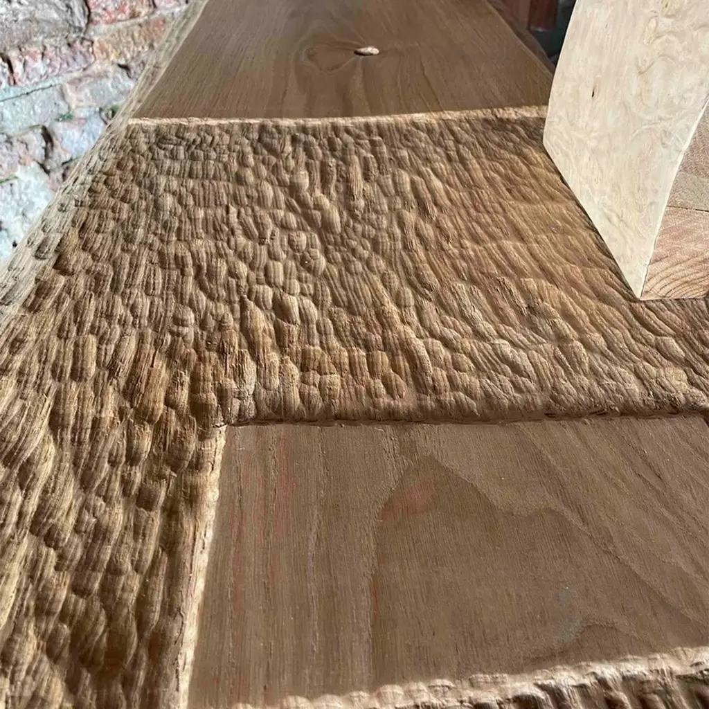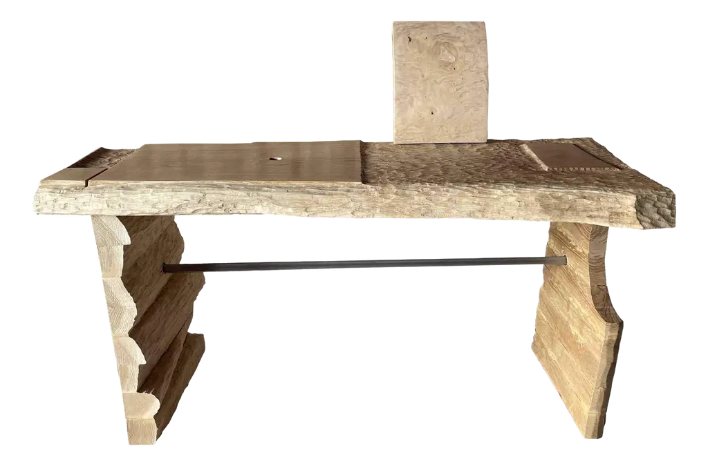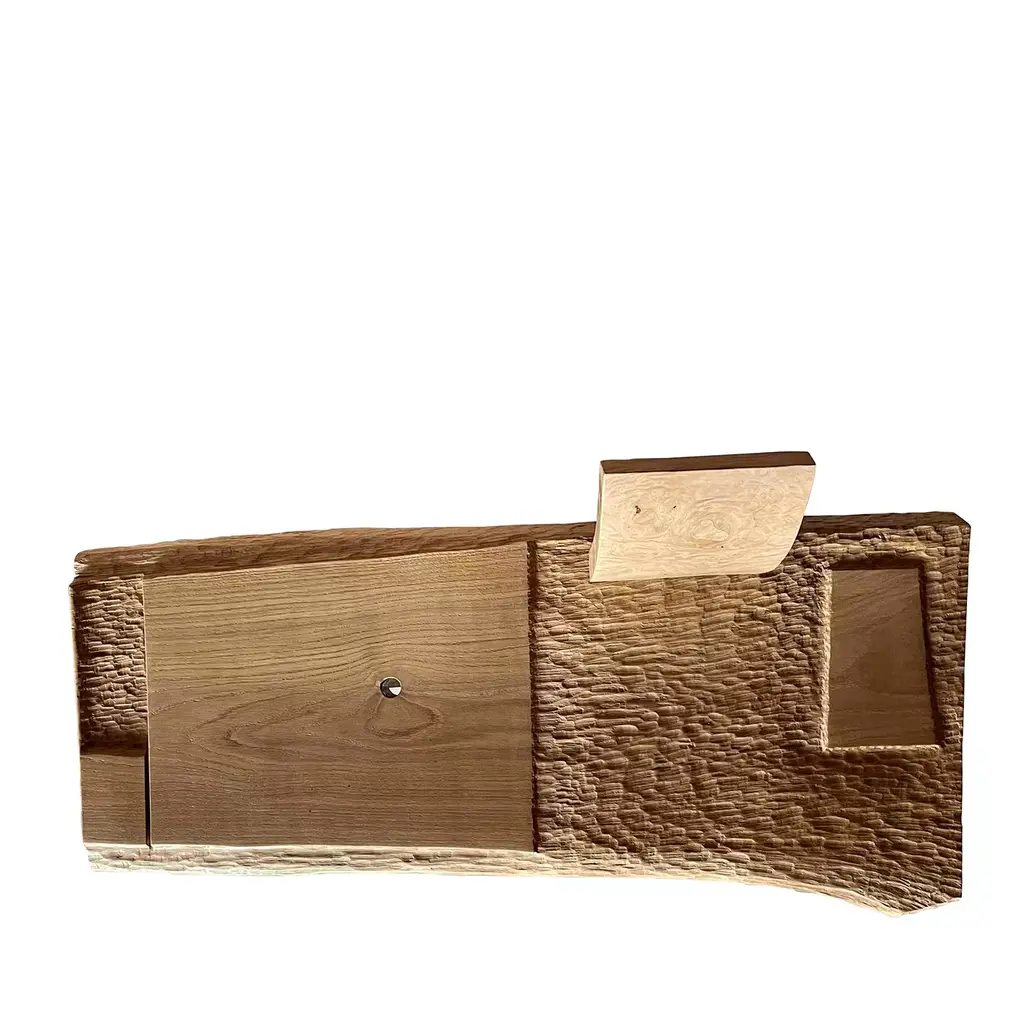 Irregularities and asymmetries define this sturdy wooden bench as a piece of striking artistic impact. Meticulously handcrafted and sculpted by hand, its structure combines oak briar and ash for a contrasting woodgrain that invites the eye to lean on unpredictable natural details. Eccentric and unique, the piece boasts the artist's sign.