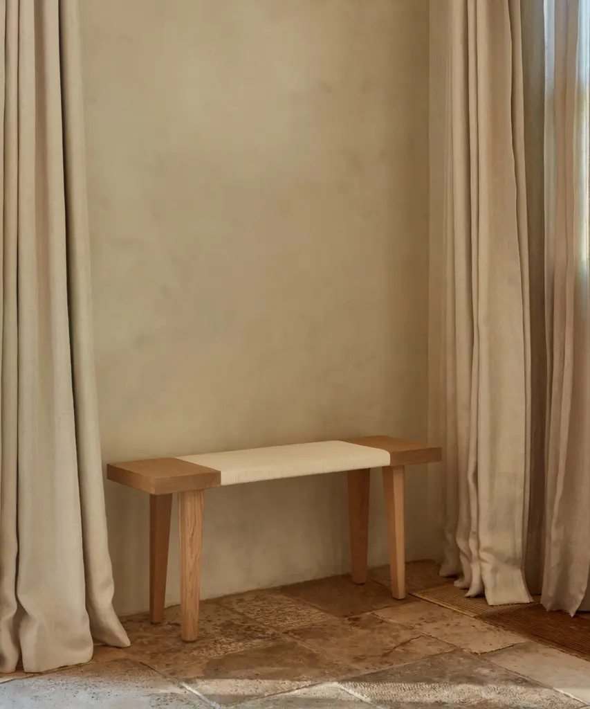 Oak Day Bench Oak Everyday bench made from solid White Oak wood with hand-wrapped white cotton rope—made and crafted in Los Angeles. Solid White Oak wood is durable and hardwearing with a visible natural grain, making it less likely to show signs of wear or damage for a piece that's truly built for the ages. For furniture purchases, please refer to our furniture inspection policy here, and for help styling this piece in your space, contact [email protected] for a complimentary consultation.CA Residents: Prop 65 Information