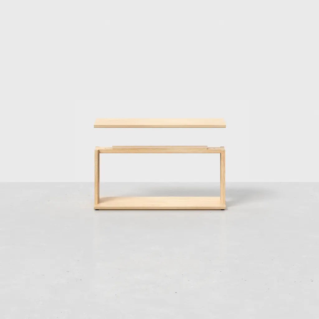Fusing Japanese woodworking techniques with Scandinavian design sensibilities, the simple and sculptural Oblique Bench is made with low living in mind. Taking its name from the tilted angles of the few, yet perfectly placed, elements that make up its construction, this solid oak seat with a natural oiled finish elevates objects when used as a display for books, vases and more, and makes light work of putting on and taking off shoes in a hallway.